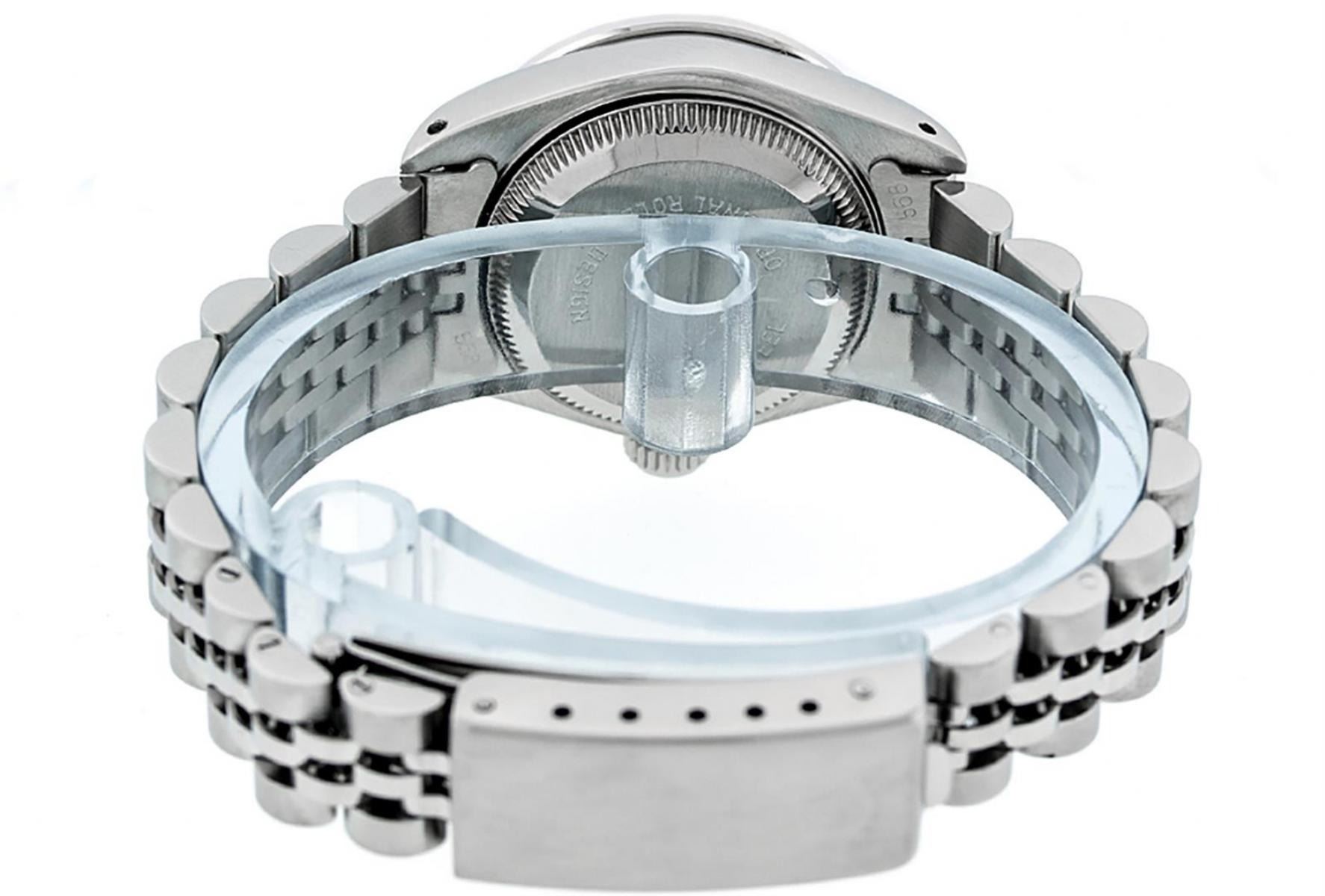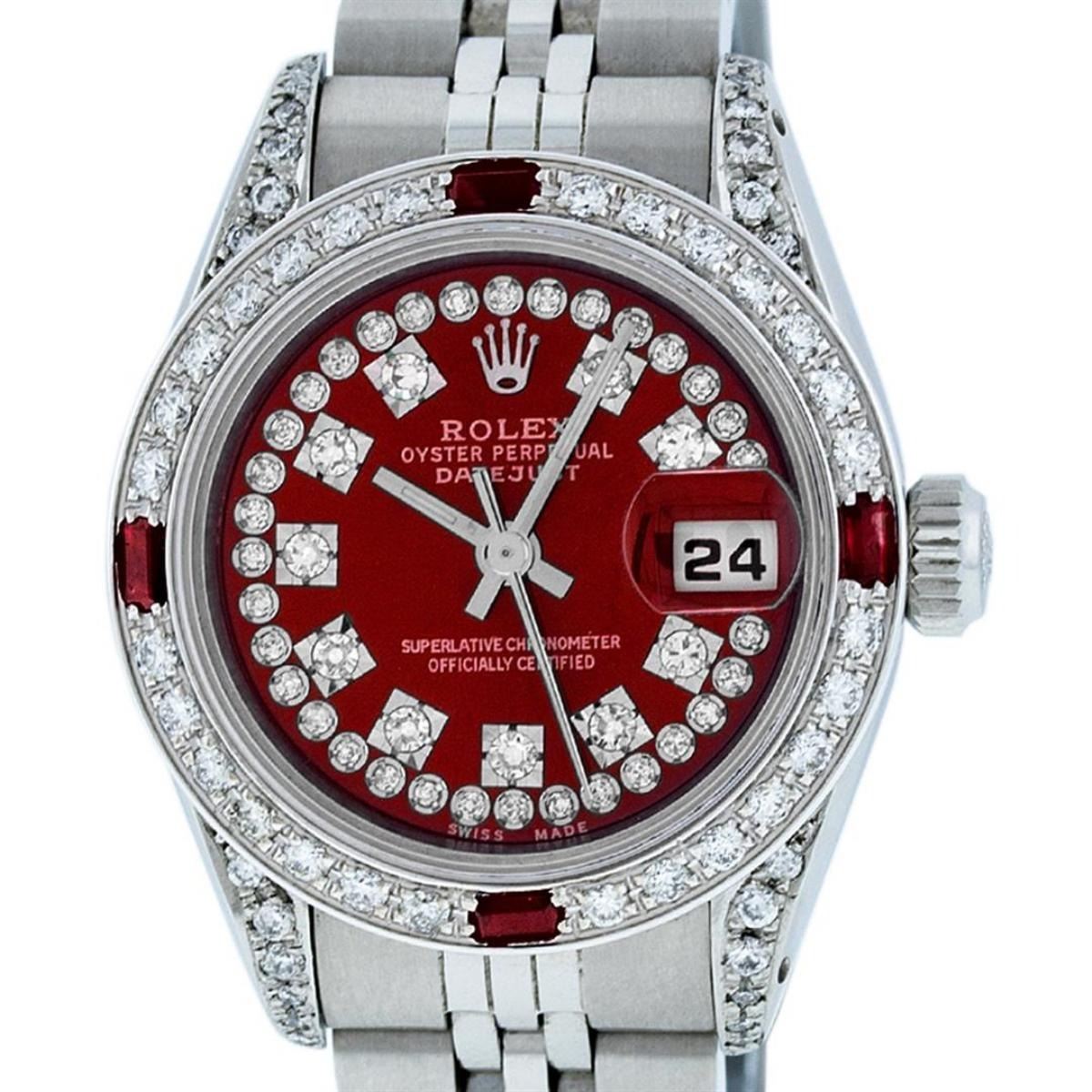 One Ladies Stainless Steel Rolex Datejust Polished Bright with Satin Finish, Serviced & Electronically Tested, Stainless Steel Case: 26mm, Stainless Steel Crown, Diamond Lugs: 24 Diamonds On Lugs, Clarity: SI-VS, Color: G to H. Custom Bezel: New 18K White Gold Diamond + Ruby Beadset Diamond Bezel, Stone Count: 28 Diamonds + 4 Rubies, Total Weight .70 Carat, Clarity: SI-VS, Color: G to H. Custom Crystal: New Scratch Resistant Synthetic Sapphire Cyclops Lens. Custom Hands: New Luminescent Hands. Movement: Automatic Winding Movement. Custom Dial: Refinished Red String Diamond Dial, 43 Diamonds in Dial G To H In Color, Clarity: VS. Date Window: 3 O'Clock Position Date Display, Model: Datejust. Condition: G-6 Extra Fine. Bracelet: Stainless Steel Jubilee Band. Bright Polish & Satin Finish. 6.0 Inch Length, Adjustable. Standard Clasp, With Rolex Logo. This Watch Has Been Serviced Time Tested And Is In Excellent Condition It Is Free Of All Scratches And Dents.