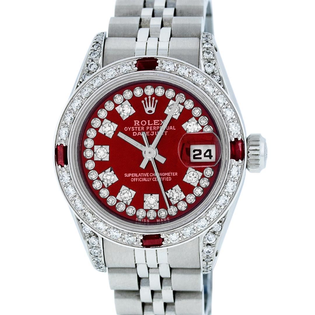 One Ladies Stainless Steel Rolex Datejust Polished Bright with Satin Finish, Serviced & Electronically Tested, Stainless Steel Case: 26mm, Stainless Steel Crown, Custom Diamond Lugs: 24 Diamonds On Lugs, Clarity: SI-VS, Color: G to H. Custom Bezel: New 18K White Gold Diamond + Ruby Beadset Diamond Bezel, Stone Count: 28 Diamonds + 4 Rubies, Total Weight .70 Carat, Clarity: SI-VS, Color: G to H. Custom Crystal: New Sapphire With Date Window. Custom Hands: New Luminescent Hands. Rolex Movement: Automatic Winding Movement. Custom Dial: Refinished Red String Diamond Dial, 43 Diamonds in Dial G To H In Color, Clarity: VS. Date Window: 3 O'Clock Position Date Display, Model: Datejust. Condition: G-6 Extra Fine. Rolex Bracelet: Stainless Steel Jubilee Band. Bright Polish & Satin Finish. 6.0 Inch Length, Adjustable. Standard Clasp, With Rolex Logo. This Pre Owned Watch Has Been Serviced Time Tested And Is In Excellent Condition It Is Free Of All Scratches And Dents.