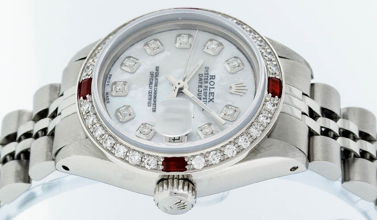 One Ladies Stainless Steel Rolex Datejust Polished Bright with Satin Finish, Serviced & Electronically Tested, Stainless Steel Case:26mm, Stainless Steel Crown, Custom Bezel: 18K White Gold Ruby Beadset Diamond Bezel, Diamond Count: 28 Diamonds + 4 Rubies Total Weight .70 Carat, Clarity: SI-VS, Color: G to H. Custom Crystal: Synthetic Sapphire Cyclops Lens. Movement: Automatic Winding Movement Caliber 2030. Custom Dial: Mother Of Pearl Dial with Diamond Hour Markers. Diamond Count: 10 Diamonds In Dial, Clarity: SI-VS, Color: G to H. Date Window: 3 O'Clock Position Date Display, Model: Ladies Datejust, Condition: G-6 Extra Fine. Bracelet: Stainless Steel Jubilee Band. Bright Polish & Satin Finish. 5.5 Inch Length, Adjustable. Standard Clasp, With Rolex Logo. Watch Has Been Serviced And Polished It Is Free Of All Scratches And Dents.
