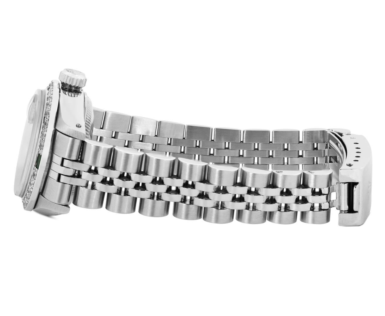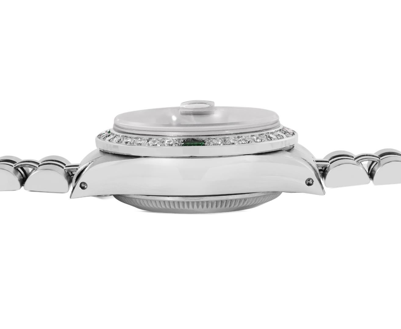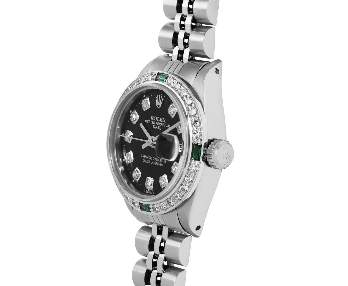 One Rolex Ladies Pre Owned Stainless Steel Date Wristwatch Polished Bright with Satin Finish, Serviced and Electronically Tested, Stainless Steel Case: 26mm, Stainless Steel Crown, Custom Bezel: New 18K White Gold Emerald Beadset Diamond Bezel, Diamond + Gem Count: 36 Diamonds + 4 Emeralds. Custom Crystal: New Sapphire With Magnified Date Window. Rolex Movement: Automatic Winding Movement 2035. Custom Dial: Custom Black Dial With Added Diamond Hour Markers, Dash Tracks, And Lumi Dots. Date Window: 3 O'Clock Position Date Display, Model: Date. Condition: G-6 Extra Fine. Rolex Bracelet: Stainless Steel Jubilee Band. Bright Polish and Satin Finish. 6.0 Inch Length, Adjustable. Standard Clasp, With Rolex Logo. This Watch Has Been Serviced Time Tested And Is In Excellent Condition. It Is Free Of All Scratches And Dents.