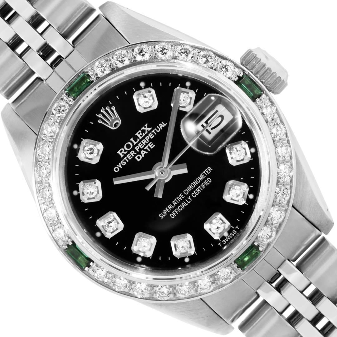 One Rolex Ladies Pre Owned Stainless Steel Date Wristwatch Polished Bright with Satin Finish, Serviced and Electronically Tested, Stainless Steel Case: 26mm, Stainless Steel Crown, Custom Bezel: New 18K White Gold Emerald Beadset Diamond Bezel, Diamond + Gem Count: 36 Diamonds + 4 Emeralds. Custom Crystal: New Sapphire With Magnified Date Window. Rolex Movement: Automatic Winding Movement 2035. Custom Dial: Custom Black Dial With Added Diamond Hour Markers, Dash Tracks, And Lumi Dots. Date Window: 3 O'Clock Position Date Display, Model: Date. Condition: G-6 Extra Fine. Rolex Bracelet: Stainless Steel Jubilee Band. Bright Polish and Satin Finish. 6.0 Inch Length, Adjustable. Standard Clasp, With Rolex Logo. This Watch Has Been Serviced Time Tested And Is In Excellent Condition. It Is Free Of All Scratches And Dents.