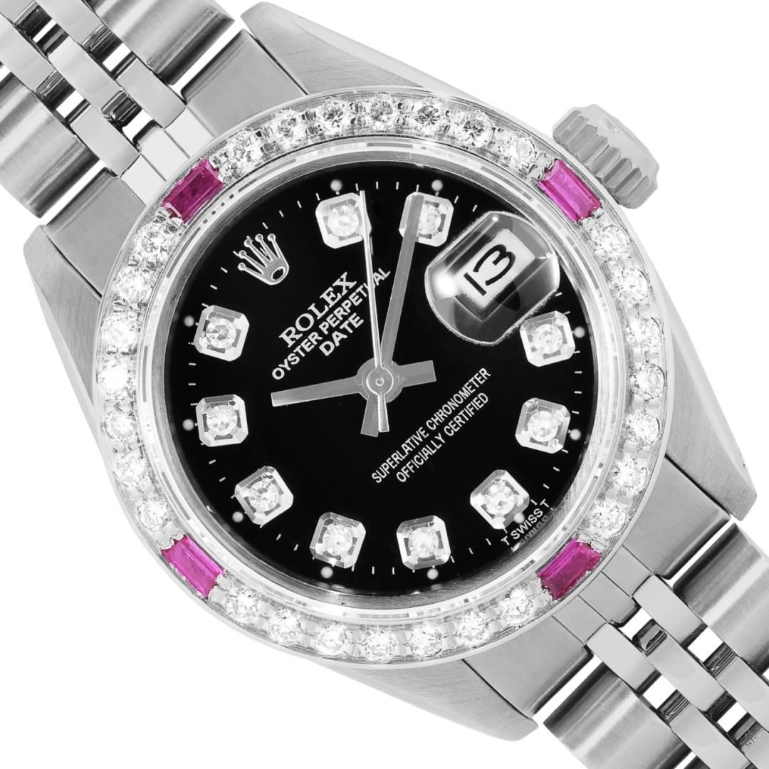 One Rolex Ladies Pre Owned Stainless Steel Date Wristwatch Polished Bright with Satin Finish, Serviced and Electronically Tested, Stainless Steel Case: 26mm, Stainless Steel Crown, Custom Bezel: New 18K White Gold Ruby Beadset Diamond Bezel, Diamond + Gem Count: 36 Diamonds + 4 Rubies. Custom Crystal: New Sapphire With Magnified Date Window. Rolex Movement: Automatic Winding Movement 2035. Custom Dial: Custom Black Dial With Added Diamond Hour Markers, Dash Tracks, And Lumi Dots. Date Window: 3 O'Clock Position Date Display, Model: Date. Condition: G-6 Extra Fine. Rolex Bracelet: Stainless Steel Jubilee Band. Bright Polish and Satin Finish. 6.0 Inch Length, Adjustable. Standard Clasp, With Rolex Logo. This Watch Has Been Serviced Time Tested And Is In Excellent Condition. It Is Free Of All Scratches And Dents.