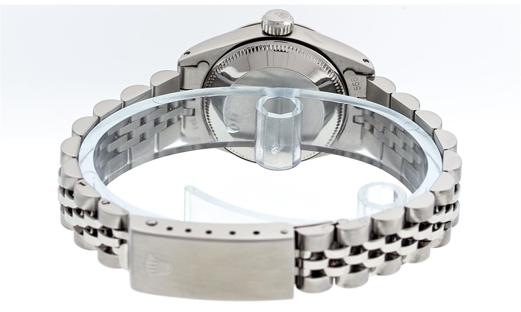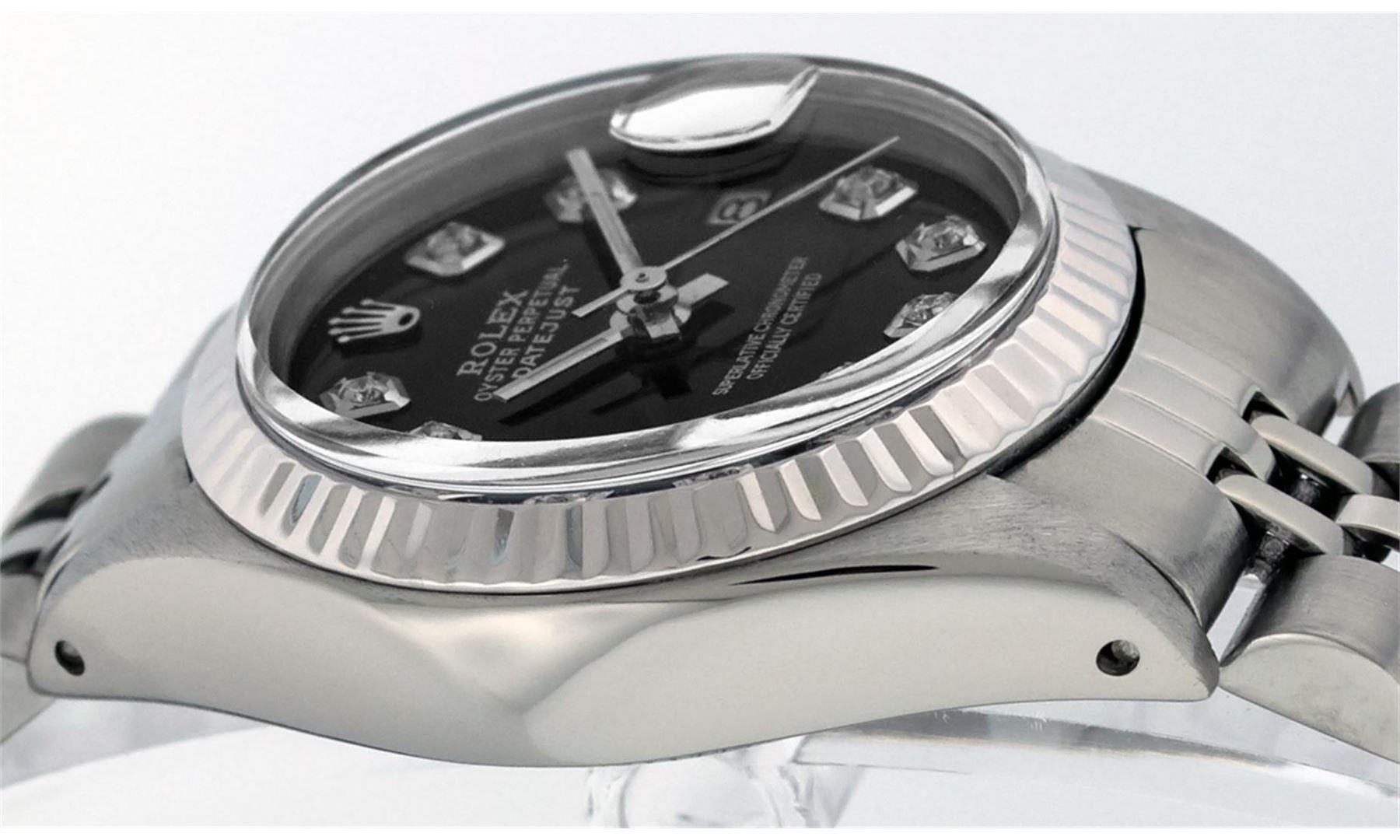 One Ladies Rolex Datejust Polished Bright with Satin Finish, Serviced & Electronically Tested, Stainless Steel Case:26mm, Stainless Steel Crown, Bezel: 14K White Gold Fluted Bezel. Custom Crystal: Acrylic Cyclops Lens. Movement: Automatic Winding Movement Caliber 2030. Custom Dial: Black With Diamond Hour Markers, Diamond Count: 10 Diamonds, Clarity: SI-VS, Color: G to H. Date Window: 3 O'Clock Position Date Display, Model: Datejust. Condition: G-6 Extra Fine. Bracelet: Stainless Steel Jubilee Band. Bright Polish & Satin Finish. 6.0 Inch Length, Adjustable. Standard Clasp, With Rolex Logo.