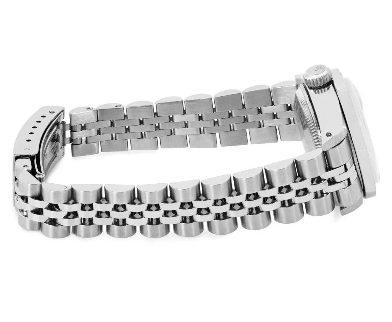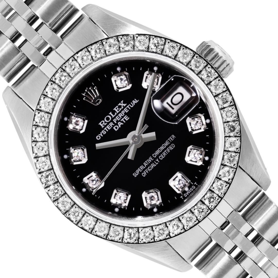 One Rolex Ladies Pre Owned Stainless Steel Date Wristwatch Polished Bright with Satin Finish, Serviced And Electronically Tested, Stainless Steel Case: 26mm, Stainless Steel Crown, Custom Bezel: New Stainless Steel Beadset Diamond Bezel, Diamond Count: 40 Diamonds. Custom Crystal: New Sapphire With Magnified Date Window. Custom Hands: New Solid Hands. Rolex Movement: Automatic Winding Movement 2035. Custom Dial: Custom Black Dial With Added Diamond Hour Markers And Lumi Dots, Diamond Count: 10 Diamonds On Dial. Date Window: 3 O'Clock Position Date Display, Model: Date. Condition: G-6 Extra Fine. Rolex Bracelet: Stainless Steel Jubilee Band. Bright Polish And Satin Finish. 6.0 Inch Length, Adjustable. Standard Clasp, With Rolex Logo. This Watch Has Been Serviced And Time Tested. It Is In Excellent Condition, Free Of All Scratches And Dents.