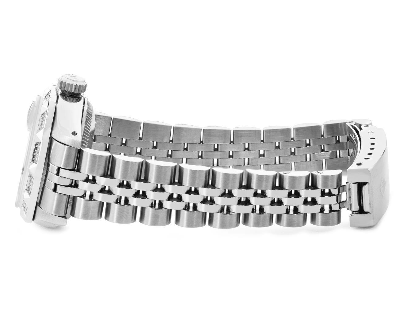 One Rolex Ladies Pre Owned Stainless Steel Date Wristwatch Polished Bright with Satin Finish, Serviced And Electronically Tested, Stainless Steel Case: 26mm, Stainless Steel Crown, Custom Bezel: New 18K White Gold Pyramid Diamond Bezel, Diamond Count: 24 Diamonds On Bezel. Custom Crystal: New Sapphire With Magnified Date Window. Custom Hands: New Non Luminescent Hands. Rolex Movement: Automatic Winding Movement 2035. Custom Dial: Custom Black Dial With Added Diamond Hour Markers Dash Track, and Lumi Dots. Date Window: 3 O'Clock Position Date Display, Model: Date. Condition: G-6 Extra Fine. Rolex Bracelet: Stainless Steel Jubilee Band. Bright Polish And Satin Finish. 6.0 Inch Length, Adjustable. Standard Clasp, With Rolex Logo. This Watch Has Been Serviced Time Tested And Is In Excellent Condition. It Is Free Of All Scratches And Dents.