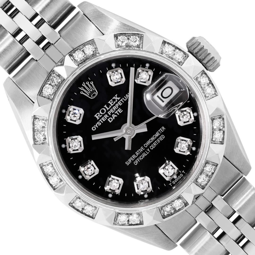 One Rolex Ladies Pre Owned Stainless Steel Date Wristwatch Polished Bright with Satin Finish, Serviced And Electronically Tested, Stainless Steel Case: 26mm, Stainless Steel Crown, Custom Bezel: New 18K White Gold Pyramid Diamond Bezel, Diamond Count: 24 Diamonds On Bezel. Custom Crystal: New Sapphire With Magnified Date Window. Custom Hands: New Non Luminescent Hands. Rolex Movement: Automatic Winding Movement 2035. Custom Dial: Custom Black Dial With Added Diamond Hour Markers Dash Track, and Lumi Dots. Date Window: 3 O'Clock Position Date Display, Model: Date. Condition: G-6 Extra Fine. Rolex Bracelet: Stainless Steel Jubilee Band. Bright Polish And Satin Finish. 6.0 Inch Length, Adjustable. Standard Clasp, With Rolex Logo. This Watch Has Been Serviced Time Tested And Is In Excellent Condition. It Is Free Of All Scratches And Dents.