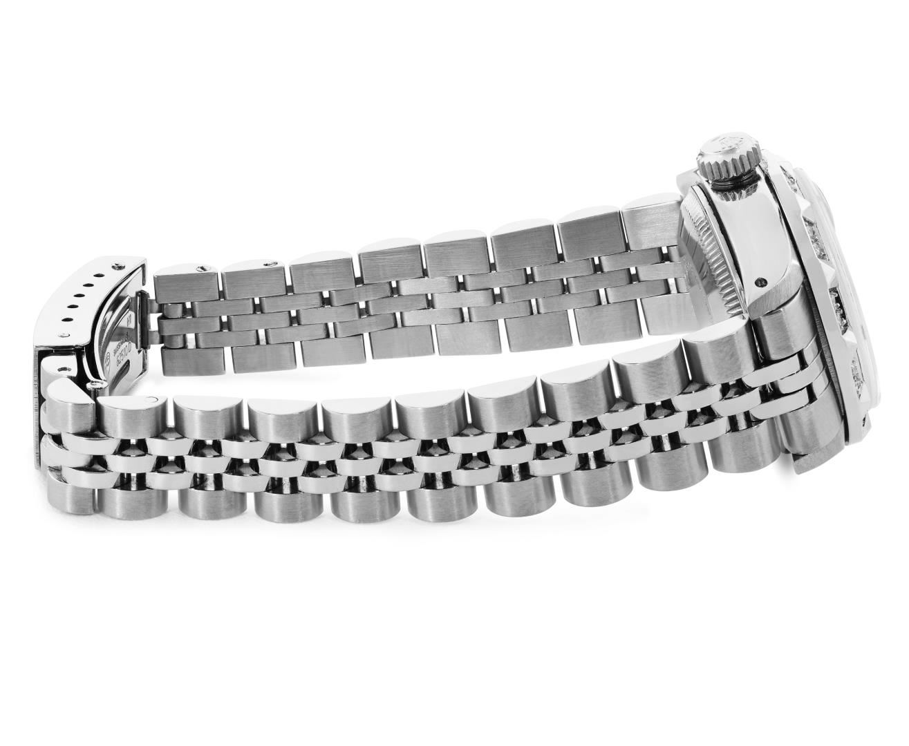 One Rolex Ladies Pre Owned Stainless Steel Date Wristwatch Polished Bright with Satin Finish, Serviced And Electronically Tested, Stainless Steel Case: 26mm, Stainless Steel Crown, Custom Bezel: New 18K White Gold Pyramid Diamond Bezel, Diamond Count: 24 Diamonds On Bezel. Custom Crystal: New Sapphire With Magnified Date Window. Custom Hands: New Non Luminescent Hands. Rolex Movement: Automatic Winding Movement 2035. Custom Dial: Custom Black Dial With Added Diamond Hour Markers Dash Track, and Lumi Dots. Date Window: 3 O'Clock Position Date Display, Model: Date. Condition: G-6 Extra Fine. Rolex Bracelet: Stainless Steel Jubilee Band. Bright Polish And Satin Finish. 6.0 Inch Length, Adjustable. Standard Clasp, With Rolex Logo. This Watch Has Been Serviced Time Tested And Is In Excellent Condition. It Is Free Of All Scratches And Dents.