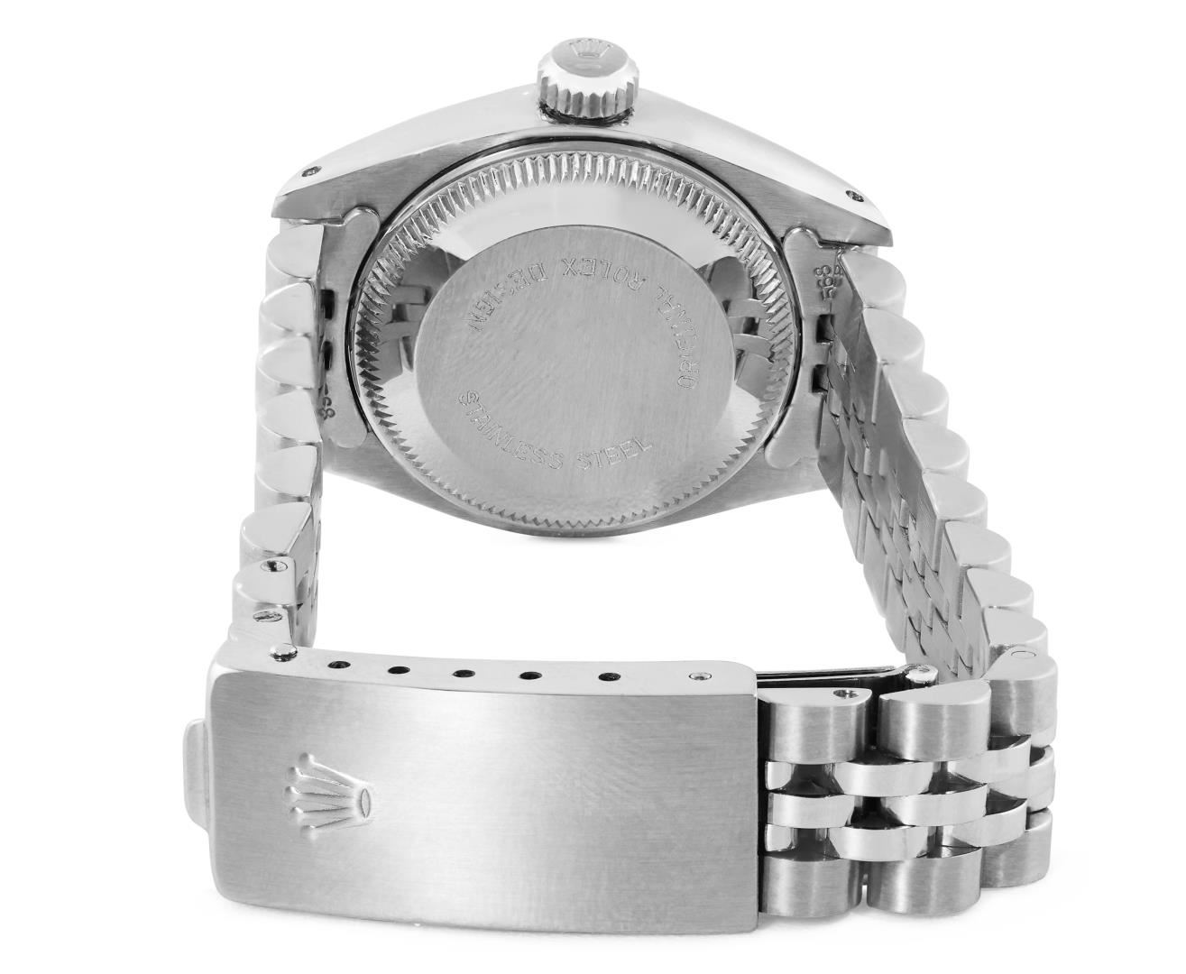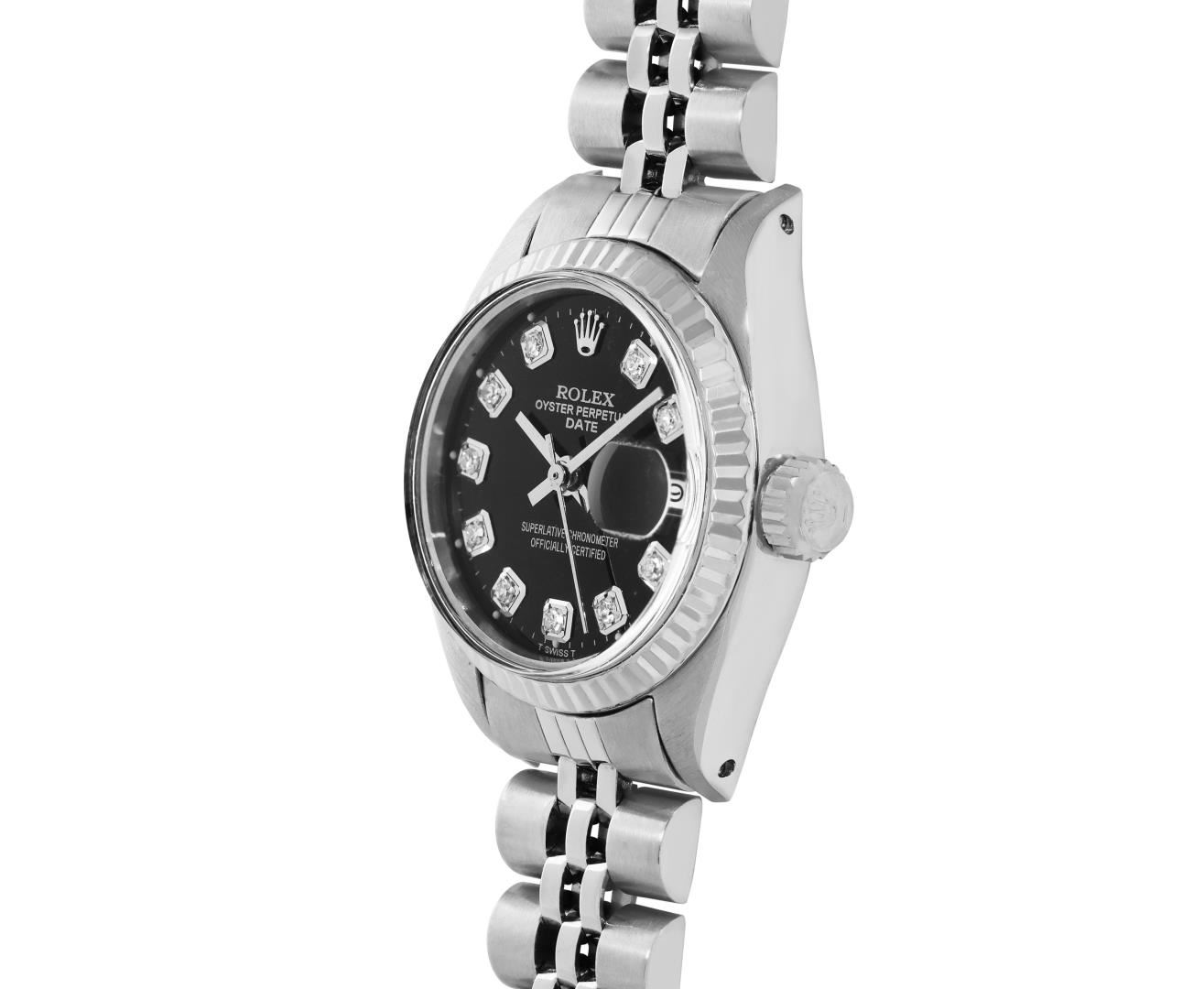 One Rolex Ladies Pre Owned Stainless Steel Date Wristwatch Polished Bright with Satin Finish, Serviced and Electronically Tested, Stainless Steel Case: 26mm, Stainless Steel Crown, 14K White Gold Fluted Bezel, Custom Crystal: New Acrylic With Magnifying D