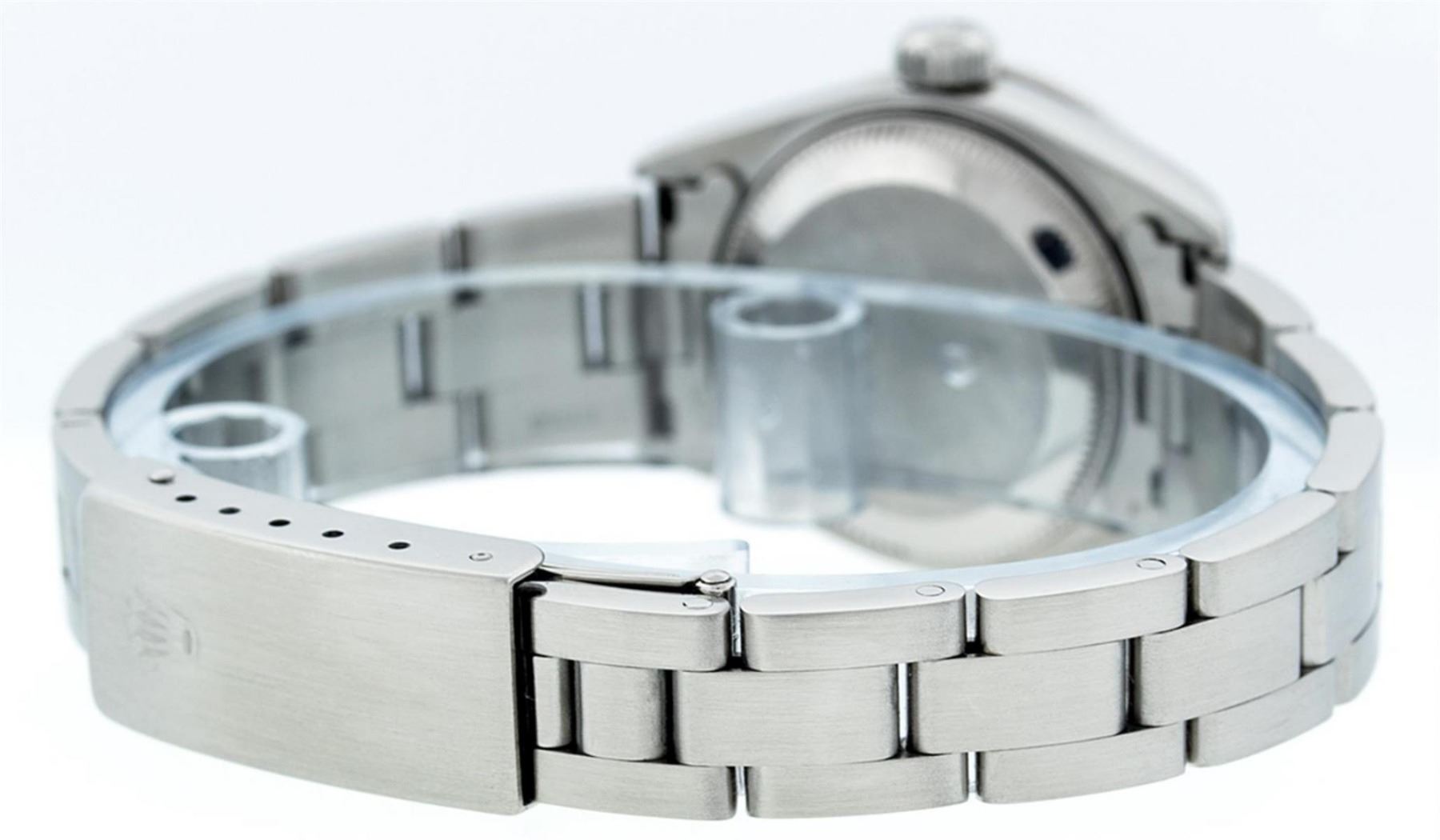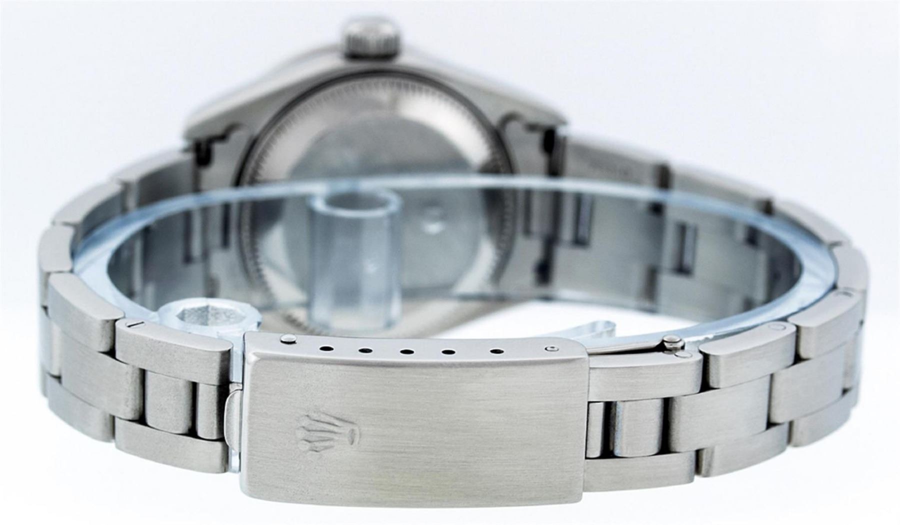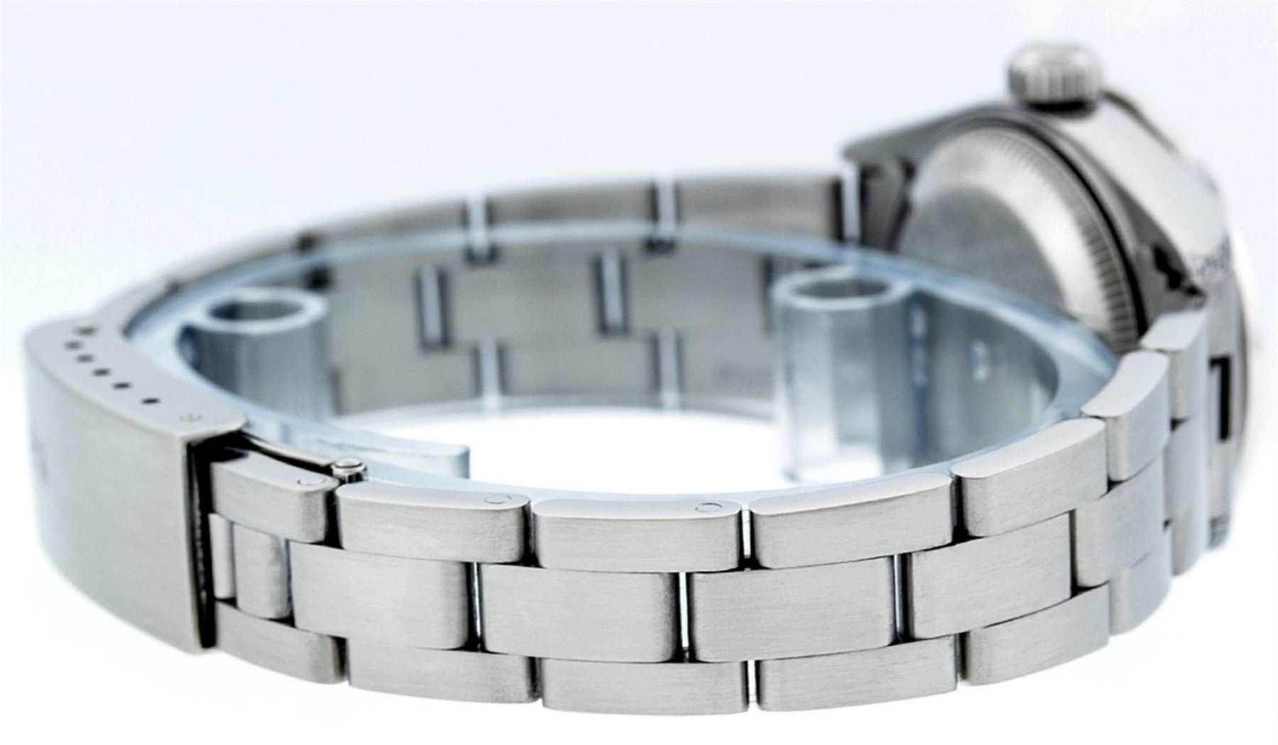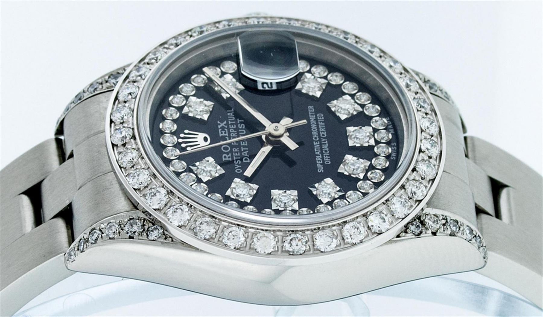 One Quickset Ladies Stainless Steel Rolex Datejust Polished Bright with Satin Finish, Serviced & Electronically Tested, Stainless Steel Case: 26mm, Stainless Steel Crown, Custom Diamond Lugs: 24 Diamonds On Lugs, Clarity: SI-VS, Color: G to H. Custom Bezel: New 18K White Gold Beadset Diamond Bezel, Stone Count: 32 Diamonds On Bezel, Total Bezel Weight .70 Carat, Clarity: SI-VS, Color: G to H. Custom Crystal: New Scratch Resistant Synthetic Sapphire Cyclops Lens. Custom Hands: New Luminescent Hands. Movement: Automatic Winding Movement. Custom Dial: Refinished Single Cut Black String Diamond Dial, 43 Diamonds in Dial G To H In Color, Clarity: VS. Date Window: 3 O'Clock Position Date Display, Model: Quickset Datejust Caliber 2230. Condition: G-6 Extra Fine. Bracelet: Stainless Steel Oyster Band. Bright Polish & Satin Finish. 6.0 Inch Length, Adjustable. Standard Clasp, With Rolex Logo. This Watch Has Been Serviced Time Tested And Is In Excellent Condition It Is Free Of All Scratches And Dents.