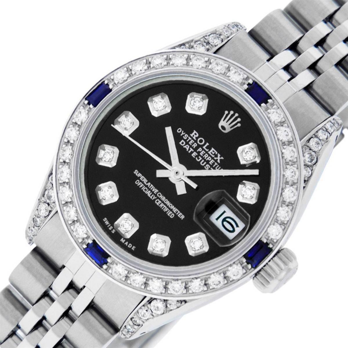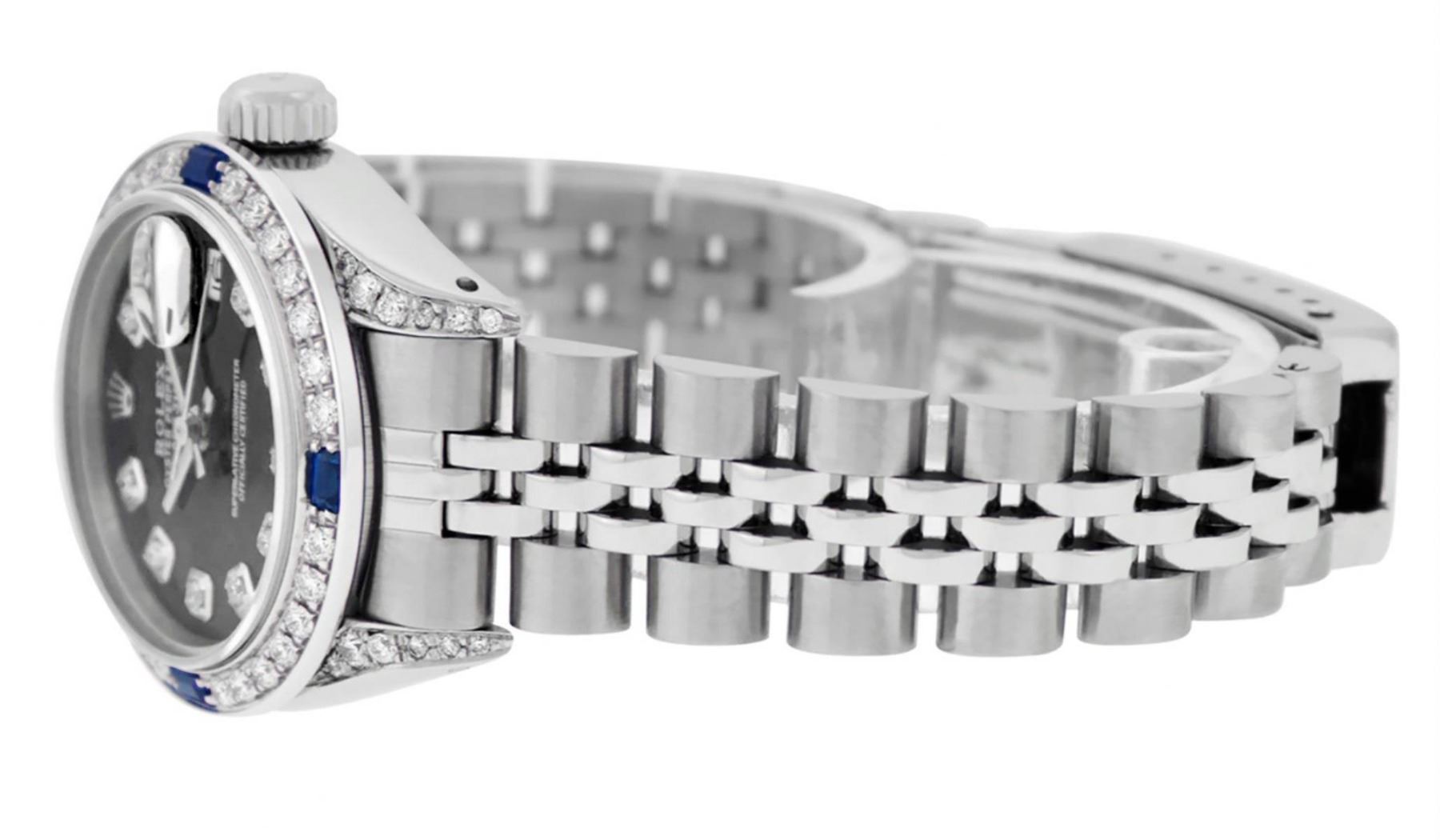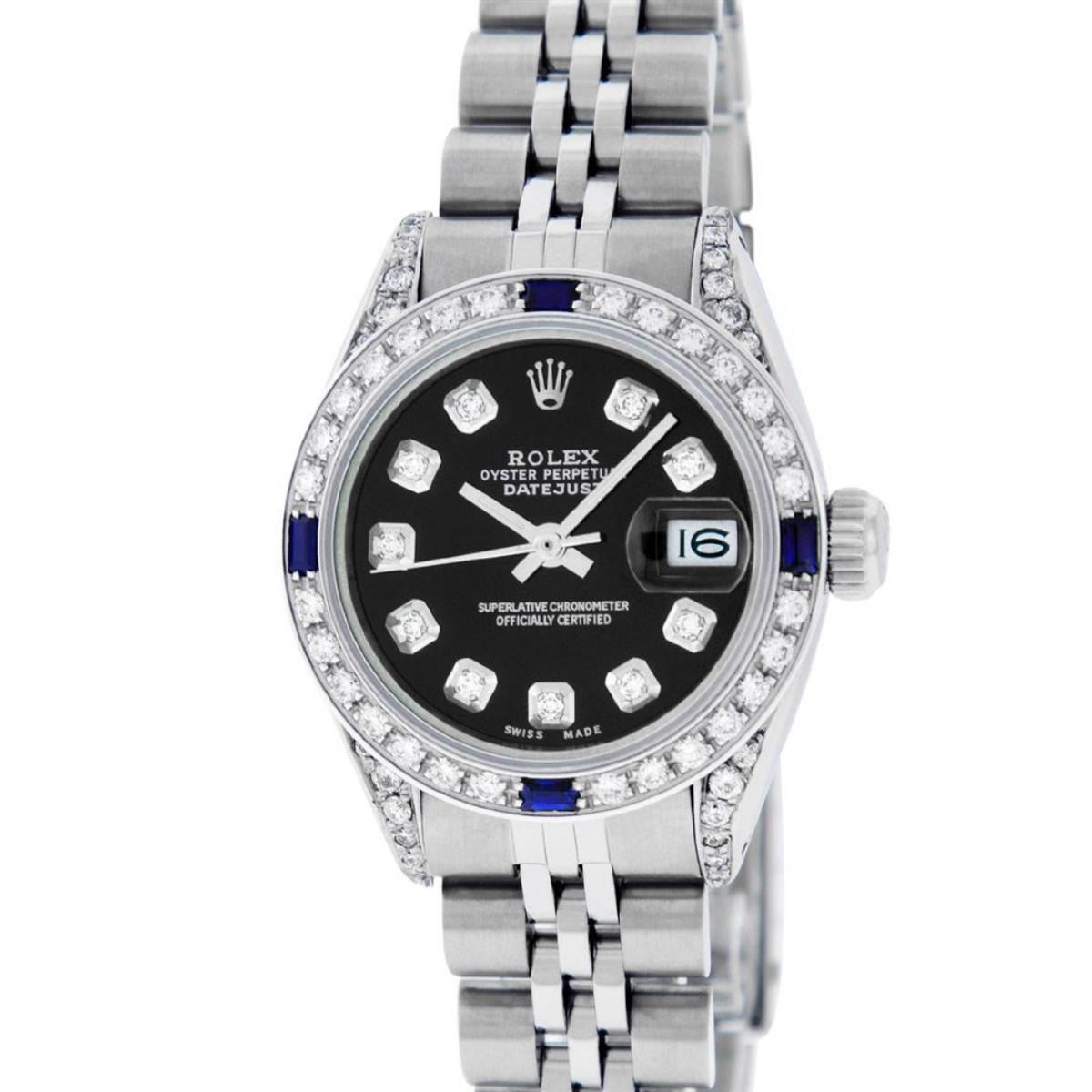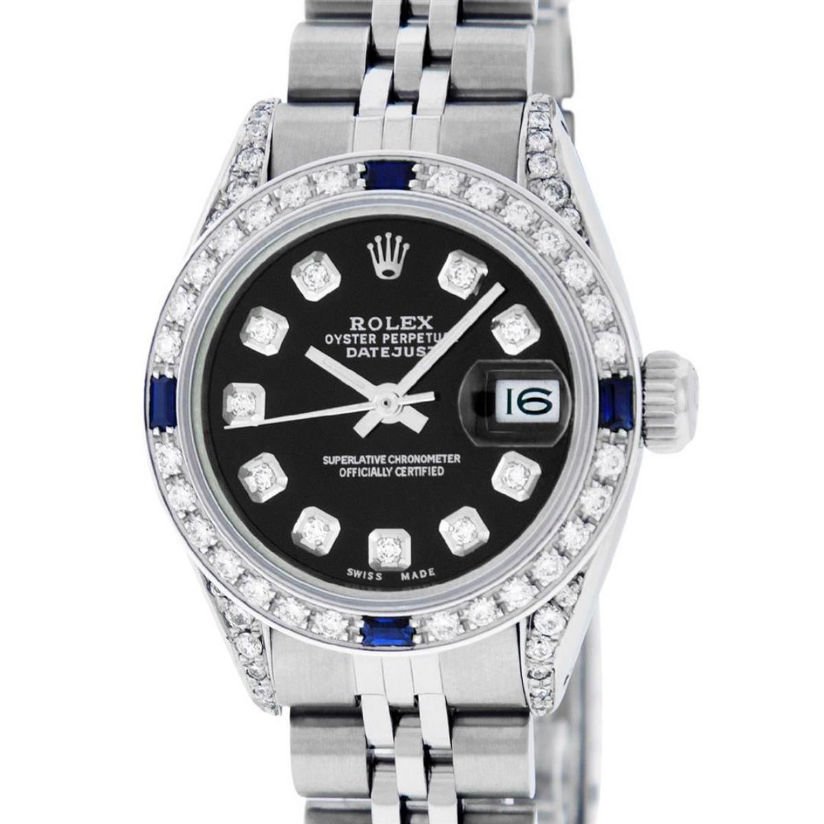 One Ladies Stainless Steel Rolex Datejust Polished Bright with Satin Finish, Serviced & Electronically Tested, Stainless Steel Case: 26mm, Stainless Steel Crown, Diamond Lugs: 24 Diamonds On Lugs, Clarity: SI-VS, Color: G to H. Custom Bezel: New 18K White Gold Diamond & Sapphire Beadset Bezel, Diamond Count: 28 Diamonds + 4 Sapphires, Total Weight .70 Carats, Clarity: SI-VS, Color: G to H. Custom Crystal: New Scratch Resistant Synthetic Sapphire Cyclops Lens. Custom Hands: New Luminescent Hands. Movement: Automatic Winding Movement. Custom Dial: Refinished Black Diamond Dial, 10 Diamonds in Dial, G To H In Color, Clarity: SI-VS. Date Window: 3 O'Clock Position Date Display, Model: Datejust Condition: G-6 Extra Fine. Bracelet: Stainless Steel Jubilee Band. Bright Polish & Satin Finish. 6.0 Inch Length, Adjustable. Standard Clasp, With Rolex Logo. This Watch Has Been Serviced Time Tested And Is In Excellent Condition It Is Free Of All Scratches And Dents.