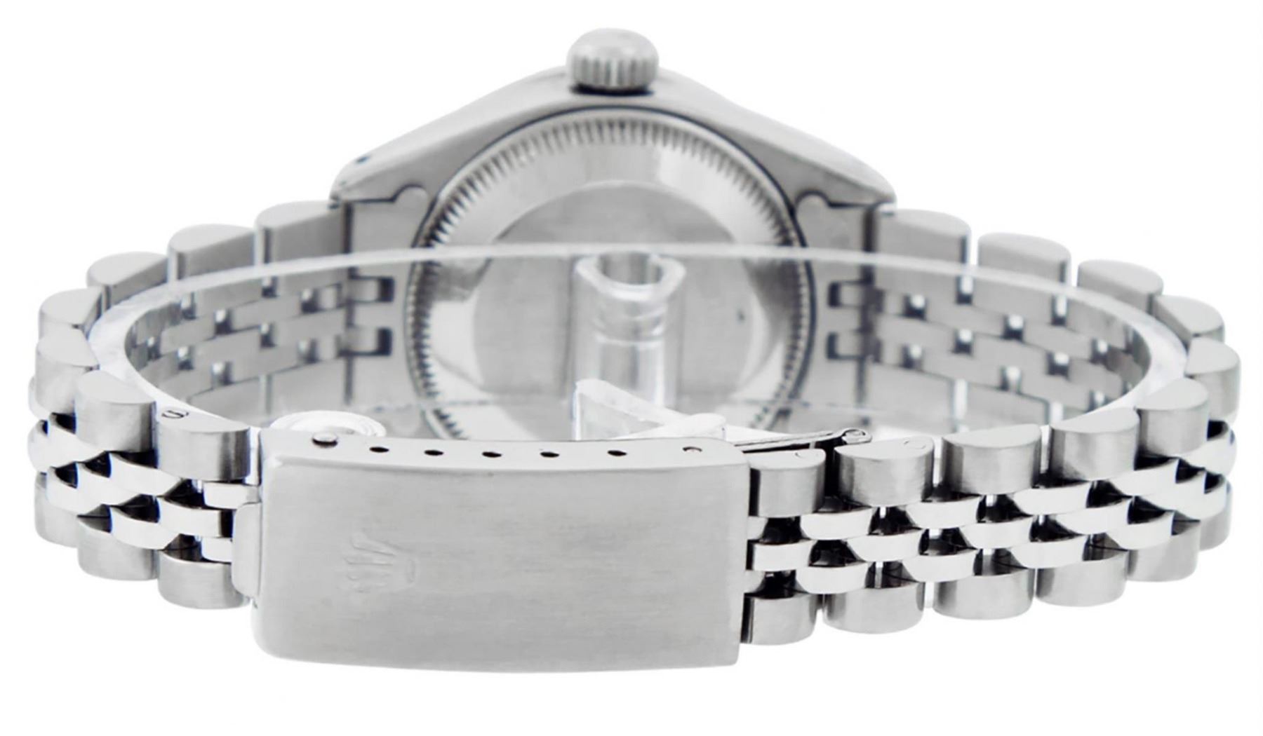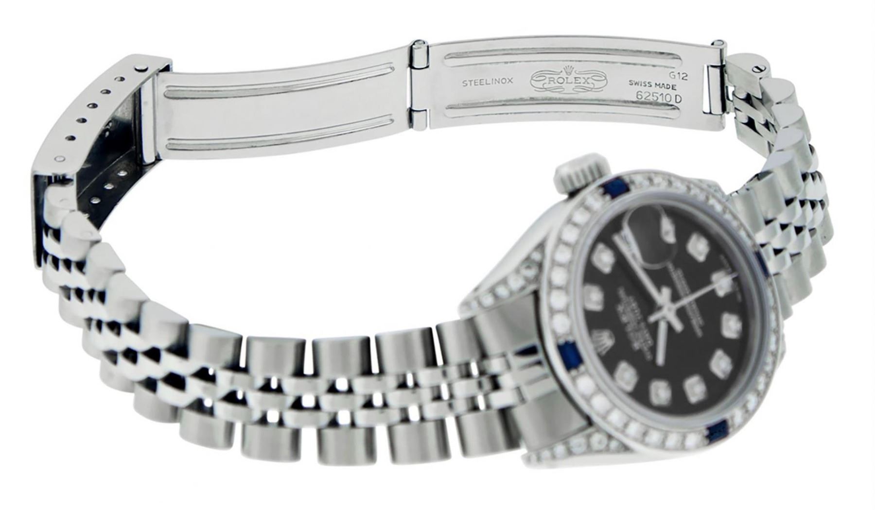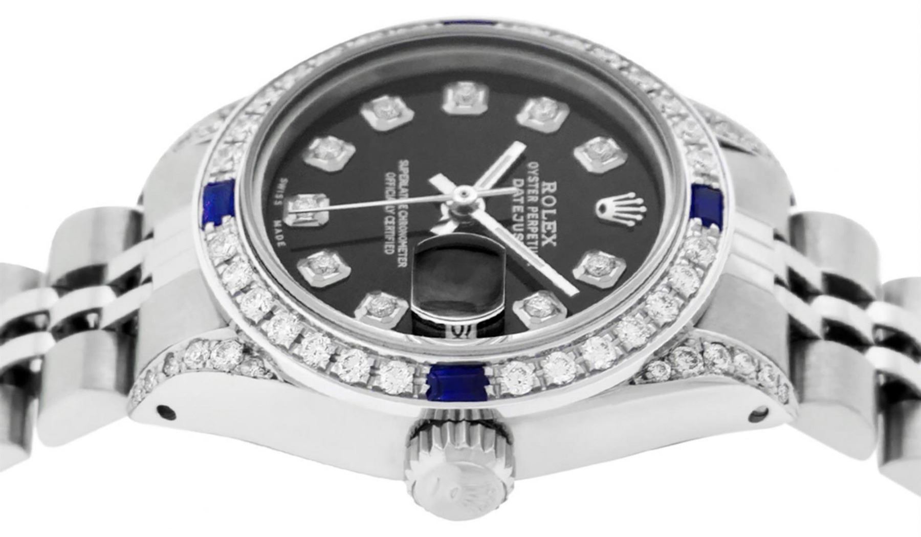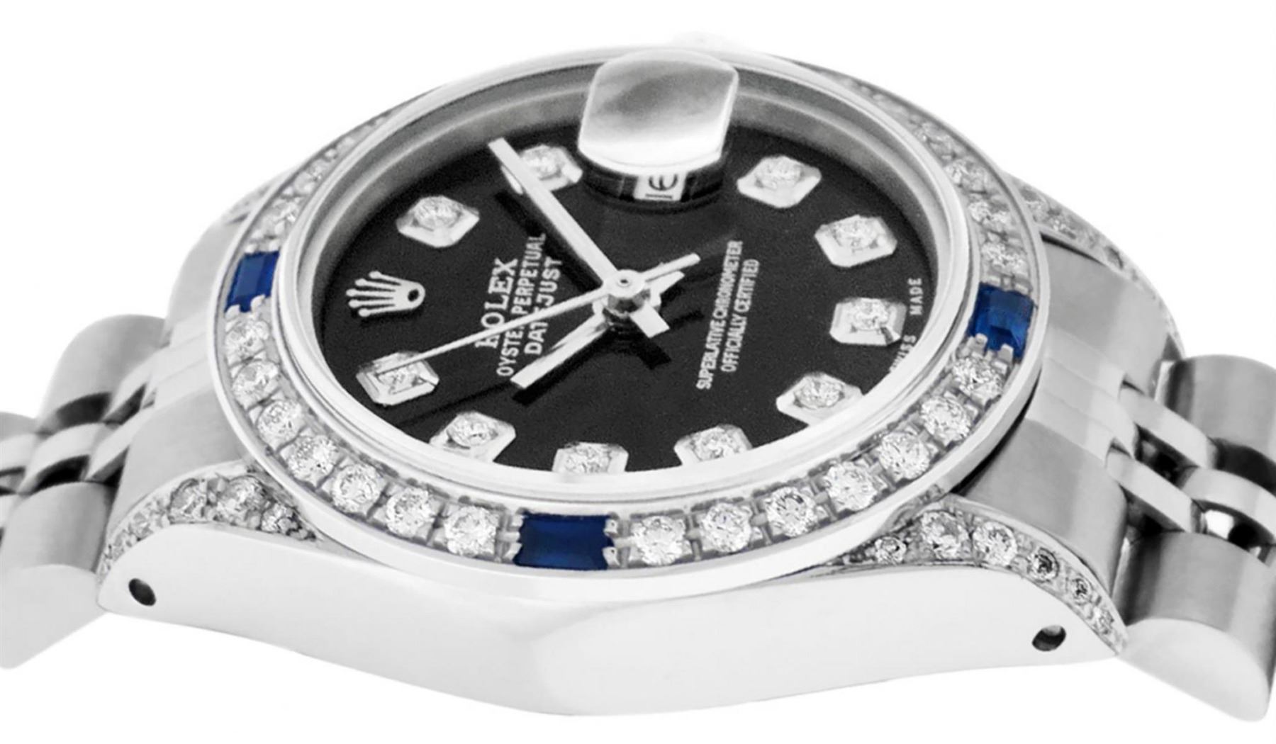 One Ladies Stainless Steel Rolex Datejust Polished Bright with Satin Finish, Serviced & Electronically Tested, Stainless Steel Case: 26mm, Stainless Steel Crown, Diamond Lugs: 24 Diamonds On Lugs, Clarity: SI-VS, Color: G to H. Custom Bezel: New 18K White Gold Diamond & Sapphire Beadset Bezel, Diamond Count: 28 Diamonds + 4 Sapphires, Total Weight .70 Carats, Clarity: SI-VS, Color: G to H. Custom Crystal: New Scratch Resistant Synthetic Sapphire Cyclops Lens. Custom Hands: New Luminescent Hands. Movement: Automatic Winding Movement. Custom Dial: Refinished Black Diamond Dial, 10 Diamonds in Dial, G To H In Color, Clarity: SI-VS. Date Window: 3 O'Clock Position Date Display, Model: Datejust Condition: G-6 Extra Fine. Bracelet: Stainless Steel Jubilee Band. Bright Polish & Satin Finish. 6.0 Inch Length, Adjustable. Standard Clasp, With Rolex Logo. This Watch Has Been Serviced Time Tested And Is In Excellent Condition It Is Free Of All Scratches And Dents.