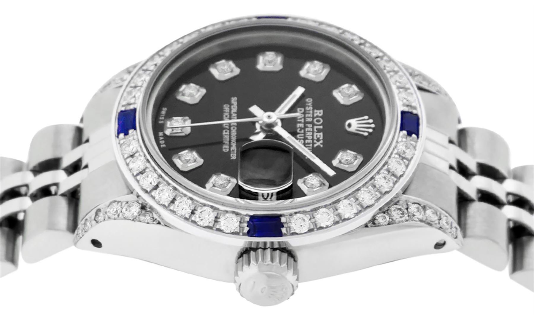 One Ladies Stainless Steel Rolex Datejust Polished Bright with Satin Finish, Serviced & Electronically Tested, Stainless Steel Case: 26mm, Stainless Steel Crown, Diamond Lugs: 24 Diamonds On Lugs, Clarity: SI-VS, Color: G to H. Custom Bezel: New 18K White Gold Diamond & Sapphire Beadset Bezel, Diamond Count: 28 Diamonds + 4 Sapphires, Total Weight .70 Carats, Clarity: SI-VS, Color: G to H. Custom Crystal: New Scratch Resistant Synthetic Sapphire Cyclops Lens. Custom Hands: New Luminescent Hands. Movement: Automatic Winding Movement. Custom Dial: Refinished Black Diamond Dial, 10 Diamonds in Dial, G To H In Color, Clarity: SI-VS. Date Window: 3 O'Clock Position Date Display, Model: Datejust Condition: G-6 Extra Fine. Bracelet: Stainless Steel Jubilee Band. Bright Polish & Satin Finish. 6.0 Inch Length, Adjustable. Standard Clasp, With Rolex Logo. This Watch Has Been Serviced Time Tested And Is In Excellent Condition It Is Free Of All Scratches And Dents.