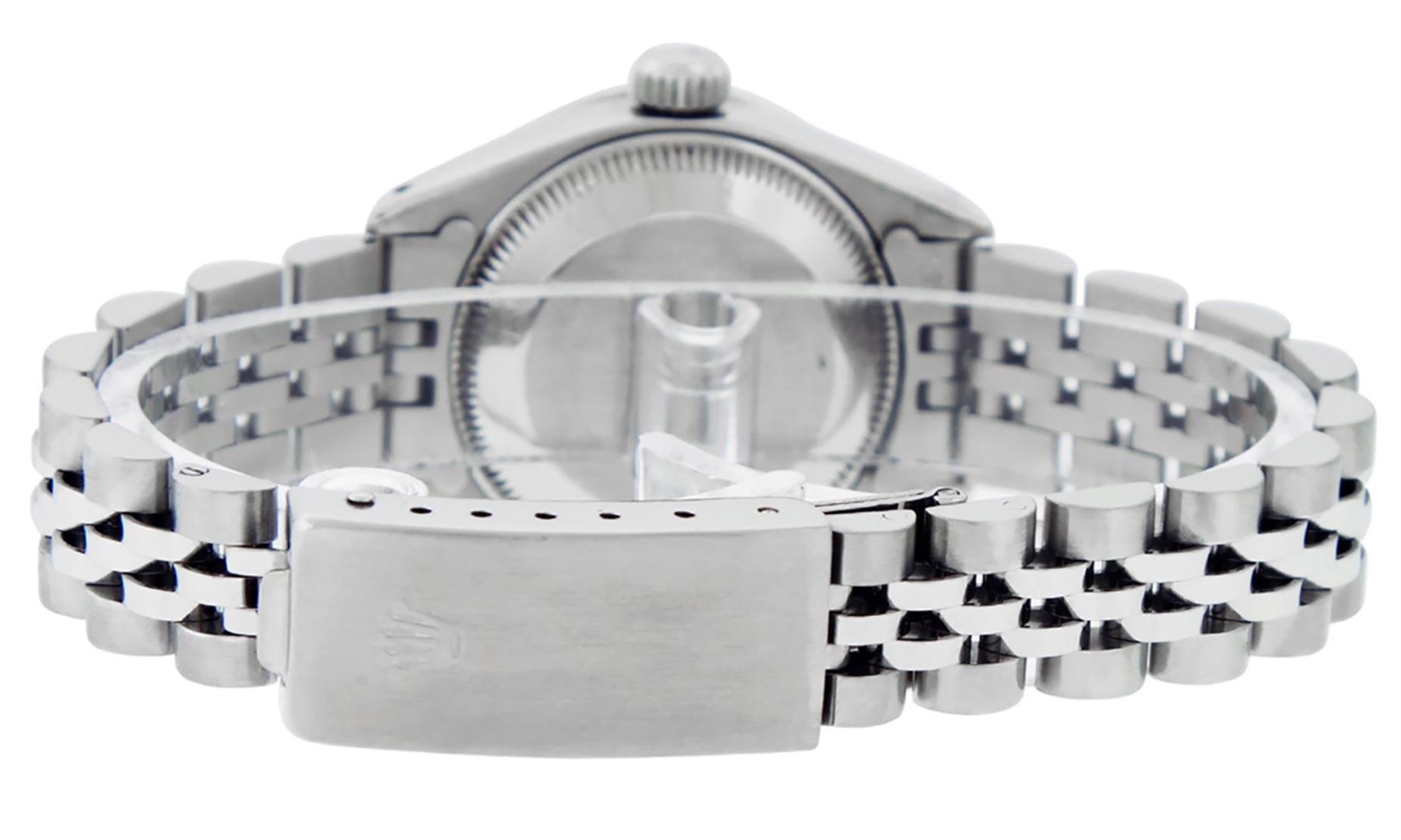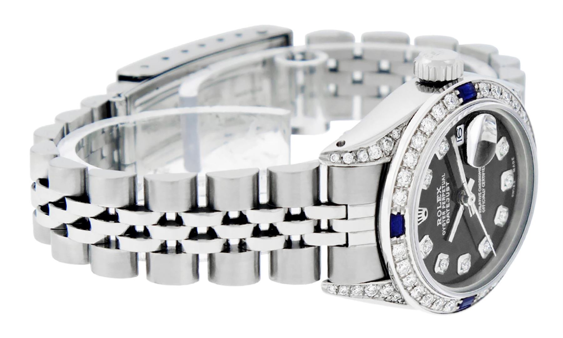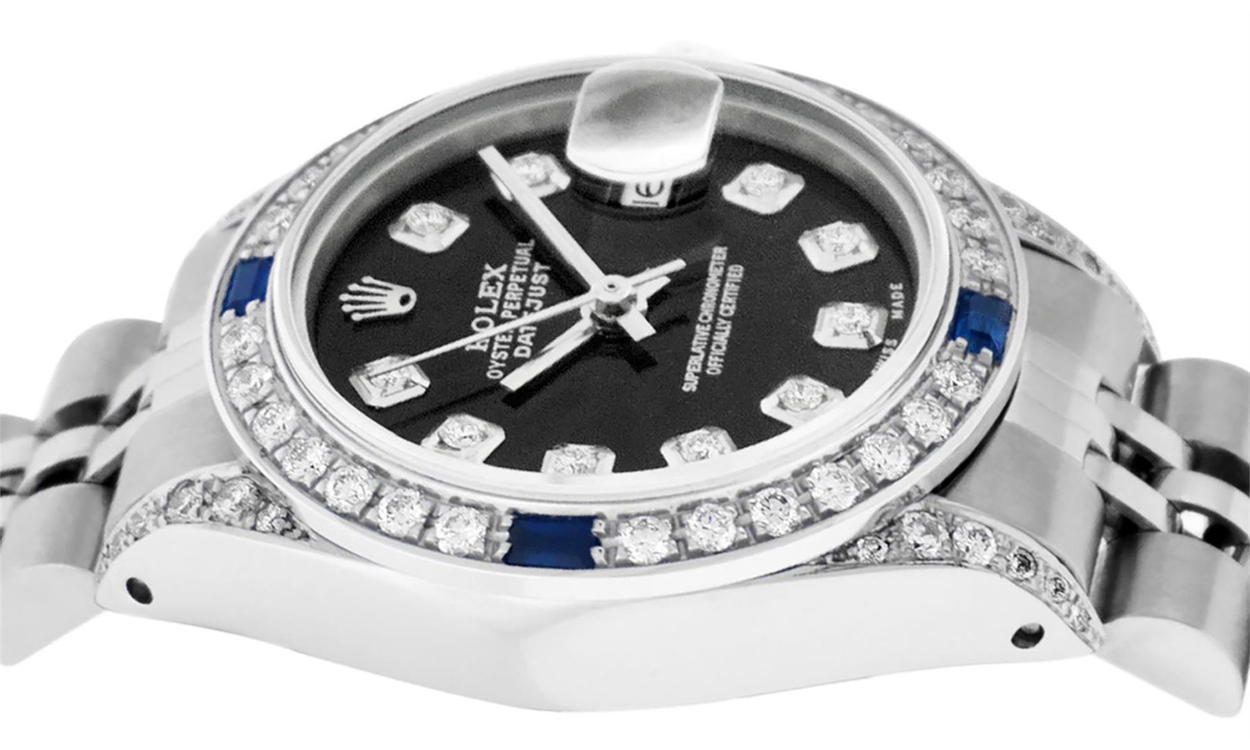 One Ladies Pre Owned Stainless Steel Rolex Datejust Polished Bright with Satin Finish, Serviced & Electronically Tested, Stainless Steel Case: 26mm, Stainless Steel Crown, Custom Diamond Lugs: 24 Diamonds On Lugs, Clarity: SI-VS, Color: G to H. Custom Bezel: New 18K White Gold Diamond & Sapphire Beadset Bezel, Diamond Count: 28 Diamonds + 4 Sapphires, Clarity: SI-VS, Color: G to H. Custom Crystal: New Sapphire With Date Window. Custom Hands: New Luminescent Hands. Rolex Movement: Automatic Winding Movement. Custom Dial: Refinished To Black With Custom Added Diamond Hour Markers, 10 Diamonds in Dial, G To H In Color, Clarity: SI-VS. Date Window: 3 O'Clock Position Date Display, Model: Datejust Condition: G-6 Extra Fine. Rolex Bracelet: Stainless Steel Jubilee Band. Bright Polish & Satin Finish. 6.0 Inch Length, Adjustable. Standard Clasp, With Rolex Logo. This Watch Has Been Serviced Time Tested And Is In Excellent Condition It Is Free Of All Scratches And Dents.