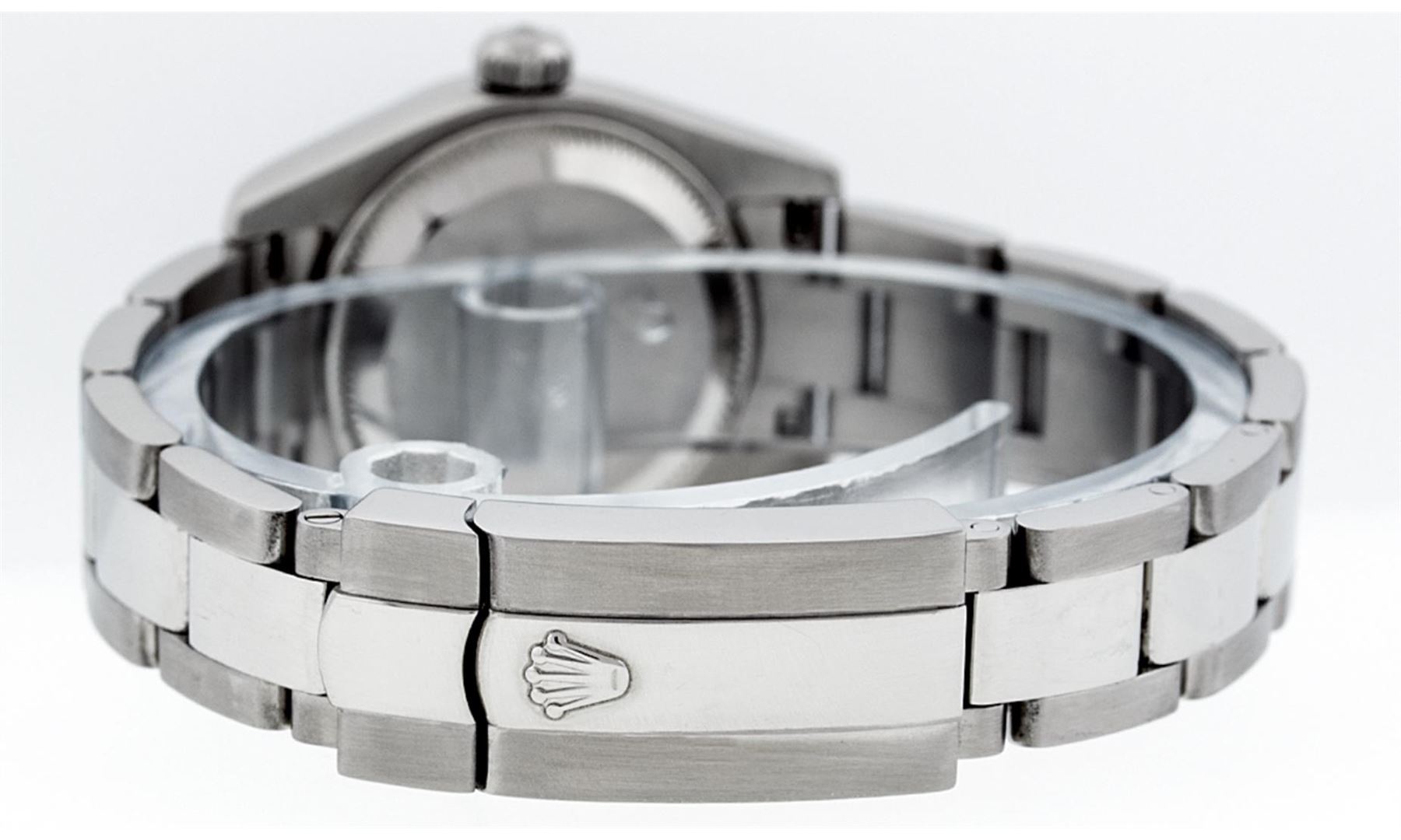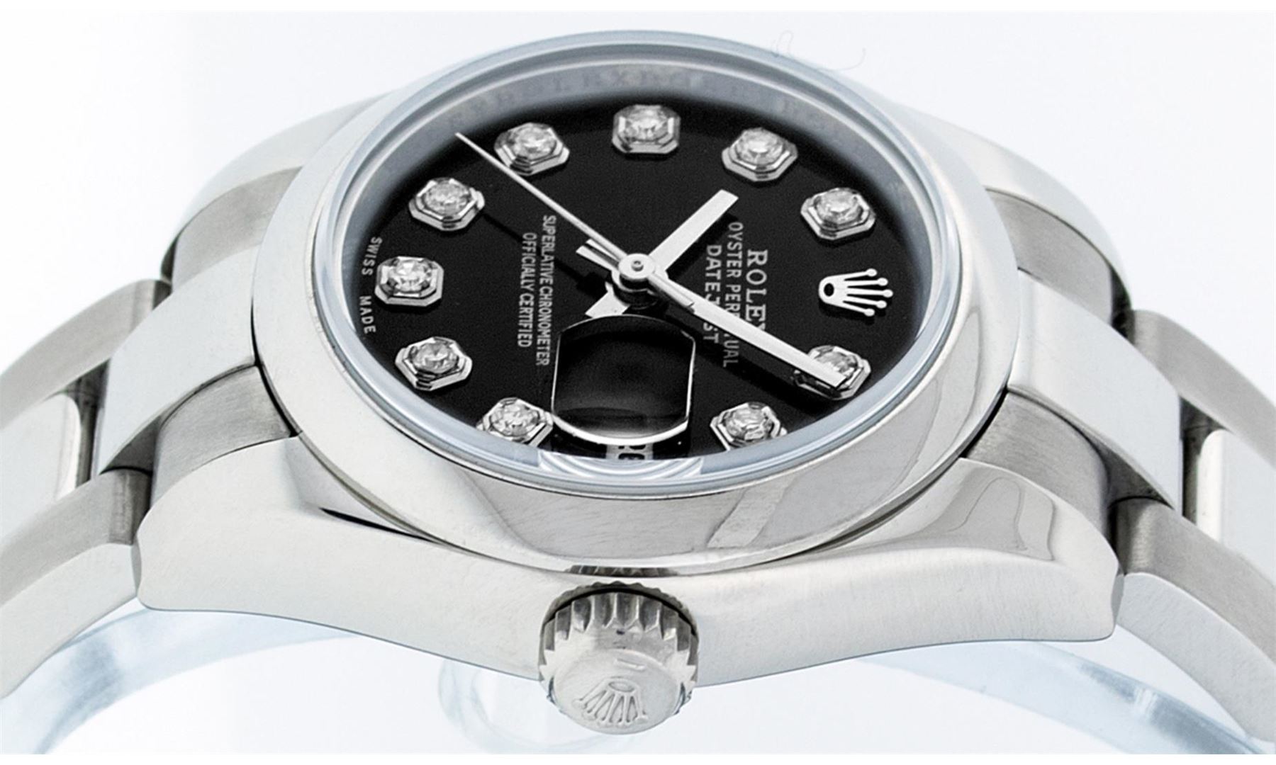 One Ladies Pre Owned Quickset Stainless Steel Rolex Datejust Polished Bright with Satin Finish, Serviced And Electronically Tested, Rolex Stainless Steel Case: 26mm, Rolex Stainless Steel Crown, Rolex Bezel: Stainless Steel Smooth Bezel. Crystal: Sapphire With Magnified Date Window. Hands: Luminescent Hands. Rolex Movement: Automatic Winding 2235 Rolex Movement. Custom Dial: Custom Black Dial With Added Diamonds, Diamond Count: 10 Diamonds On Dial. Date Window: 3 O'Clock Position Date Display, Model: Caliber 2235 Quickset Datejust. Condition: G-6 Extra Fine. Rolex Bracelet: Stainless Steel Oyster Band. Bright Polish And Satin Finish. 6.0 Inch Length, Adjustable. Standard Clasp, With Rolex Logo. This Watch Has Been Serviced Time Tested And Is In Excellent Condition It Is Free Of All Scratches And Dents.