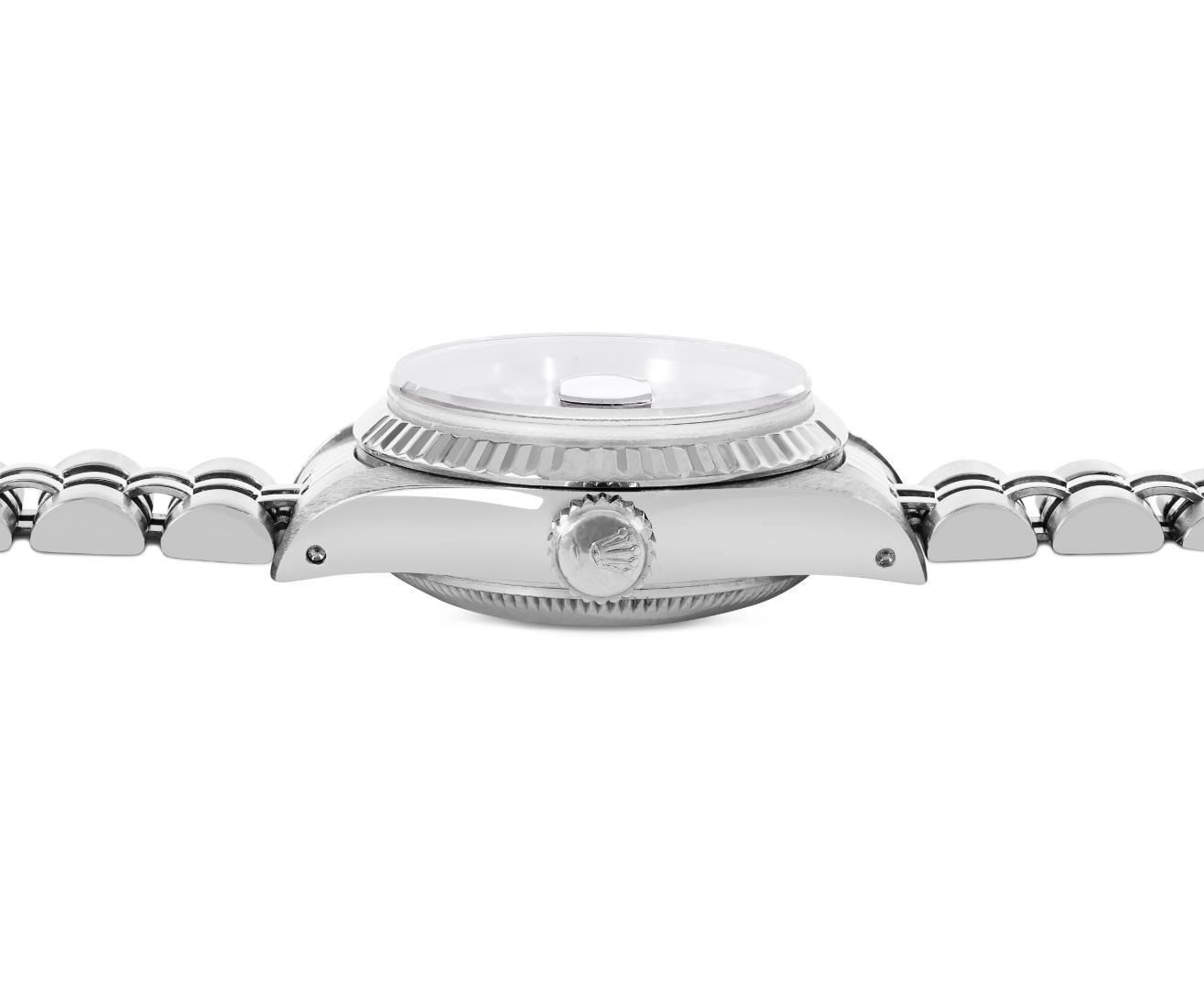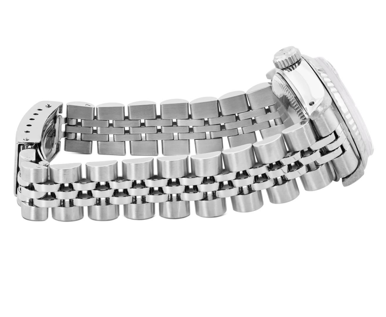 One Rolex Ladies Pre Owned Stainless Steel Datejust Wristwatch Polished Bright with Satin Finish, Serviced And Electronically Tested, Stainless Steel Case: 26mm, Stainless Steel Crown, 18K White Gold Fluted Bezel, Custom Crystal: New Sapphire With Magnifying Date Window. Custom Hands: New Solid Hands. Rolex Movement: Rolex Automatic Movement Self Winding 2135. Rolex Dial: Factory Black With Diamond Hour Markers And Dash Tracks. Date Window: 3 O'Clock Position Date Display, Model: Quickset Datejust. Condition: G-6 Extra Fine. Rolex Bracelet: Stainless Steel Jubilee Band. Bright Polish And Satin Finish. 6.0 Inch Length, Adjustable. Standard Clasp, With Rolex Logo. This Watch Has Been Serviced Time Tested And Is In Excellent Condition. It Is Free Of All Scratches And Dents.
