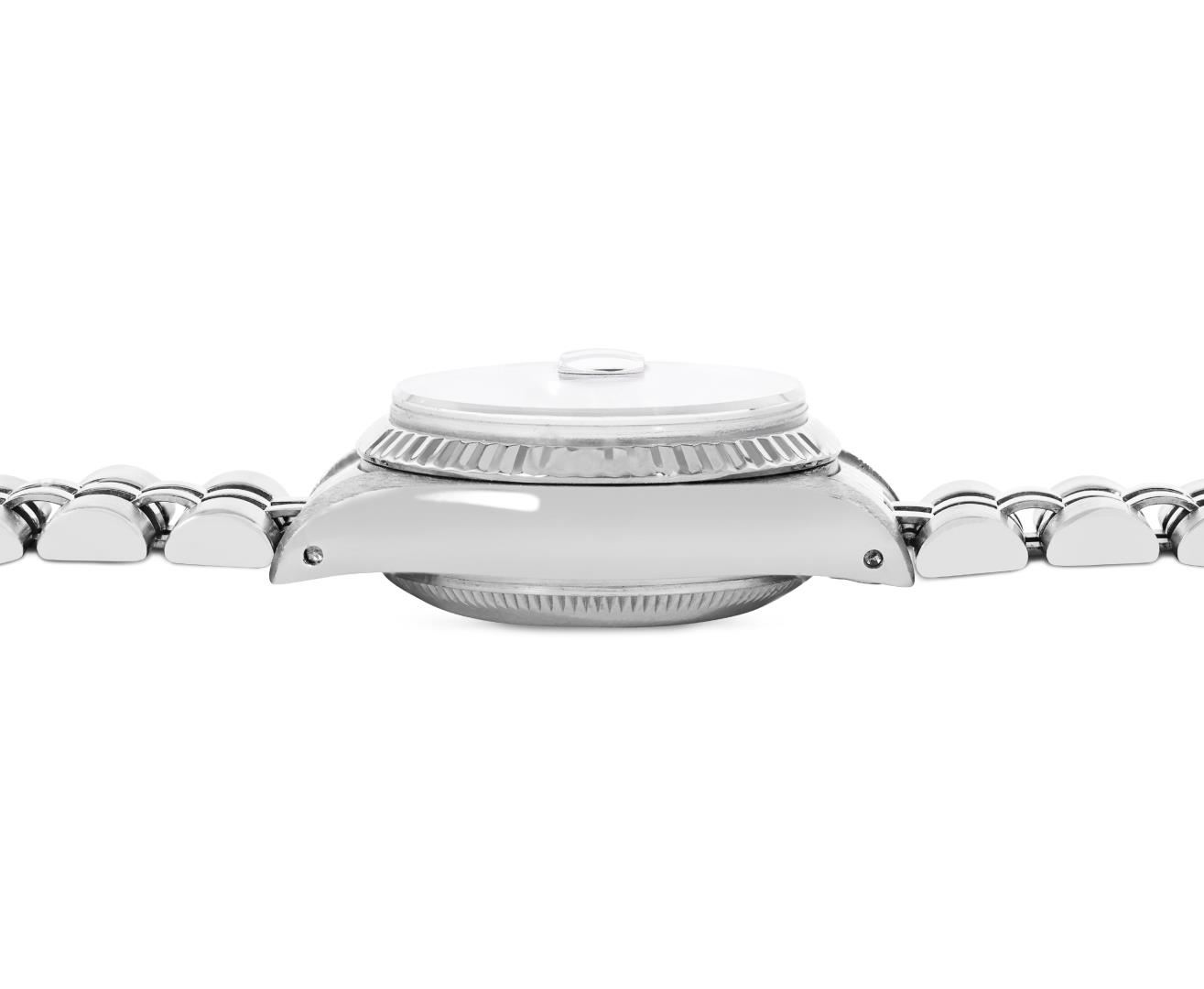 One Rolex Ladies Pre Owned Stainless Steel Datejust Wristwatch Polished Bright with Satin Finish, Serviced And Electronically Tested, Stainless Steel Case: 26mm, Stainless Steel Crown, 18K White Gold Fluted Bezel, Custom Crystal: New Sapphire With Magnifying Date Window. Custom Hands: New Solid Hands. Rolex Movement: Rolex Automatic Movement Self Winding 2135. Rolex Dial: Factory Black With Diamond Hour Markers And Dash Tracks. Date Window: 3 O'Clock Position Date Display, Model: Quickset Datejust. Condition: G-6 Extra Fine. Rolex Bracelet: Stainless Steel Jubilee Band. Bright Polish And Satin Finish. 6.0 Inch Length, Adjustable. Standard Clasp, With Rolex Logo. This Watch Has Been Serviced Time Tested And Is In Excellent Condition. It Is Free Of All Scratches And Dents.