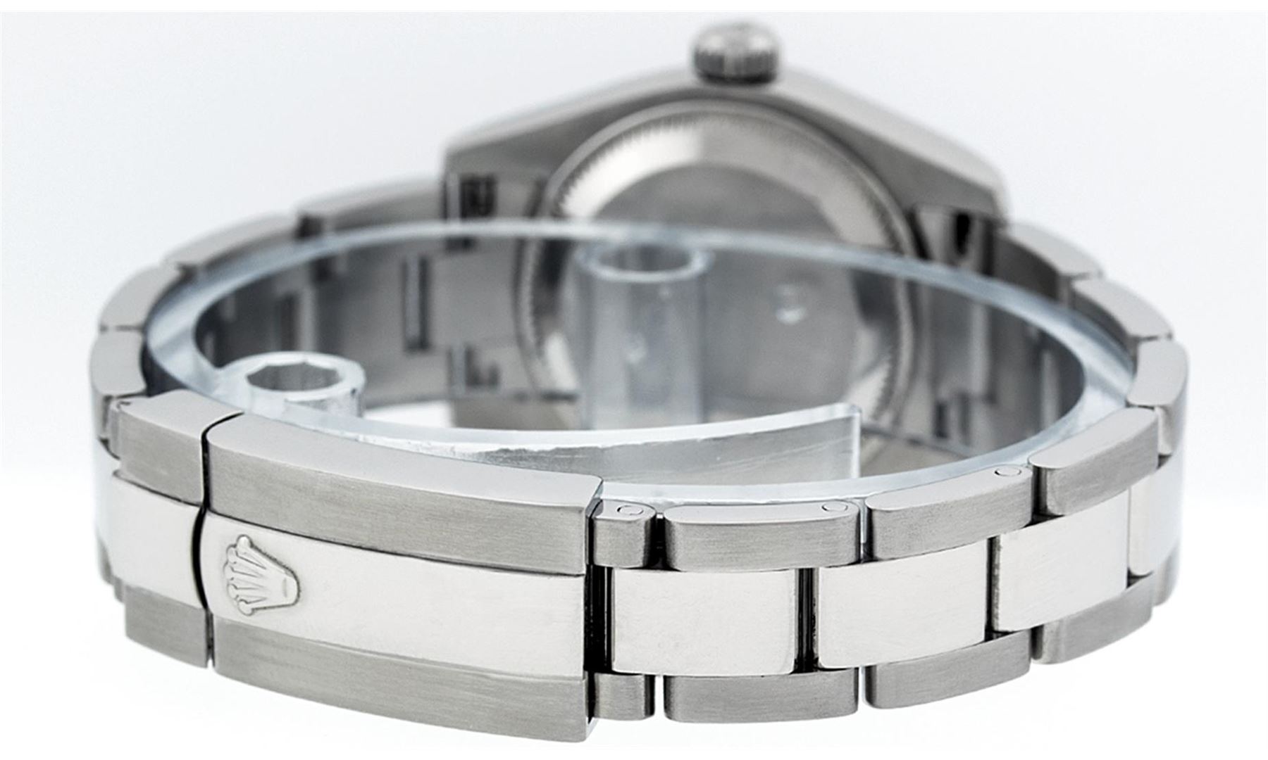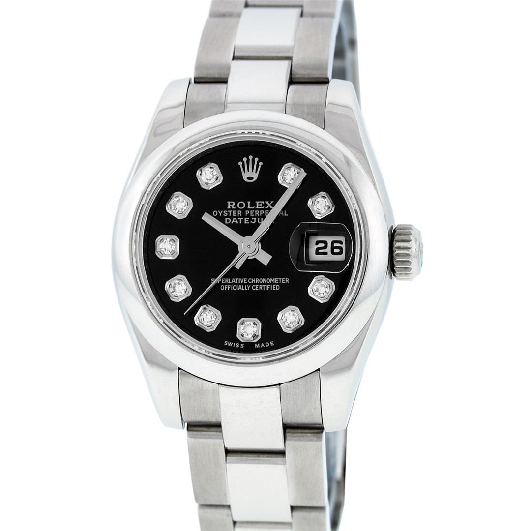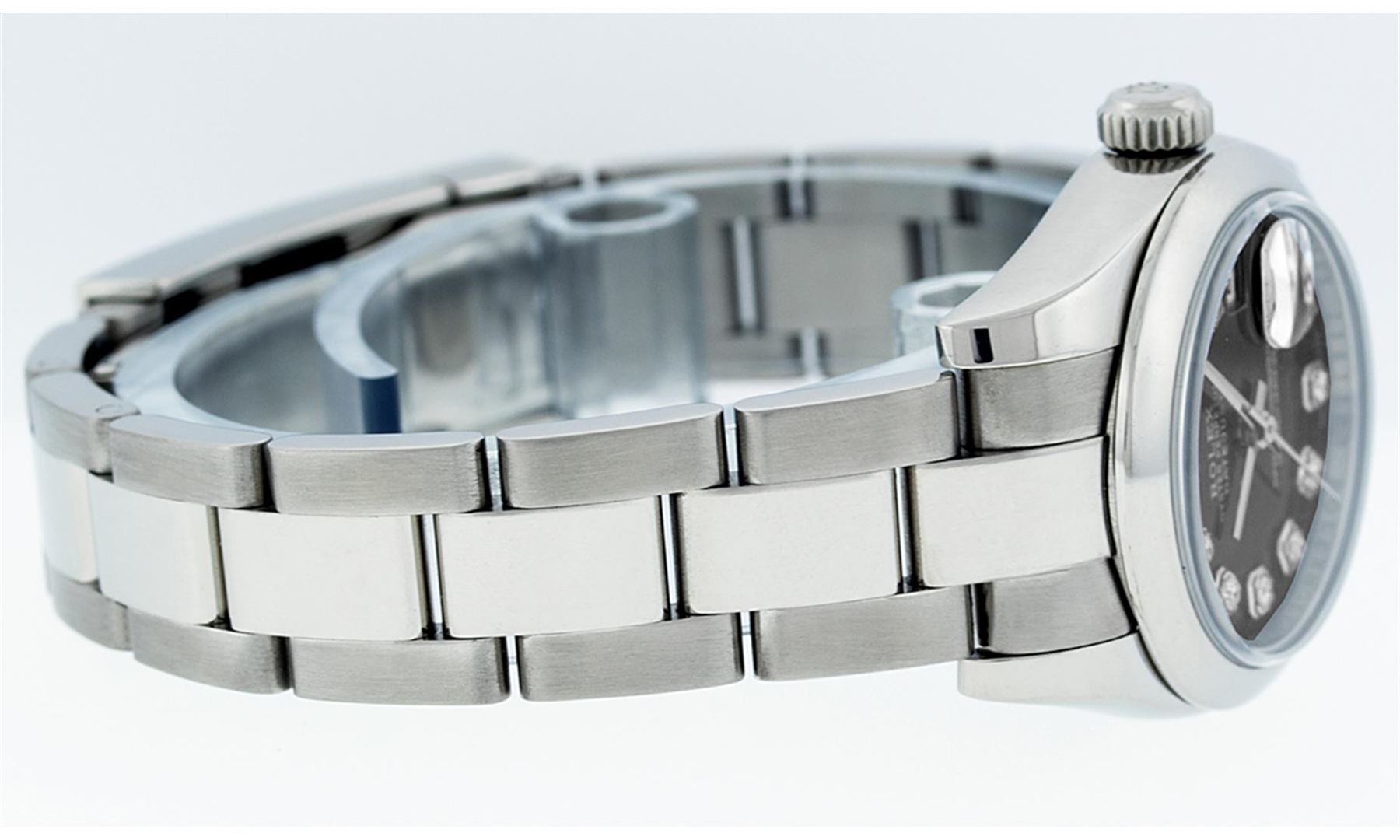 One Ladies Pre Owned Quickset Stainless Steel Rolex Datejust Polished Bright with Satin Finish, Serviced & Electronically Tested, Rolex Stainless Steel Case: 26mm, Rolex Stainless Steel Crown, Rolex Bezel: Stainless Steel Smooth Bezel. Crystal: Sapphire Cyclops Lens. Hands: Luminescent Hands. Rolex Movement: Automatic Winding 2230 Movement. Custom Dial: Refinished To Black With Added Single Cut VS Diamonds, Diamond Count: 10 Single Cut Diamonds In Dial, Color: G to H, Clarity: VS. Date Window: 3 O'clock Position Date Display, Model: Caliber 2230 Quickset Datejust. Condition: G-6 Extra Fine. Rolex Bracelet: Stainless Steel Oyster Band. Bright Polish & Satin Finish. 6.0 Inch Length, Adjustable. Standard Clasp, With Rolex Logo. This Watch Has Been Serviced Time Tested And Is In Excellent Condition It Is Free Of All Scratches And Dents.