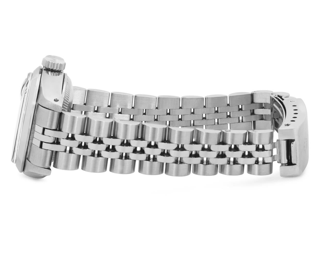 One Rolex Ladies Pre Owned Stainless Steel Date Wristwatch Polished Bright with Satin Finish, Serviced and Electronically Tested, Stainless Steel Case: 26mm, Stainless Steel Crown, Rolex Bezel: Stainless Steel Smooth Bezel, Custom Crystal: New Acrylic With Magnifying Date Window. Custom Hands: New Solid Hands. Rolex Movement: Automatic Winding Movement 2035. Custom Dial: Custom Black Dial With Added Diamond Hour Markers, Dash Tracks, And Lumi Dots, Diamond Count: 10 Diamonds On Dial. Date Window: 3 O'Clock Position Date Display, Model: Date. Condition: G-6 Extra Fine. Rolex Bracelet: Stainless Steel Jubilee Band. Bright Polish and Satin Finish. 6.0 Inch Length, Adjustable. Standard Clasp, With Rolex Logo. This Watch Has Been Serviced Time Tested And Is In Excellent Condition. It Is Free Of All Scratches And Dents.