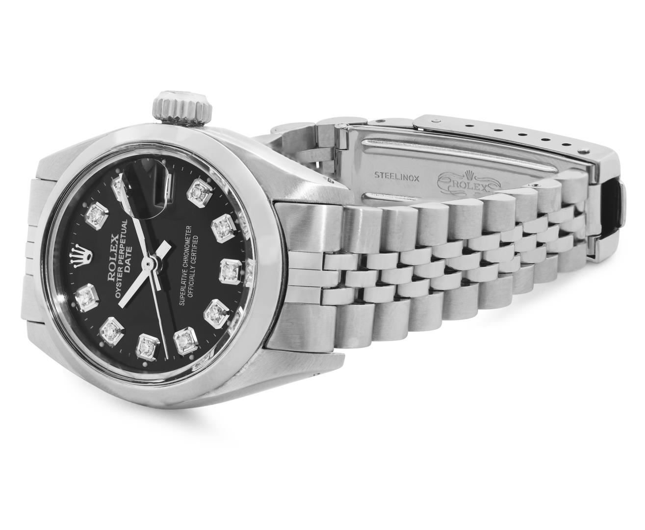One Rolex Ladies Pre Owned Stainless Steel Date Wristwatch Polished Bright with Satin Finish, Serviced and Electronically Tested, Stainless Steel Case: 26mm, Stainless Steel Crown, Rolex Bezel: Stainless Steel Smooth Bezel, Custom Crystal: New Acrylic With Magnifying Date Window. Custom Hands: New Solid Hands. Rolex Movement: Automatic Winding Movement 2035. Custom Dial: Custom Black Dial With Added Diamond Hour Markers, Dash Tracks, And Lumi Dots, Diamond Count: 10 Diamonds On Dial. Date Window: 3 O'Clock Position Date Display, Model: Date. Condition: G-6 Extra Fine. Rolex Bracelet: Stainless Steel Jubilee Band. Bright Polish and Satin Finish. 6.0 Inch Length, Adjustable. Standard Clasp, With Rolex Logo. This Watch Has Been Serviced Time Tested And Is In Excellent Condition. It Is Free Of All Scratches And Dents.