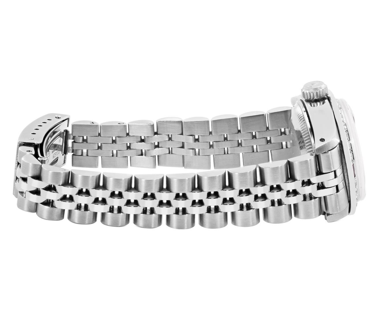 One Rolex Ladies Pre Owned Stainless Steel Date Wristwatch Polished Bright with Satin Finish, Serviced and Electronically Tested, Stainless Steel Case: 26mm, Stainless Steel Crown, Custom Bezel: New 18K White Gold Sapphire Beadset Diamond Bezel, Diamond + Gem Count: 36 Diamonds + 4 Sapphires. Custom Crystal: New Sapphire With Magnified Date Window. Rolex Movement: Automatic Winding Movement 2035. Custom Dial: Custom Black Dial With Added Diamond Hour Markers, Dash Tracks, And Lumi Dots. Date Window: 3 O'Clock Position Date Display, Model: Date. Condition: G-6 Extra Fine. Rolex Bracelet: Stainless Steel Jubilee Band. Bright Polish and Satin Finish. 6.0 Inch Length, Adjustable. Standard Clasp, With Rolex Logo. This Watch Has Been Serviced Time Tested And Is In Excellent Condition. It Is Free Of All Scratches And Dents. This Watch Comes With A Rolex Box.
