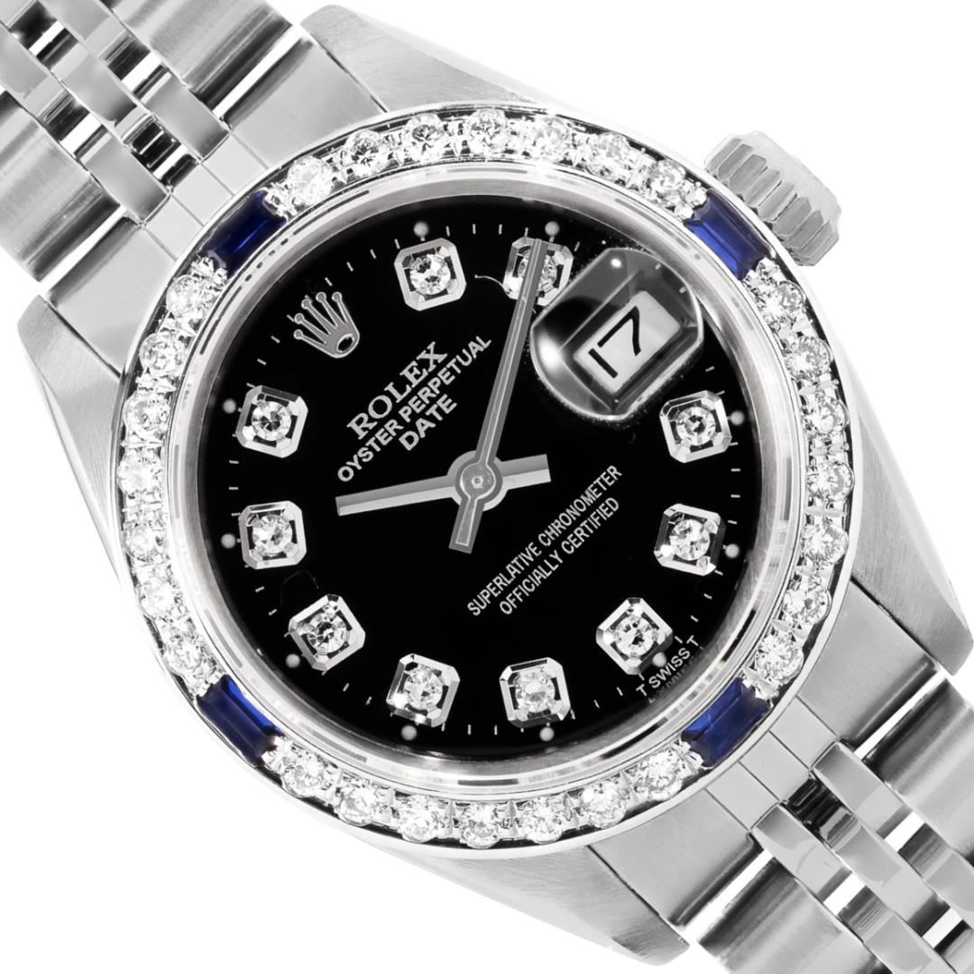 One Rolex Ladies Pre Owned Stainless Steel Date Wristwatch Polished Bright with Satin Finish, Serviced and Electronically Tested, Stainless Steel Case: 26mm, Stainless Steel Crown, Custom Bezel: New 18K White Gold Sapphire Beadset Diamond Bezel, Diamond + Gem Count: 36 Diamonds + 4 Sapphires. Custom Crystal: New Sapphire With Magnified Date Window. Rolex Movement: Automatic Winding Movement 2035. Custom Dial: Custom Black Dial With Added Diamond Hour Markers, Dash Tracks, And Lumi Dots. Date Window: 3 O'Clock Position Date Display, Model: Date. Condition: G-6 Extra Fine. Rolex Bracelet: Stainless Steel Jubilee Band. Bright Polish and Satin Finish. 6.0 Inch Length, Adjustable. Standard Clasp, With Rolex Logo. This Watch Has Been Serviced Time Tested And Is In Excellent Condition. It Is Free Of All Scratches And Dents. This Watch Comes With A Rolex Box.