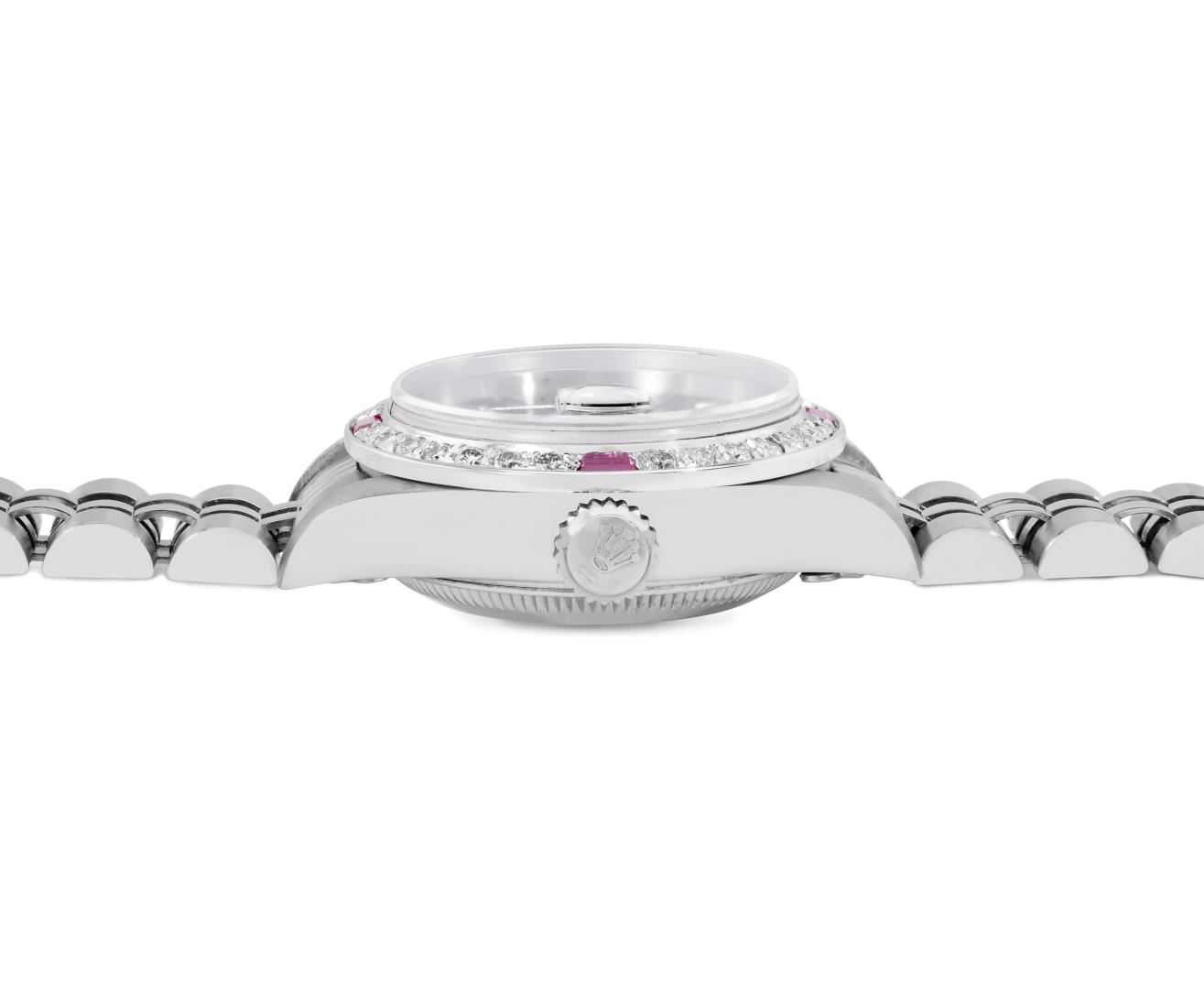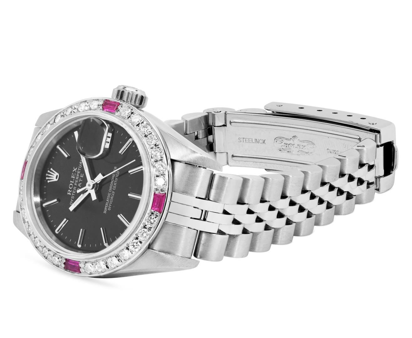 One Rolex Ladies Pre Owned Quickset Stainless Steel Date Wristwatch Polished Bright with Satin Finish, Serviced And Electronically Tested, Stainless Steel Case: 26mm, Stainless Steel Crown, Custom Bezel: New 18K White Gold Ruby Beadset Diamond Bezel, Diamond + Gem Count: 36 Diamonds + 4 Rubies. Custom Crystal: New Sapphire With Magnified Date Window. Custom Hands: New Luminescent Hands. Rolex Movement: 2235 Automatic Winding Movement. Rolex Dial: Factory Black Dial With Index Hour Markers, and Dash Track. Date Window: 3 O'Clock Position Date Display, Model: Quickset Datejust. Condition: G-6 Extra Fine. Rolex Bracelet: Stainless Steel Jubilee Band. Bright Polish And Satin Finish. 6.0 Inch Length, Adjustable. Standard Clasp, With Rolex Logo. This Watch Has Been Serviced Time Tested And Is In Excellent Condition. It Is Free Of All Scratches And Dents. This Watch Comes With A Rolex Box.