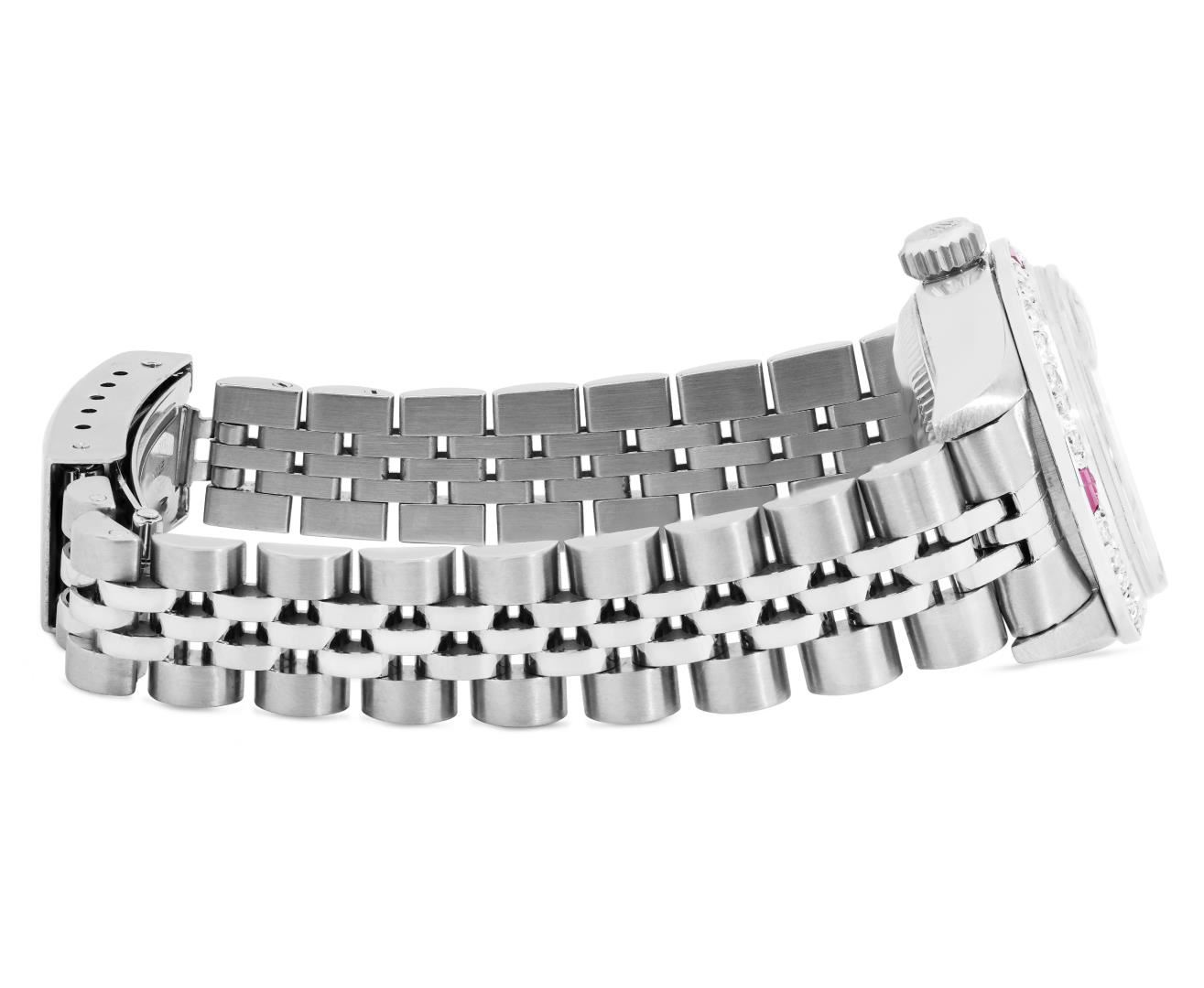 One Rolex Ladies Pre Owned Quickset Stainless Steel Date Wristwatch Polished Bright with Satin Finish, Serviced And Electronically Tested, Stainless Steel Case: 26mm, Stainless Steel Crown, Custom Bezel: New 18K White Gold Ruby Beadset Diamond Bezel, Diamond + Gem Count: 36 Diamonds + 4 Rubies. Custom Crystal: New Sapphire With Magnified Date Window. Custom Hands: New Luminescent Hands. Rolex Movement: 2235 Automatic Winding Movement. Rolex Dial: Factory Black Dial With Index Hour Markers, and Dash Track. Date Window: 3 O'Clock Position Date Display, Model: Quickset Datejust. Condition: G-6 Extra Fine. Rolex Bracelet: Stainless Steel Jubilee Band. Bright Polish And Satin Finish. 6.0 Inch Length, Adjustable. Standard Clasp, With Rolex Logo. This Watch Has Been Serviced Time Tested And Is In Excellent Condition. It Is Free Of All Scratches And Dents. This Watch Comes With A Rolex Box.