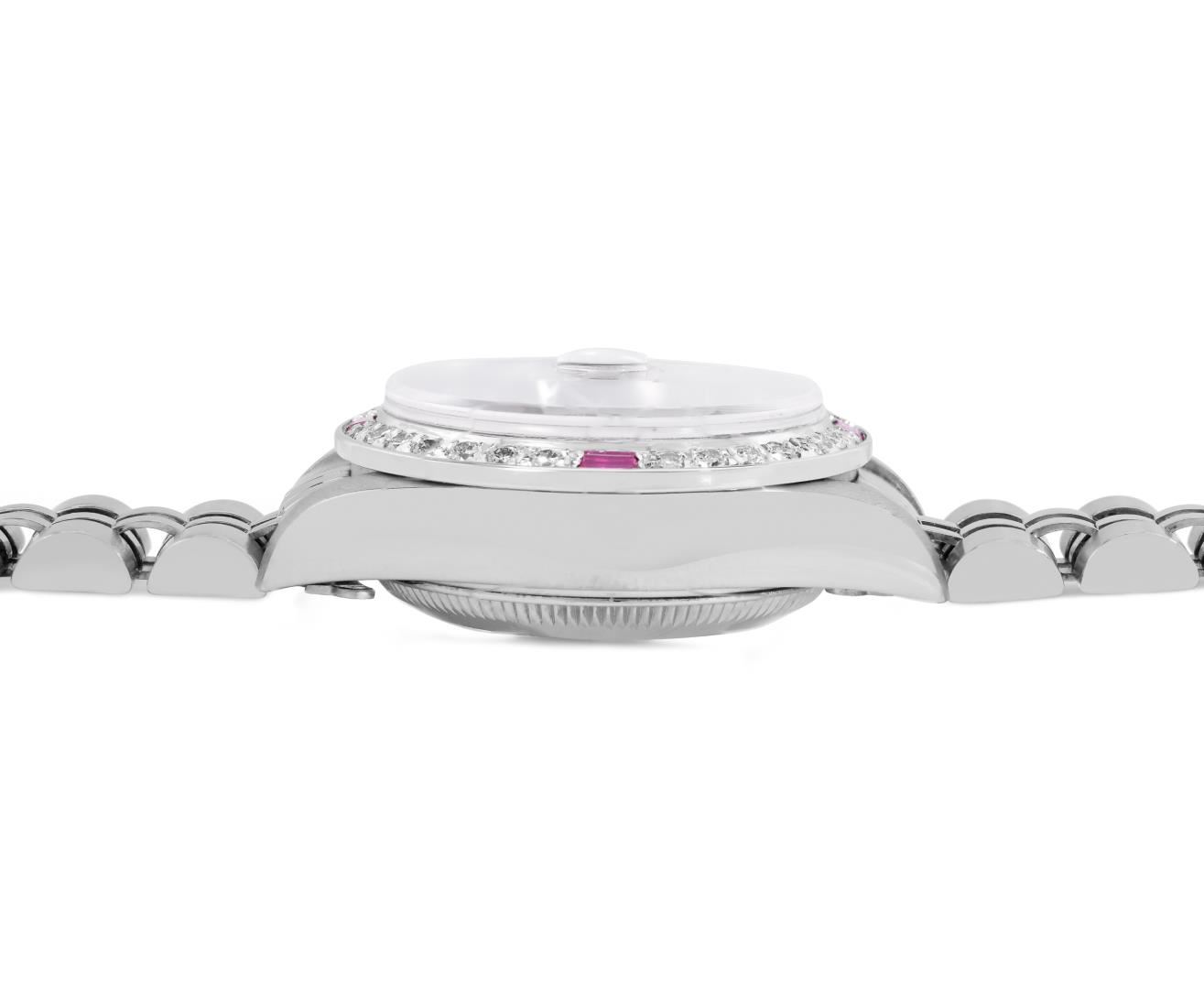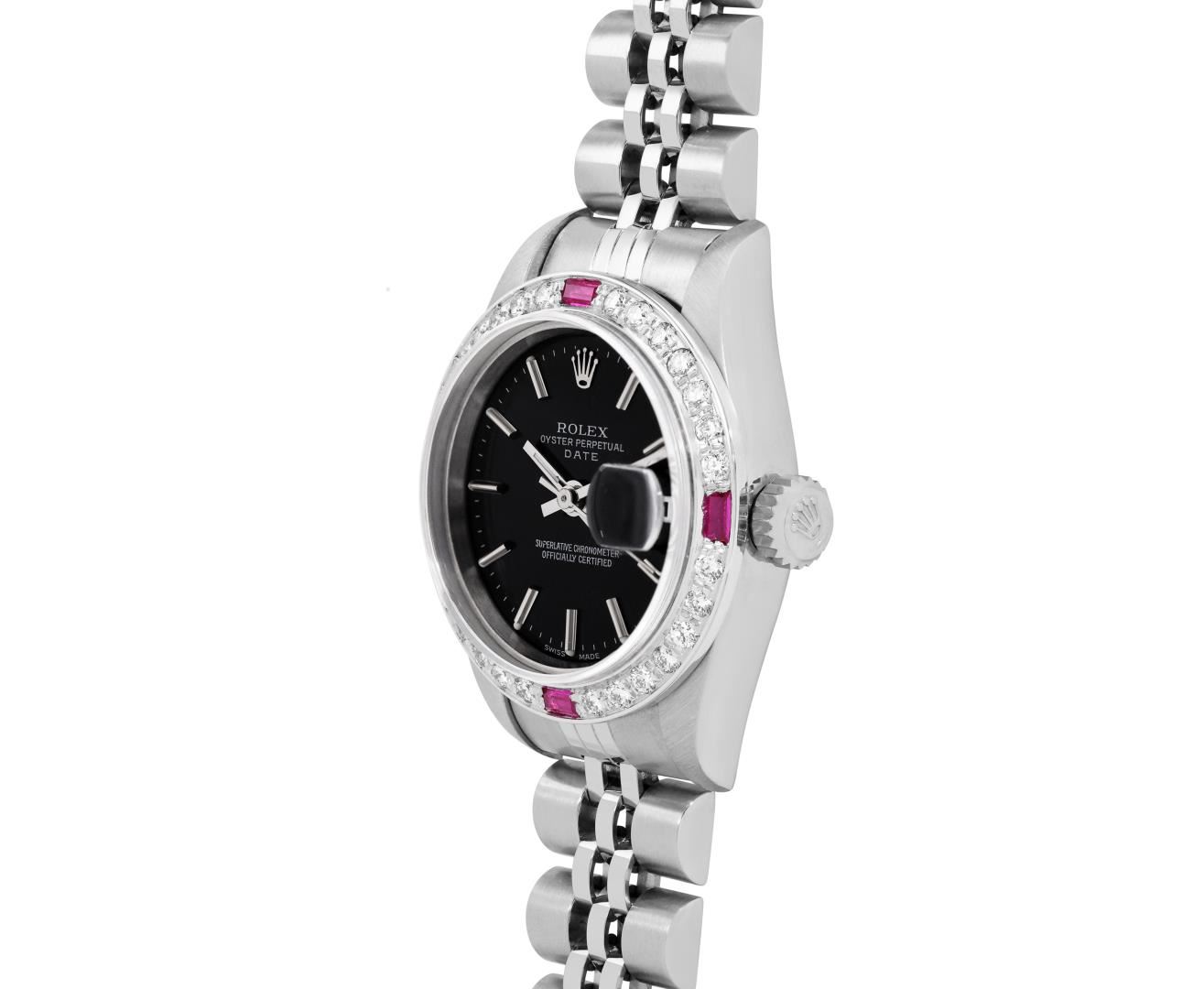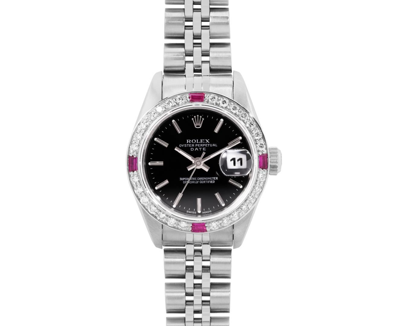 One Rolex Ladies Pre Owned Quickset Stainless Steel Date Wristwatch Polished Bright with Satin Finish, Serviced And Electronically Tested, Stainless Steel Case: 26mm, Stainless Steel Crown, Custom Bezel: New 18K White Gold Ruby Beadset Diamond Bezel, Diamond + Gem Count: 36 Diamonds + 4 Rubies. Custom Crystal: New Sapphire With Magnified Date Window. Custom Hands: New Luminescent Hands. Rolex Movement: 2235 Automatic Winding Movement. Rolex Dial: Factory Black Dial With Index Hour Markers, and Dash Track. Date Window: 3 O'Clock Position Date Display, Model: Quickset Datejust. Condition: G-6 Extra Fine. Rolex Bracelet: Stainless Steel Jubilee Band. Bright Polish And Satin Finish. 6.0 Inch Length, Adjustable. Standard Clasp, With Rolex Logo. This Watch Has Been Serviced Time Tested And Is In Excellent Condition. It Is Free Of All Scratches And Dents. This Watch Comes With A Rolex Box.