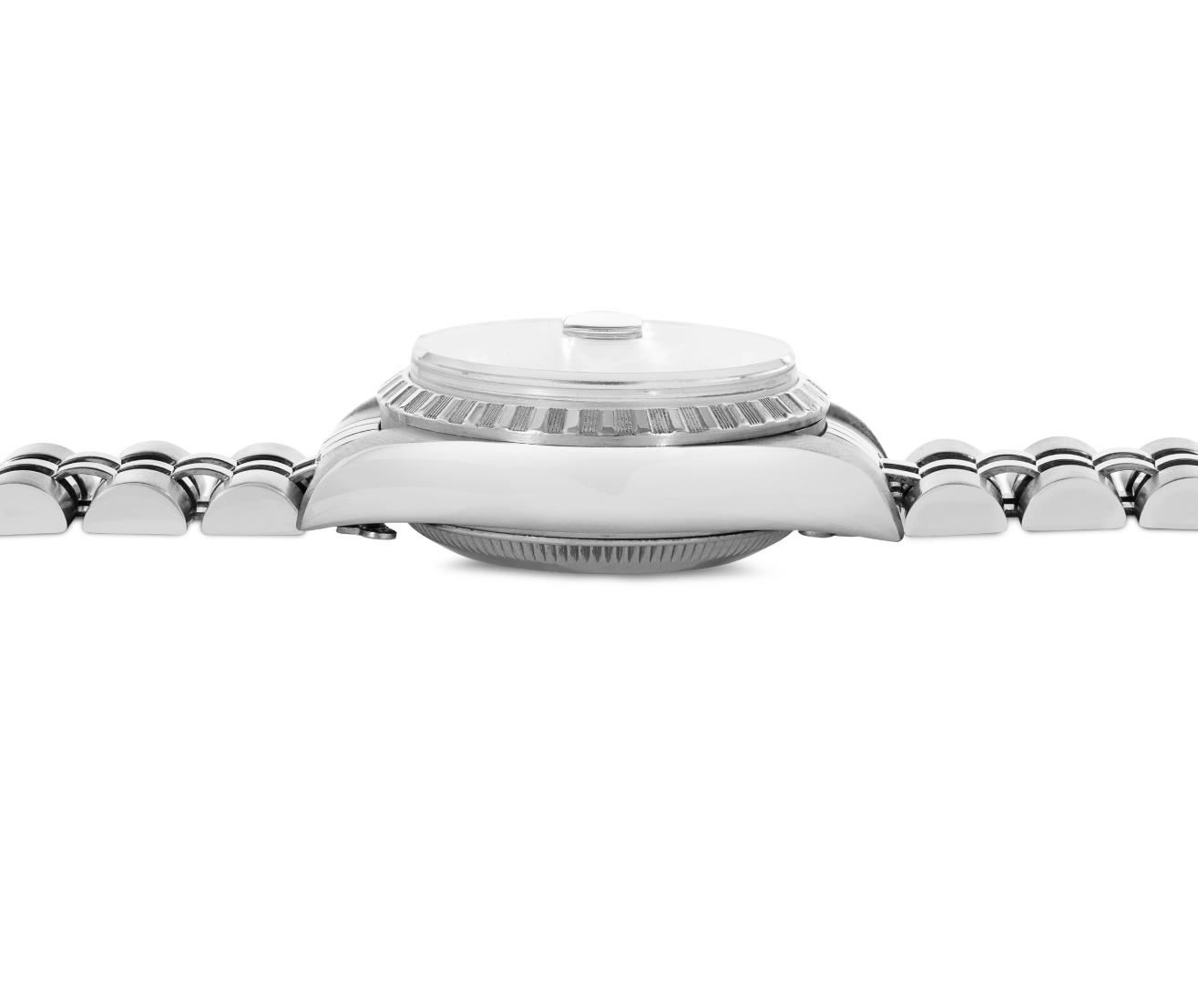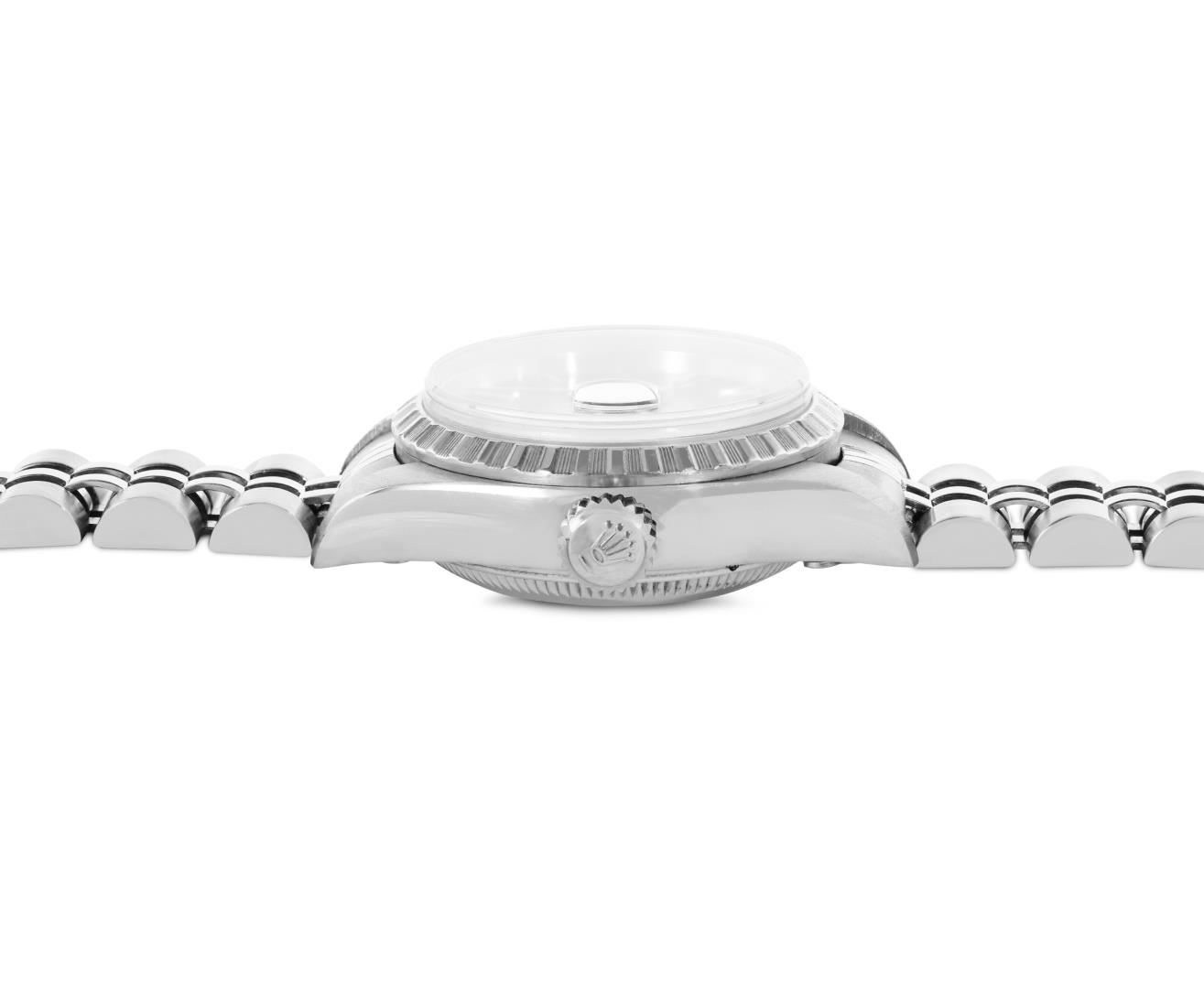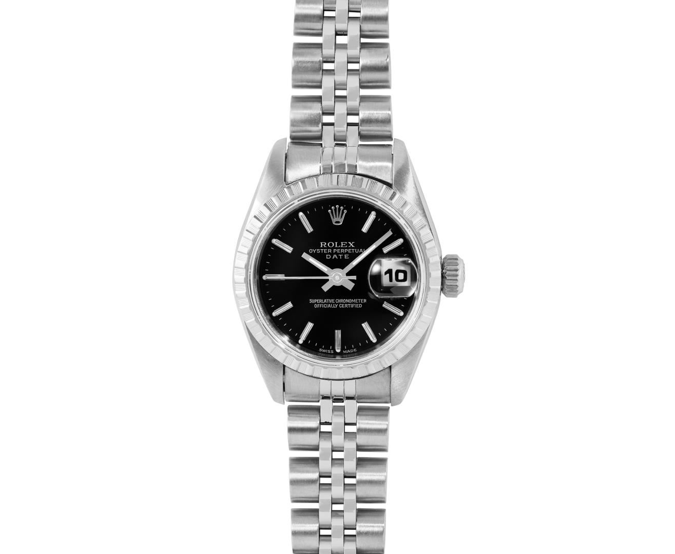 One Rolex Ladies Pre Owned Quickset Stainless Steel Date Wristwatch Polished Bright with Satin Finish, Serviced And Electronically Tested, Stainless Steel Case: 26mm, Stainless Steel Crown, Rolex Stainless Steel Engine Turn bezel. Crystal: Sapphire With Magnified Date Window. Hands: Luminescent Hands. Rolex Movement: 2235 Automatic Winding Movement. Rolex Dial: Factory Black With Index Hour Markers, Dash Track, And Lumi Dots. Date Window: 3 O'Clock Position Date Display, Model: Sapphire Date. Condition: G-6 Extra Fine. Rolex Bracelet: Stainless Steel Jubilee Band. Bright Polish & Satin Finish. 6.0 Inch Length, Adjustable. Standard Clasp, With Rolex Logo. This Watch Has Been Serviced And Time Tested. It Is In Excellent Condition, Free Of All Scratches And Dents. This Watch Comes With A Rolex Box.