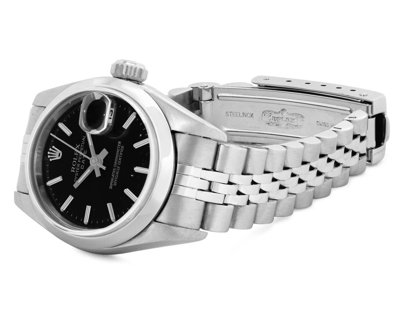 One Rolex Ladies Pre Owned Quickset Stainless Steel Date Wristwatch Polished Bright with Satin Finish, Serviced And Electronically Tested, Stainless Steel Case: 26mm, Stainless Steel Crown, Rolex Stainless Steel Smooth Bezel. Crystal: Sapphire With Magnified Date Window. Hands: Luminescent Hands. Rolex Movement: 2235 Automatic Winding Movement. Rolex Dial: Factory Black With Index Hour Markers, Dash Track, And Lumi Dots. Date Window: 3 O'Clock Position Date Display, Model: Sapphire Date. Condition: G-6 Extra Fine. Rolex Bracelet: Stainless Steel Jubilee Band. Bright Polish And Satin Finish. 6.0 Inch Length, Adjustable. Standard Clasp, With Rolex Logo. This Watch Has Been Serviced And Time Tested. It Is In Excellent Condition, Free Of All Scratches And Dents. This Watch Comes With A Rolex Box.