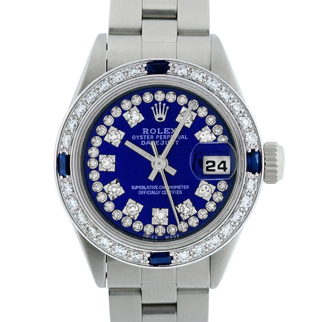One Ladies Pre Owned Stainless Steel Rolex Datejust Polished Bright with Satin Finish, Serviced & Electronically Tested, Stainless Steel Case: 26mm, Stainless Steel Crown. Custom Bezel: New 18K White Gold Beadset & Sapphire Diamond Bezel, Diamond Count: 2