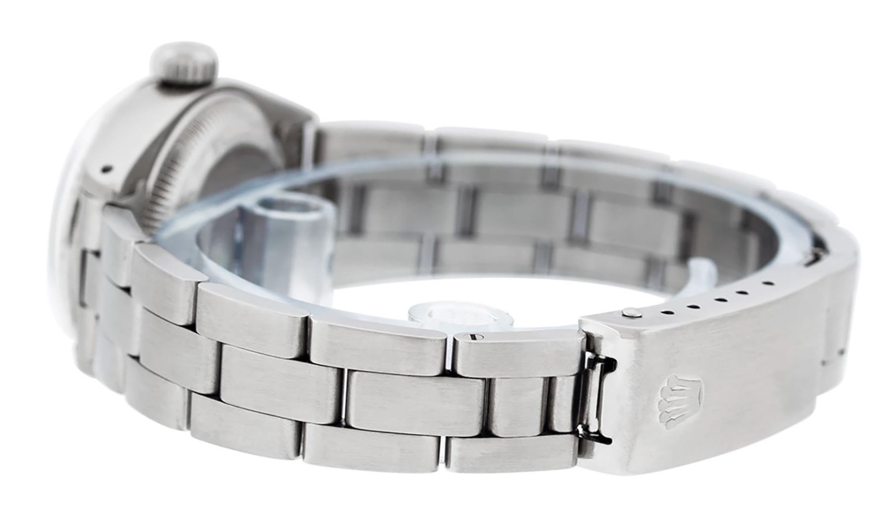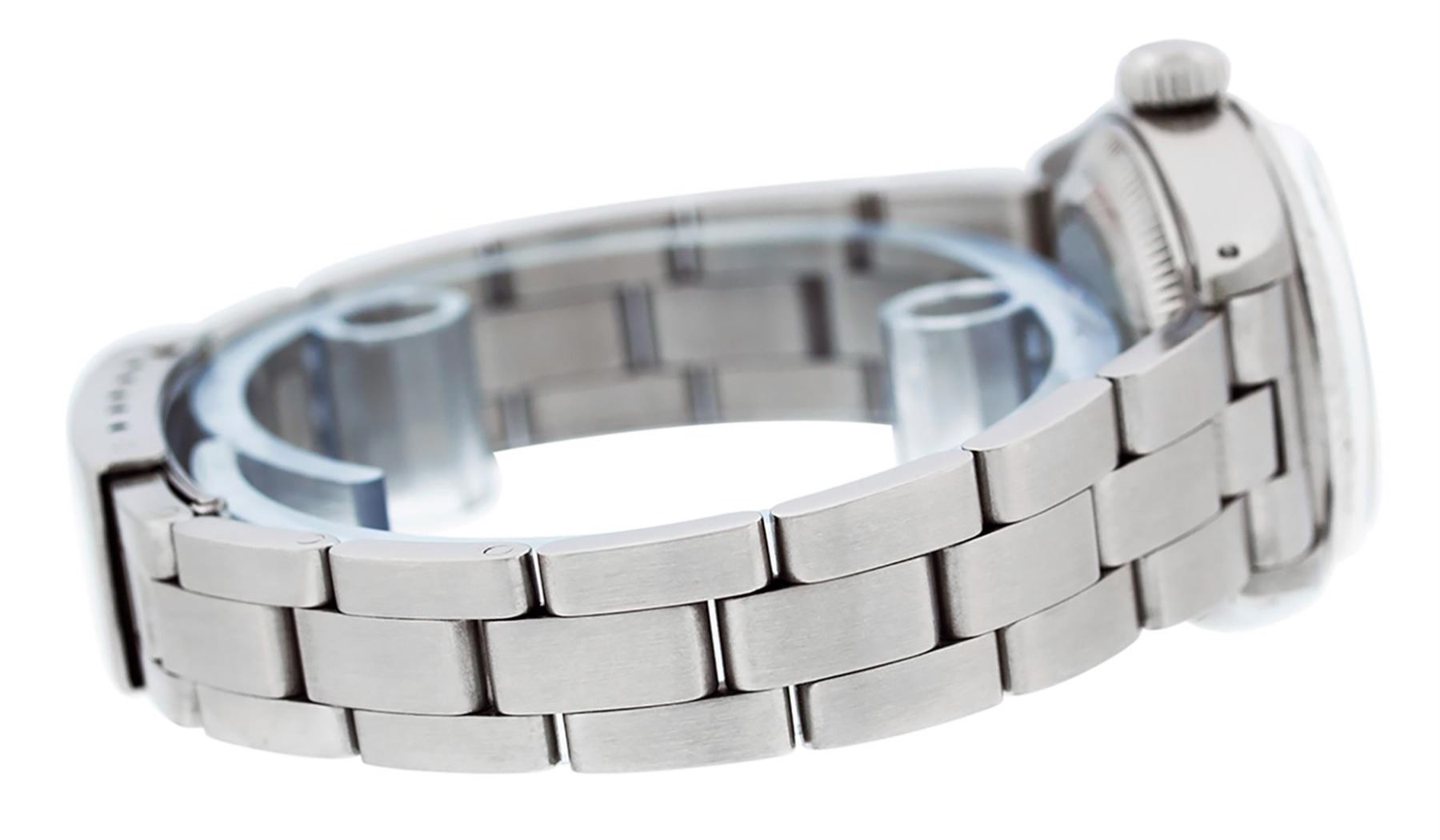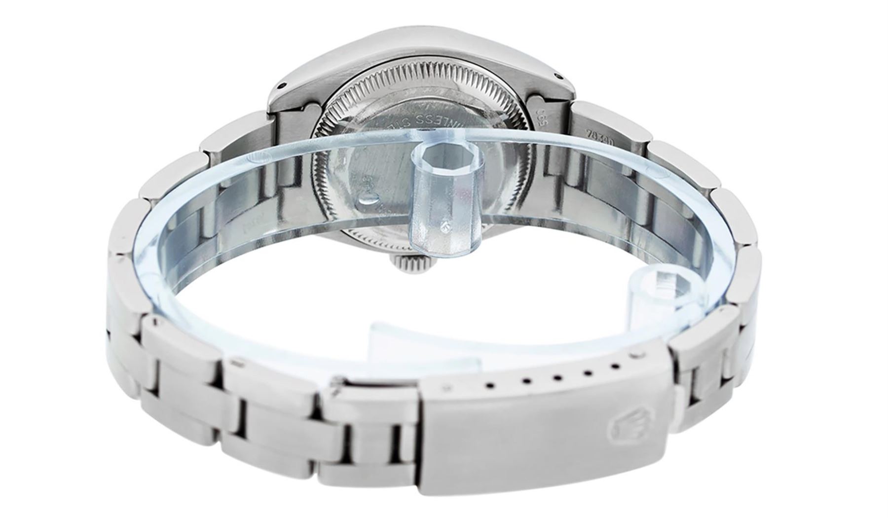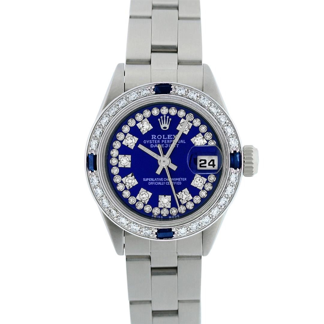 One Ladies Pre Owned Stainless Steel Rolex Datejust Polished Bright with Satin Finish, Serviced & Electronically Tested, Stainless Steel Case: 26mm, Stainless Steel Crown. Custom Bezel: New 18K White Gold Beadset & Sapphire Diamond Bezel, Diamond Count: 28 Diamonds + 4 Sapphires. Clarity: SI-VS, Color: G to H. Custom Crystal: New Sapphire With Date Window. Custom Hands: New Luminescent Hands. Rolex Movement: Automatic Winding Movement. Custom Dial: Refinished To Blue With Custom Added Diamonds, Stone Count: 43 Diamonds On Dial, G To H In Color, Clarity: SI-VS. Date Window: 3 Oclock Position Date Display, Model: Datejust. Condition: G-6 Extra Fine. Rolex Bracelet: Stainless Steel Oyster Band. Bright Polish & Satin Finish. 6.0 Inch Length, Adjustable. Standard Clasp, With Rolex Logo. This Watch Has Been Serviced Time Tested And Is In Excellent Condition It Is Free Of All Scratches And Dents.