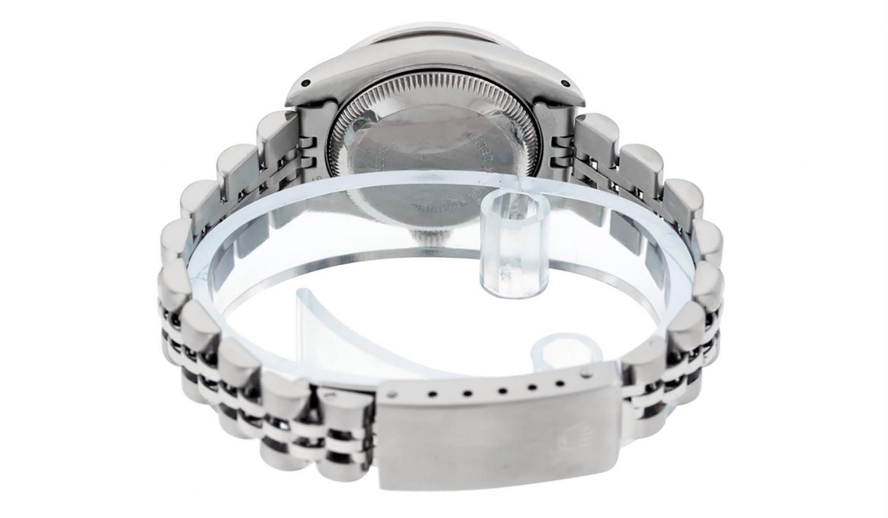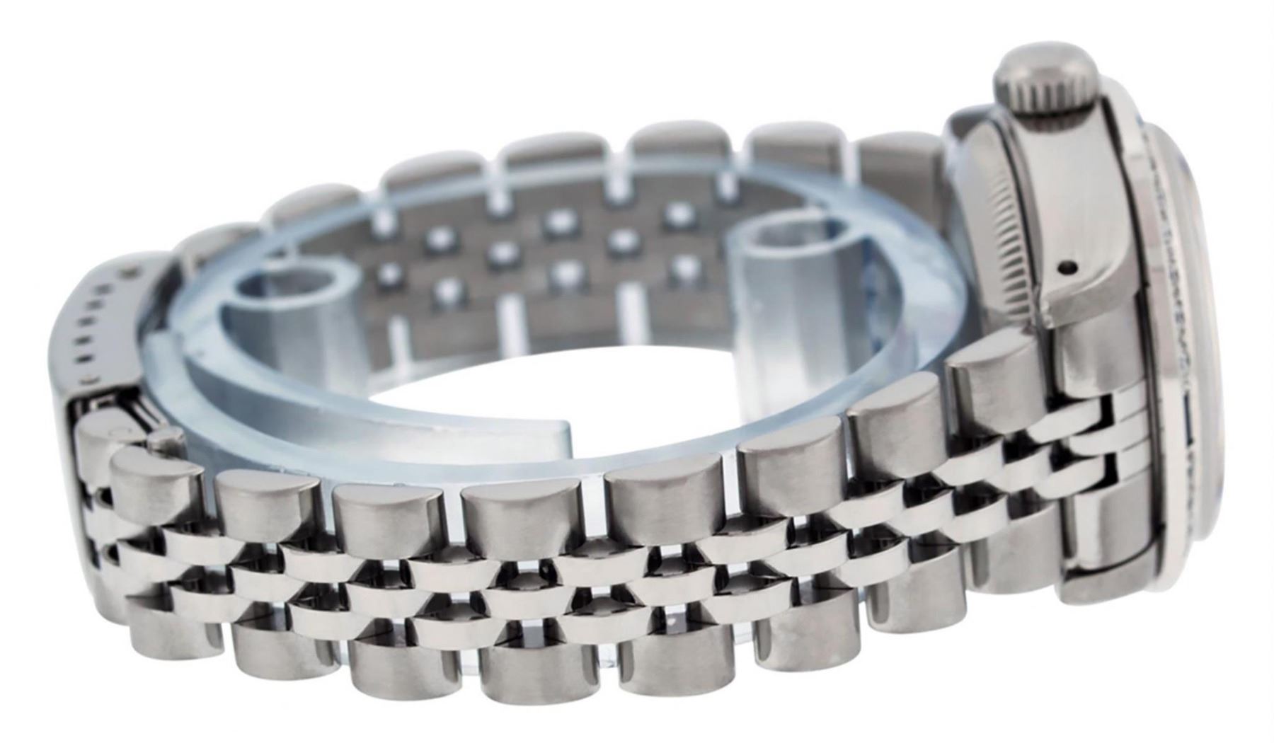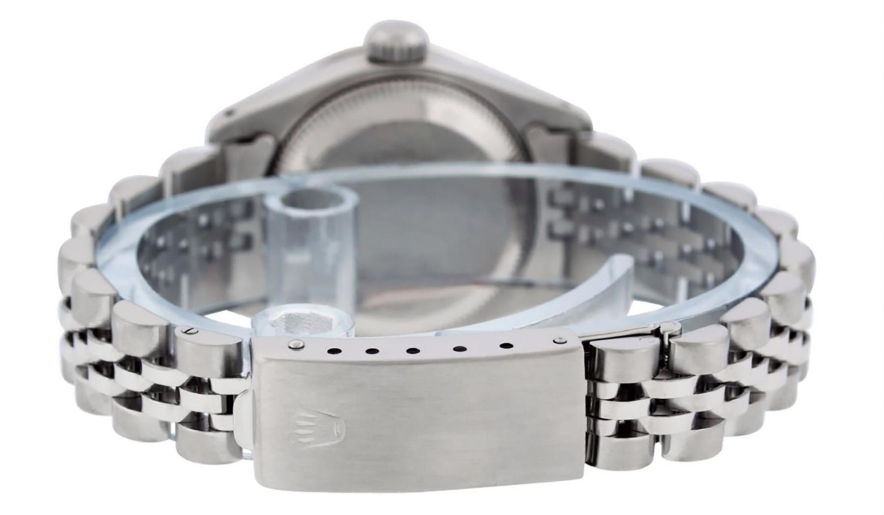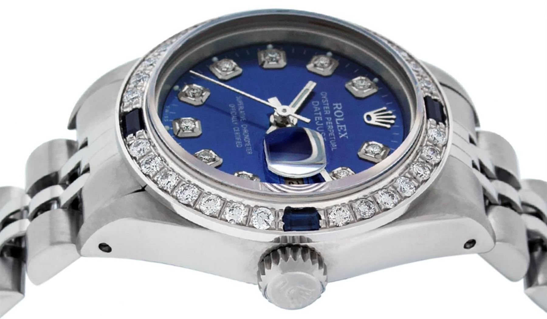 One Ladies Stainless Steel Rolex Oyster Perpetaul Datejust Polished Bright with Satin Finish, Serviced & Electronically Tested, Stainless Steel Case: 26mm, Stainless Steel Crown, Custom Bezel: New 18K White Gold Sapphire Beadset Diamond Bezel, Diamond + Gem Count: 28 Diamonds + 4 Sapphires Total Weight .70 Carat, Clarity: SI-VS, Color: G to H. Custom Crystal: New Synthetic Sapphire Cyclops Lens. Custom Hands: New Luminescent Hands. Movement: Automatic Winding Movement. Custom Dial: Refinished Blue With Diamond Hour Markers, 10 Diamond in Dial G To H In Color, Clarity: SI-VS. Date Window: 3 O'Clock Position Date Display, Model: Datejust. Condition: G-6 Extra Fine. Bracelet: Stainless Steel Jubilee. Bright Polish & Satin Finish. 6.0 Inch Length, Adjustable. Standard Clasp, With Rolex Logo. This Watch Has Been Serviced Time Tested And Is In Excellent Condition It Is Free Of All Scratches And Dents.