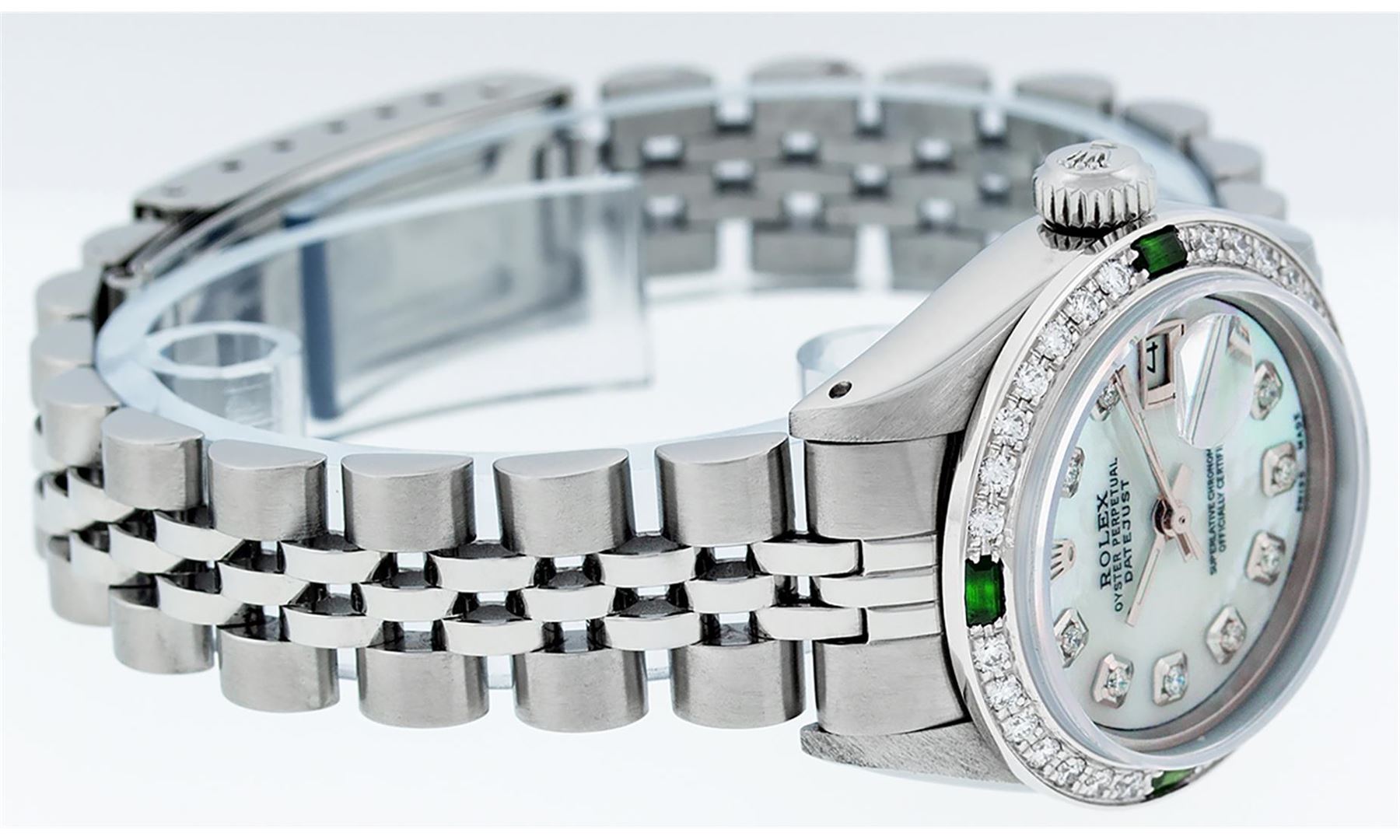 One Ladies Stainless Steel Rolex Datejust Polished Bright with Satin Finish, Serviced & Electronically Tested, Stainless Steel Case: 26mm, Stainless Steel Crown, Custom Bezel: New 18K White Gold Emerald Beadset Diamond Bezel, Diamond + Gem Count: 28 Diamonds + 4 Emeralds. Total Weight .70 Carat, Clarity: SI-VS, Color: G to H. Custom Crystal: New Scratch Resistant Synthetic Sapphire Cyclops Lens. Custom Hands: New Luminescent Hands. Movement: Automatic Winding Movement. Custom Dial: Refinished Blue Mother Of Pearl With Diamond Hour Markers, 10 Diamonds in Dial, G To H In Color, Clarity: SI-VS. Date Window: 3 O'Clock Position Date Display, Model: Datejust. Condition: G-6 Extra Fine. Bracelet: Stainless Steel Jubilee Band. Bright Polish & Satin Finish. 6.0 Inch Length, Adjustable. Standard Clasp, With Rolex Logo. This Watch Has Been Serviced Time Tested And Is In Excellent Condition It Is Free Of All Scratches And Dents.