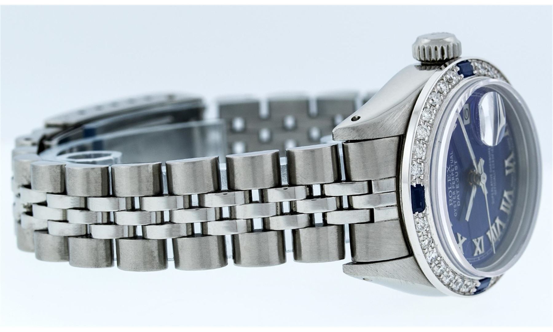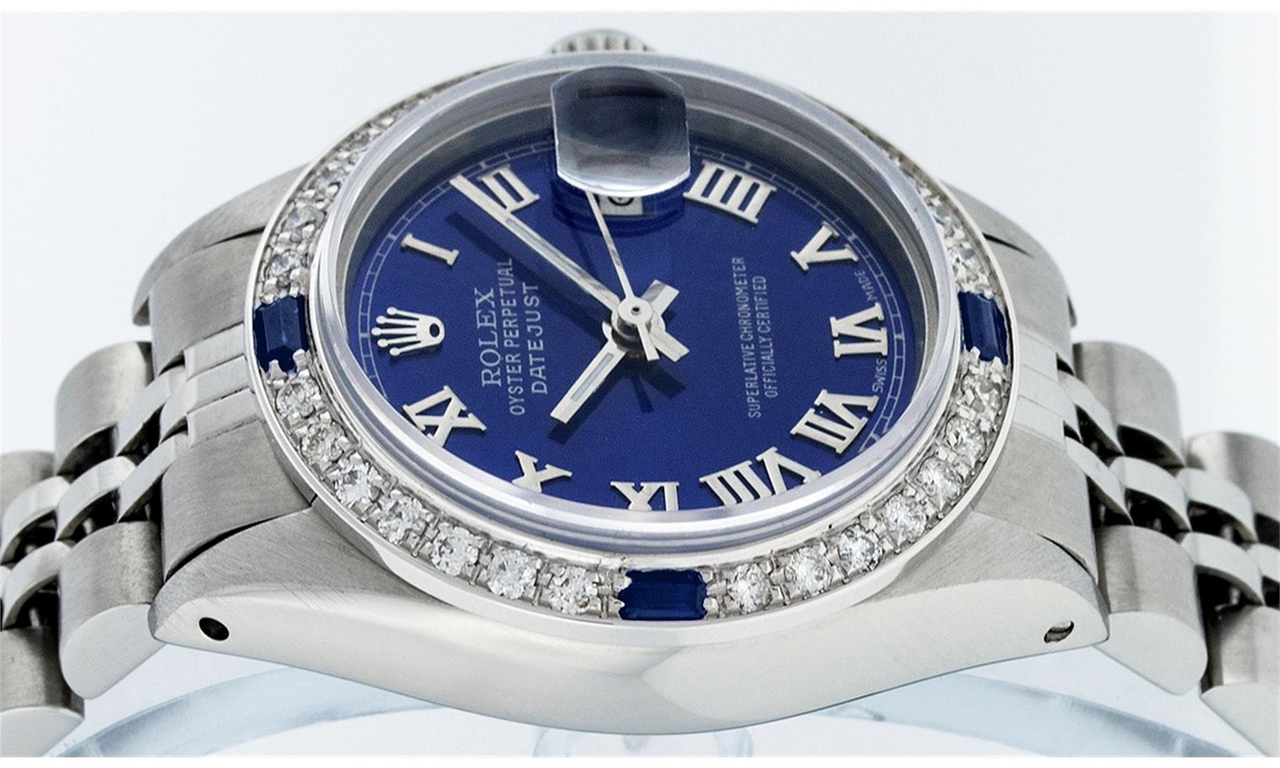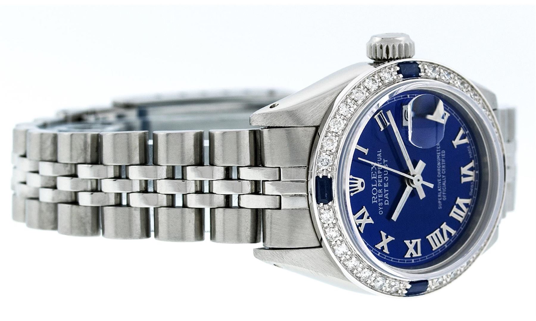 One Ladies Rolex Datejust Polished Bright with Satin Finish, Serviced & Electronically Tested, Stainless Steel Case:26mm, Stainless Steel Crown, Custom Bezel: 18K White Gold Sapphire Beadset Diamond Bezel, Diamond + Gem Count: 28 Diamonds + 4 Sapphires Total Weight .70 Carat, Clarity: SI-VS, Color: G to H. Custom Crystal: Synthetic Sapphire Cyclops Lens. Movement: Automatic Winding Movement Caliber 2030. Custom Dial: Refinished Blue Roman Dial With Square Track. Date Window: 3 O'Clock Position Date Display, Model: Datejust. Condition: G-6 Extra Fine. Bracelet: Stainless Steel Jubilee. Bright Polish & Satin Finish. 6.0 Inch Length, Adjustable. Standard Clasp, With Rolex Logo.