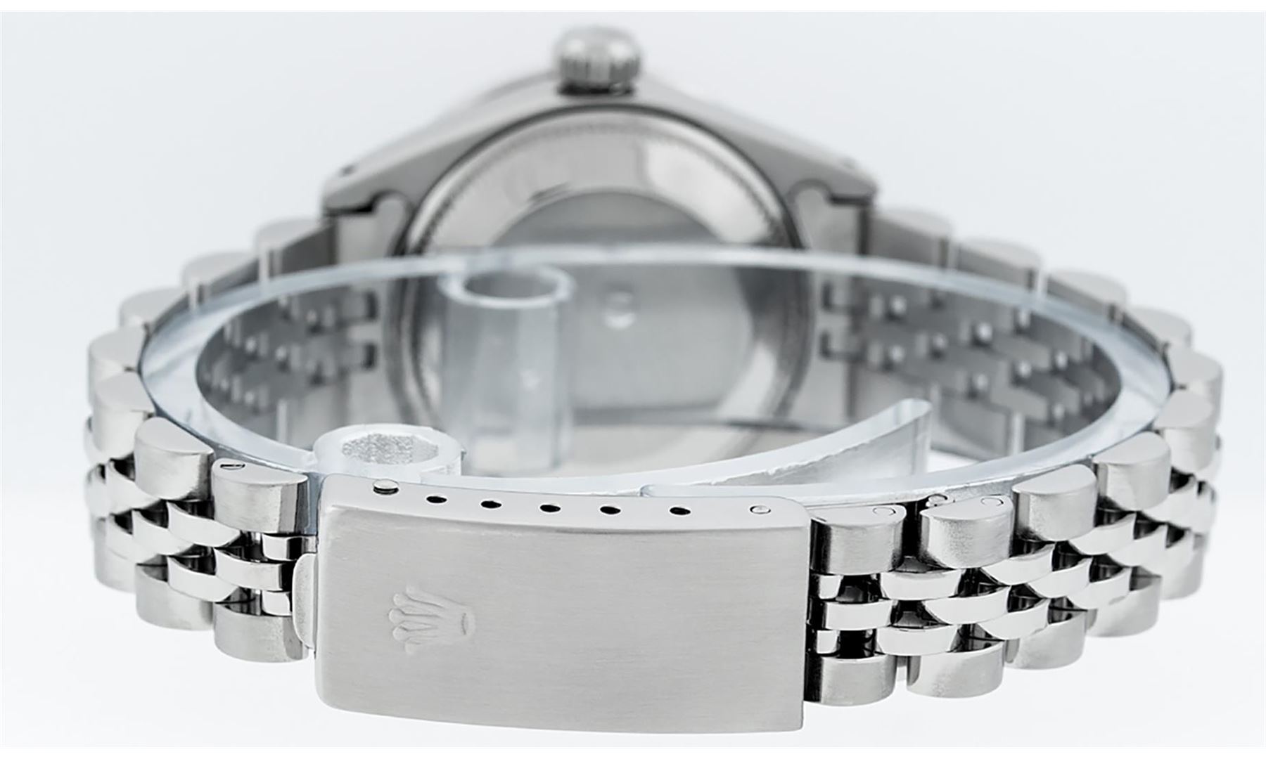 One Ladies Stainless Steel Rolex Datejust Polished Bright with Satin Finish, Serviced & Electronically Tested, Stainless Steel Case: 26mm, Stainless Steel Crown, Custom Bezel: New 18K White Sapphire Beadset Diamond Bezel, Diamond + Gem Count: 28 Diamonds + 4 Sapphires. Total Weight .70 Carat, Clarity: SI-VS, Color: G to H. Custom Crystal: New Scratch Resistant Synthetic Sapphire Cyclops Lens. Custom Hands: New Luminescent Hands. Movement: Automatic Winding Movement. Custom Dial: Blue Stamp With Single Cut Diamond Hour Markers, 10 Diamonds in Dial, G To H In Color, Clarity: SI-VS. Date Window: 3 O'Clock Position Date Display, Model: Datejust. Condition: G-6 Extra Fine. Bracelet: Stainless Steel Jubilee Band. Bright Polish & Satin Finish. 6.0 Inch Length, Adjustable. Standard Clasp, With Rolex Logo. This Watch Has Been Serviced Time Tested And Is In Excellent Condition It Is Free Of All Scratches And Dents.