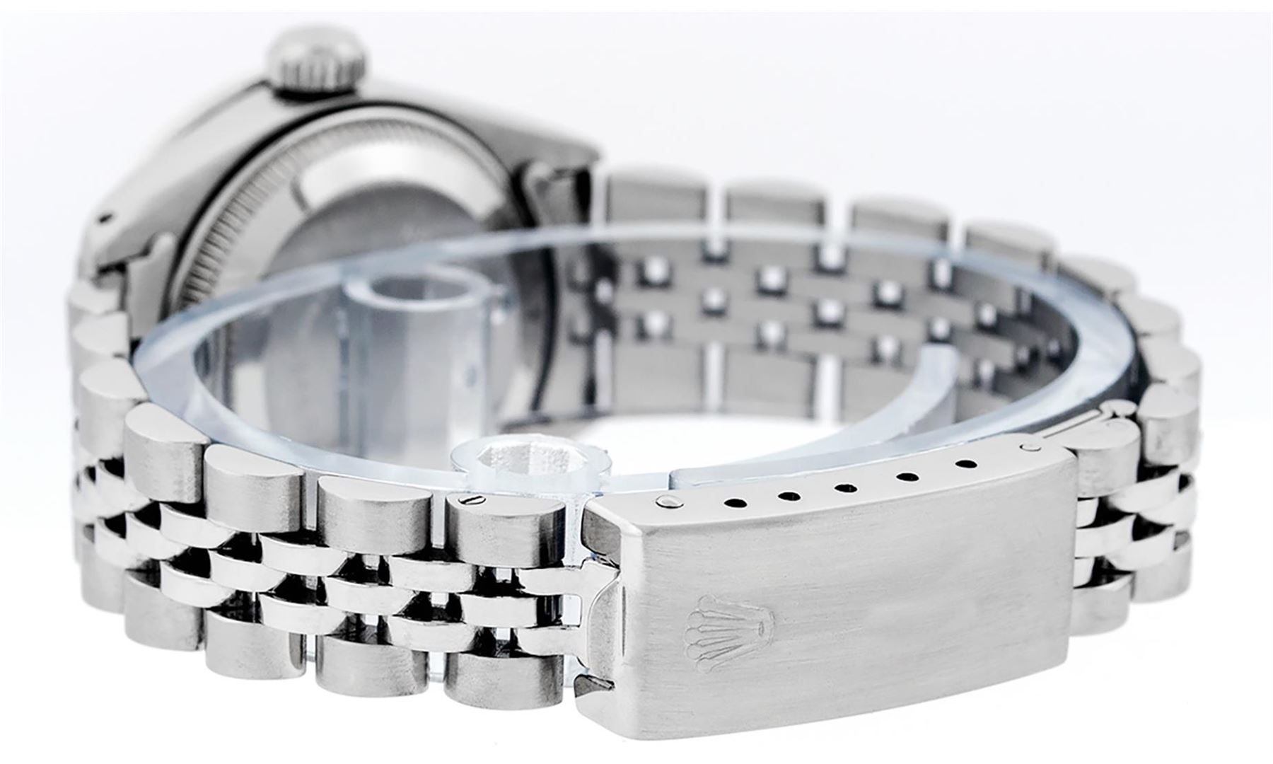 One Ladies Stainless Steel Rolex Datejust Polished Bright with Satin Finish, Serviced & Electronically Tested, Stainless Steel Case: 26mm, Stainless Steel Crown, Custom Bezel: New 18K White Sapphire Beadset Diamond Bezel, Diamond + Gem Count: 28 Diamonds + 4 Sapphires. Total Weight .70 Carat, Clarity: SI-VS, Color: G to H. Custom Crystal: New Scratch Resistant Synthetic Sapphire Cyclops Lens. Custom Hands: New Luminescent Hands. Movement: Automatic Winding Movement. Custom Dial: Blue Stamp With Single Cut Diamond Hour Markers, 10 Diamonds in Dial, G To H In Color, Clarity: SI-VS. Date Window: 3 O'Clock Position Date Display, Model: Datejust. Condition: G-6 Extra Fine. Bracelet: Stainless Steel Jubilee Band. Bright Polish & Satin Finish. 6.0 Inch Length, Adjustable. Standard Clasp, With Rolex Logo. This Watch Has Been Serviced Time Tested And Is In Excellent Condition It Is Free Of All Scratches And Dents.