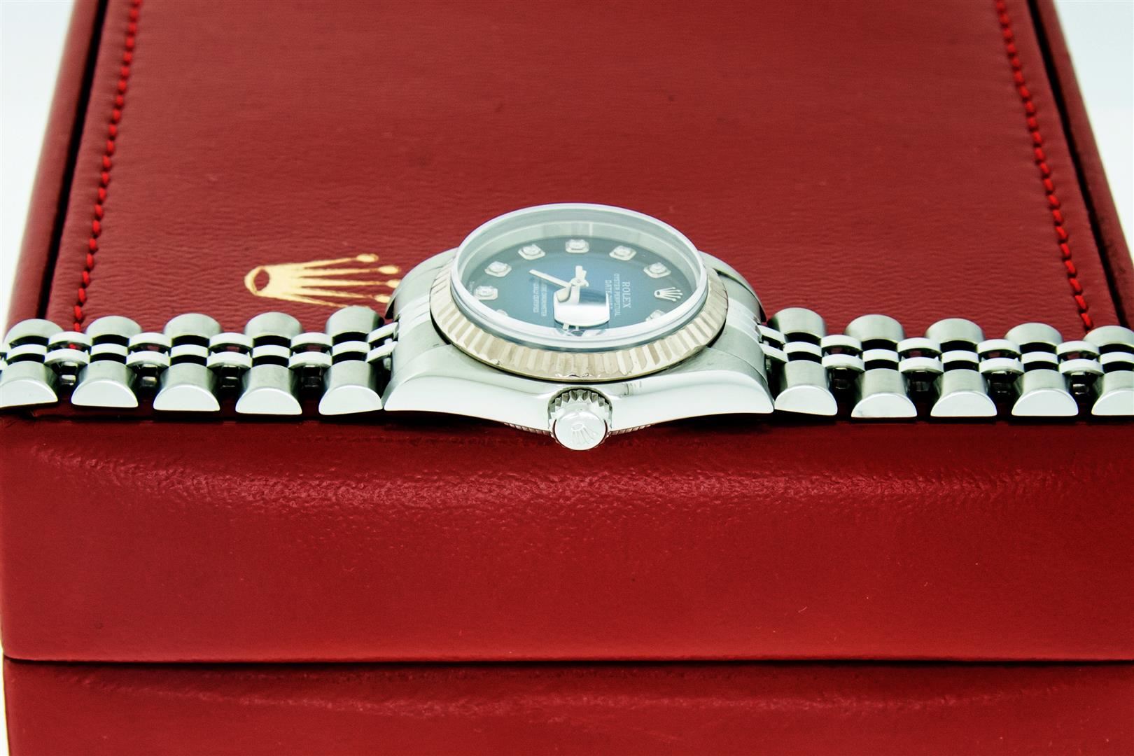 One Ladies Quickset Pre Owned Stainless Steel Rolex Datejust Polished Bright with Satin Finish, Serviced & Electronically Tested, Stainless Steel Case: 26mm, Stainless Steel Crown, Bezel: Rolex 18K White Gold Fluted Bezel. Crystal: Sapphire With Magnified Date Window. Hands: Non luminous hands. Rolex Movement: Automatic Winding Movement 2235. Custom Dial: Refinished To Blue Vignette With Custom Added Diamonds, Diamond Count: 10 Diamonds In Dial, Clarity: VS, Date Window: 3 O'Clock Position Date Display, Model: Quickset Datejust. Condition: G-6 Extra Fine. Rolex Bracelet: Stainless Steel Jubilee Band. Bright Polish & Satin Finish. 6 Inch Length, Standard Clasp, With Rolex Logo. This Watch Has Been Serviced Time Tested And Is In Excellent Condition It Is Free Of All Scratches And Dents. This Watch Comes With A Rolex Box.