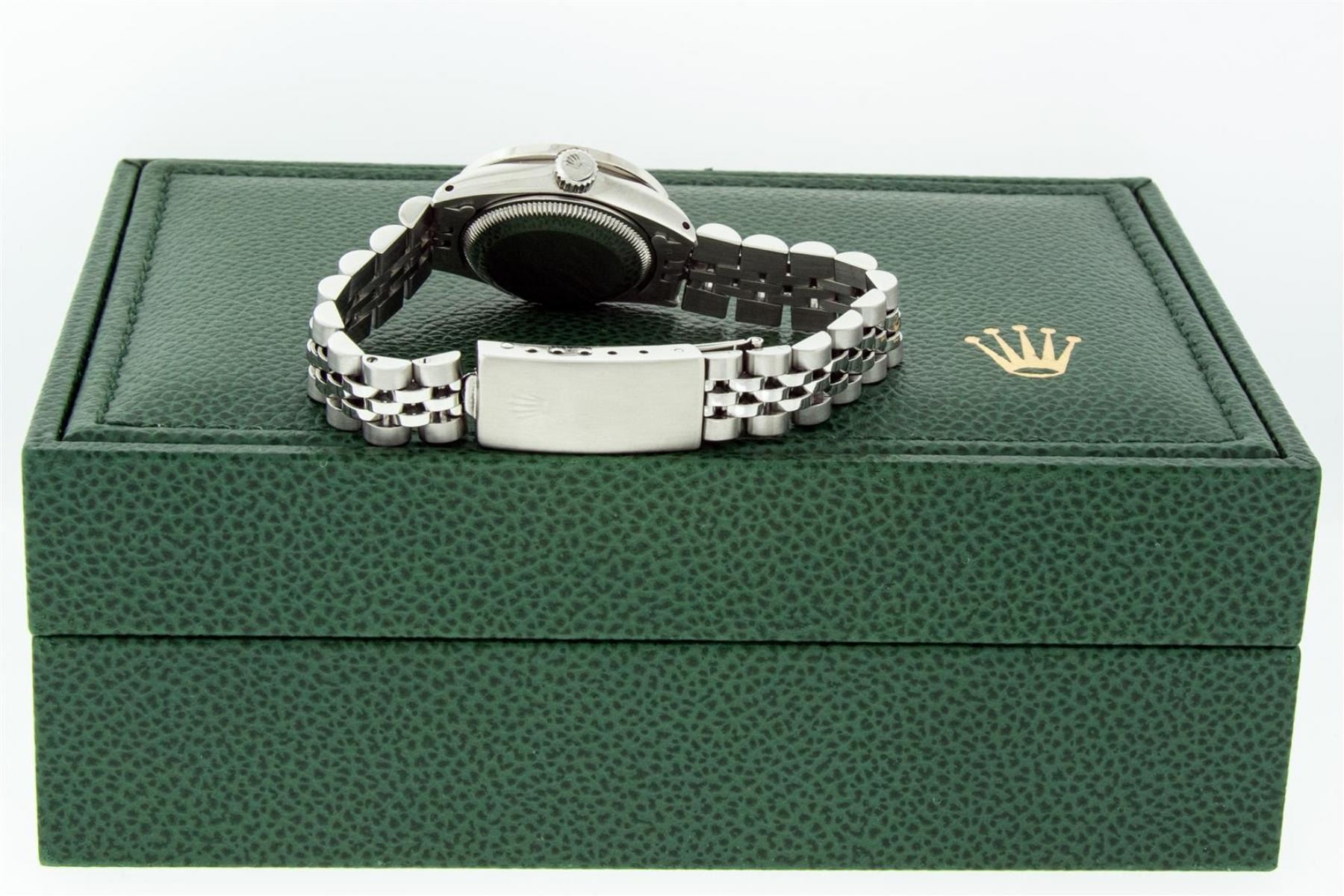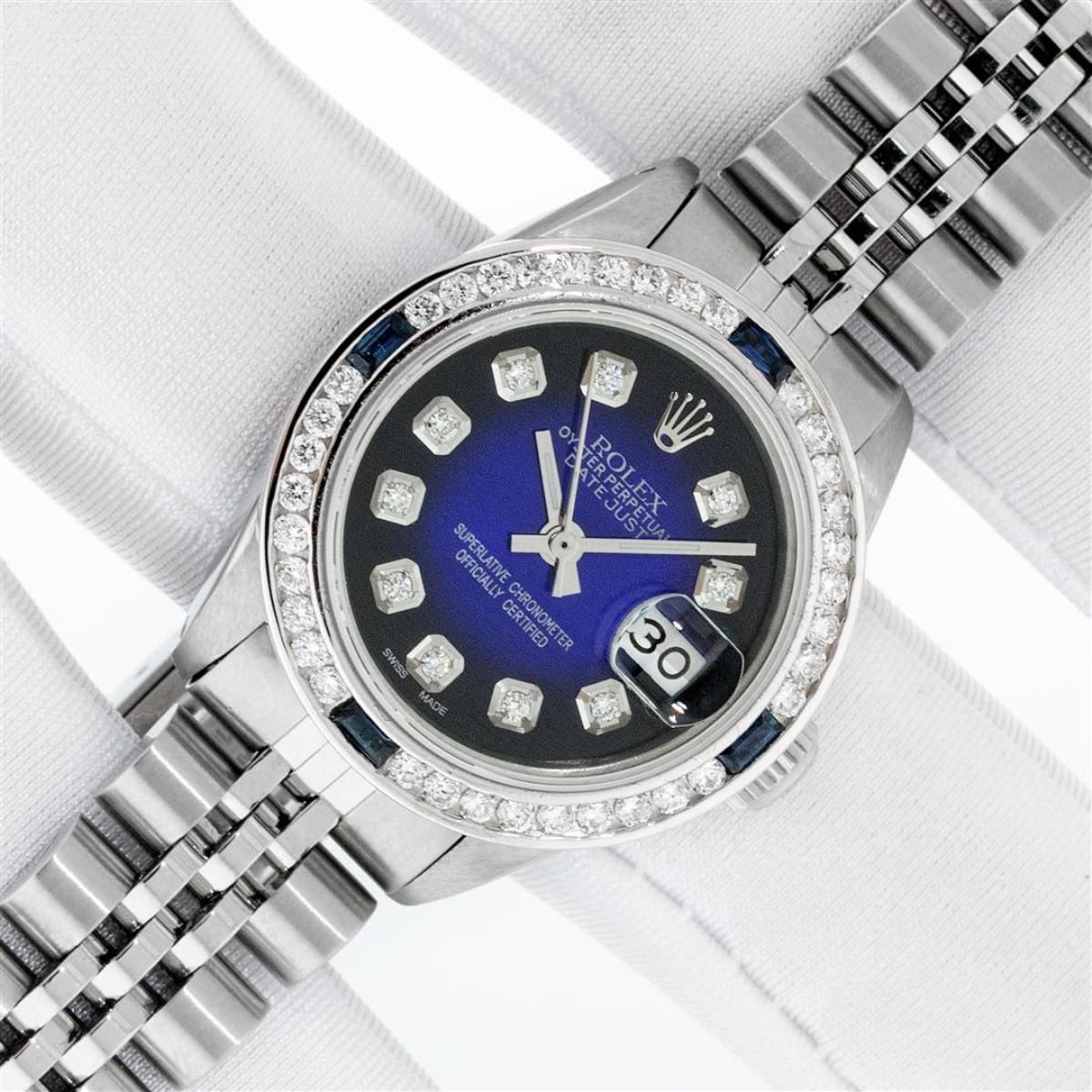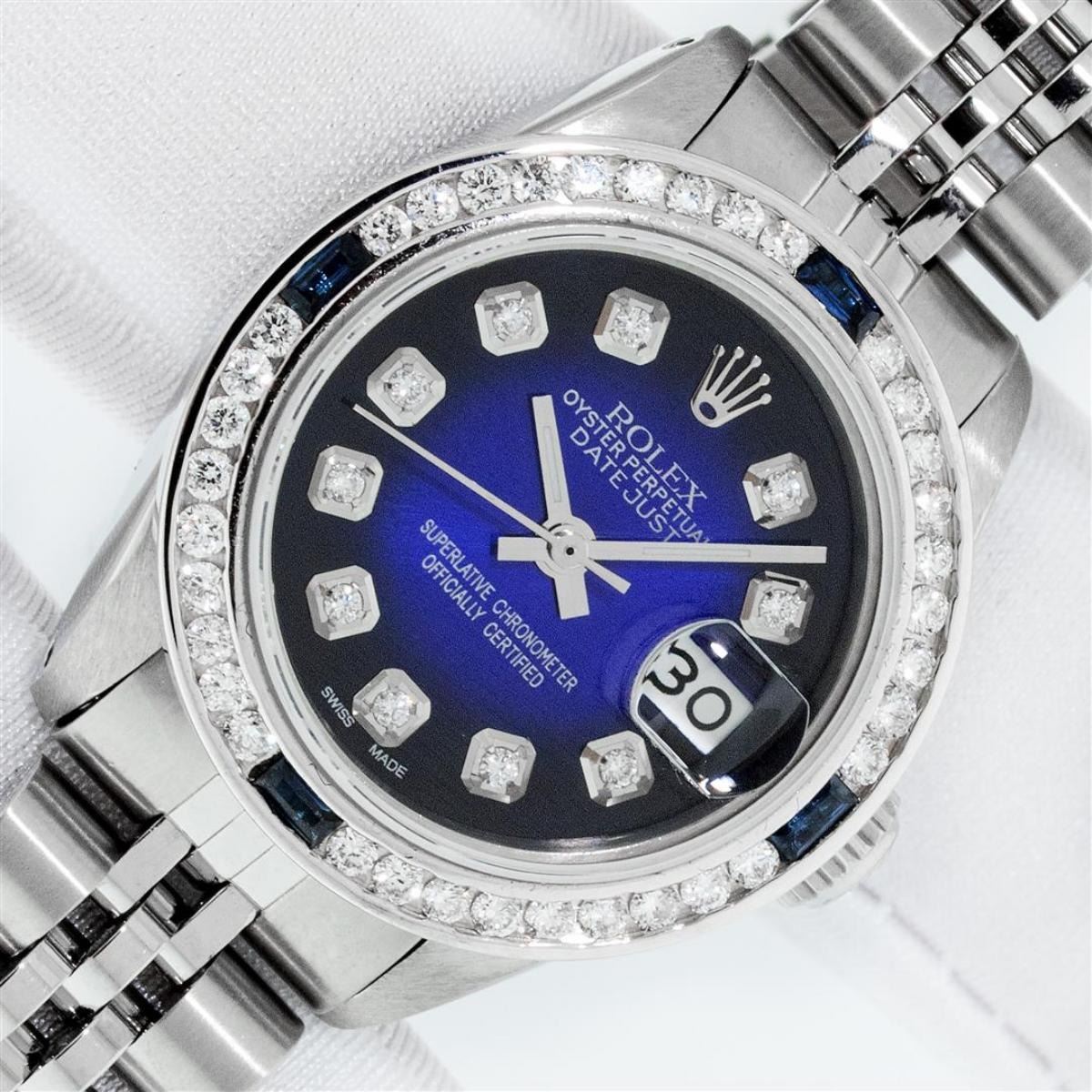 One Ladies Stainless Steel Rolex Datejust Polished Bright with Satin Finish, Serviced & Electronically Tested, Stainless Steel Case: 26mm, Stainless Steel Crown, Custom Bezel: New 18K White Gold Sapphire Channel Set Diamond Bezel, Diamond + Gem Count: 36 Diamonds + 4 Sapphires Total Weight 1.00 Carat, Clarity: SI-VS, Color: G to H. Custom Crystal: New Synthetic Sapphire Cyclops Lens. Custom Hands: New Luminescent Hands. Movement: Automatic Winding Movement. Custom Dial: Refinished Blue Vignette With Diamond Hour Markers. Date Window: 3 O'Clock Position Date Display, Model: Datejust. Condition: G-6 Extra Fine. Bracelet: Stainless Steel Jubilee. Bright Polish & Satin Finish. 6.0 Inch Length, Adjustable. Standard Clasp, With Rolex Logo. This Watch Has Been Serviced Time Tested And Is In Excellent Condition It Is Free Of All Scratches And Dents. This Watch Comes With A Rolex Box.