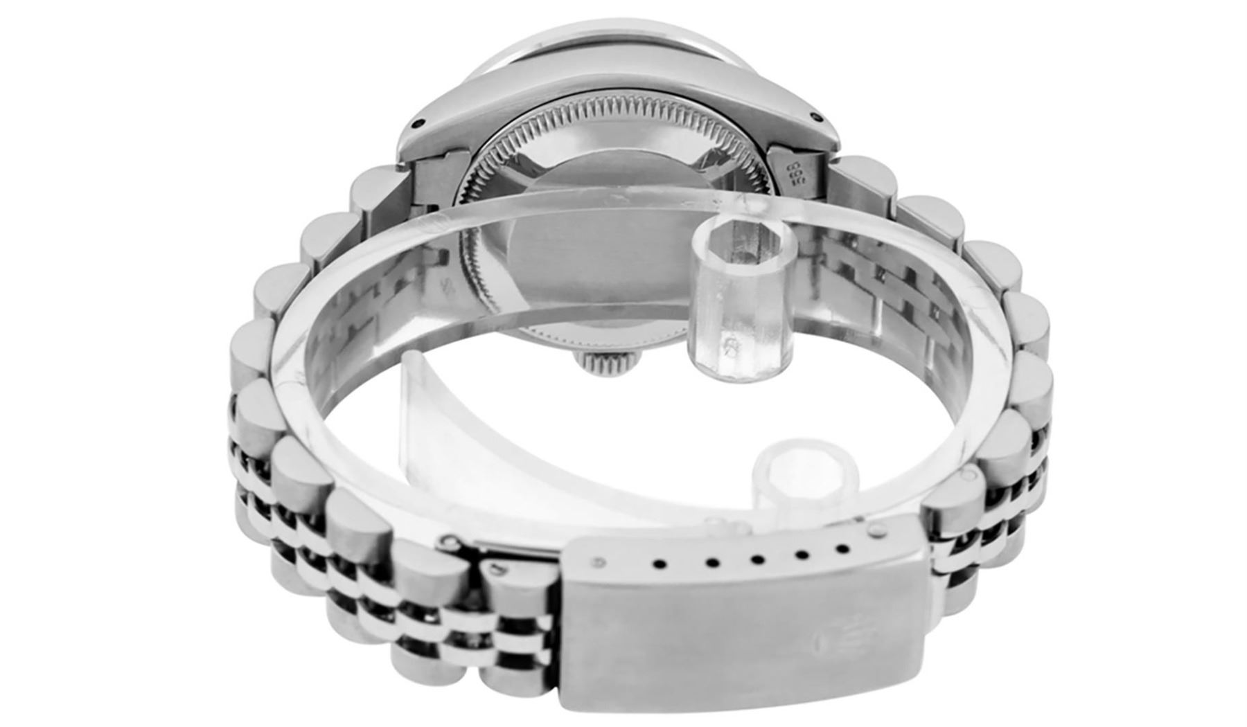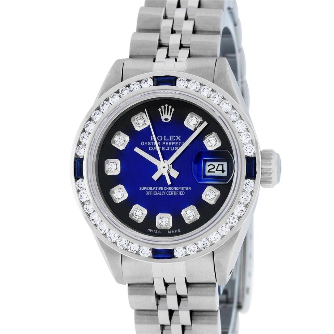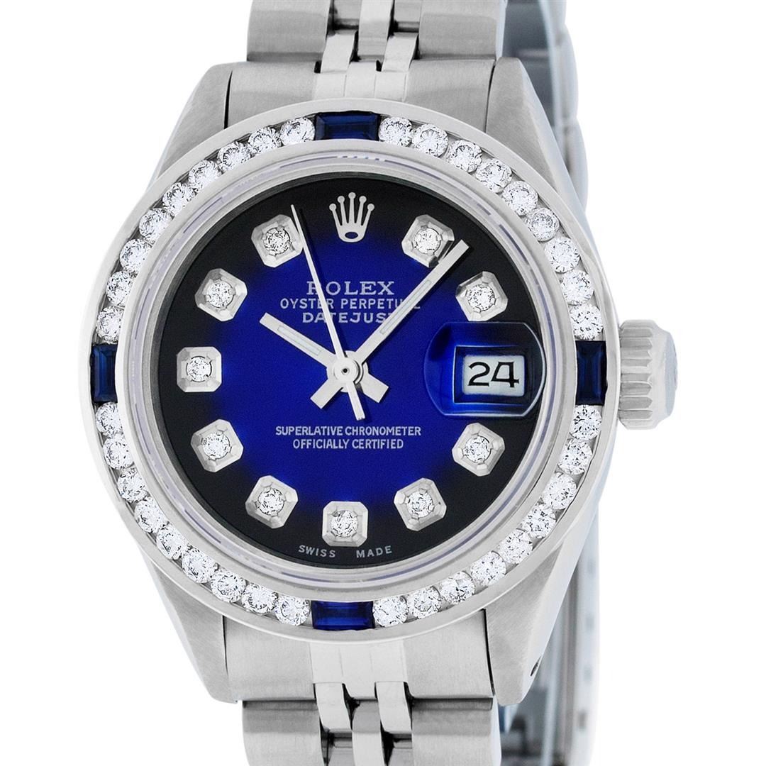 One Ladies Pre Owned Stainless Steel Rolex Datejust Polished Bright with Satin Finish, Serviced & Electronically Tested, Stainless Steel Case: 26mm, Stainless Steel Crown, Custom Bezel: New 18K White Gold Sapphire Channel Set Diamond Bezel, Diamond + Gem Count: 36 Diamonds + 4 Sapphires Total Weight 1.00 Carat, Clarity: SI-VS, Color: G to H. Custom Crystal: New Sapphire With Date Window. Custom Hands: New Luminescent Hands. Rolex Movement: Automatic Winding Movement. Custom Dial: Refinished To Blue Vignette With Custom Added Diamond Hour Markers. Date Window: 3 O'Clock Position Date Display, Model: Datejust. Condition: G-6 Extra Fine. Rolex Bracelet: Stainless Steel Jubilee Band. Bright Polish & Satin Finish. 6.0 Inch Length, Adjustable. Standard Clasp, With Rolex Logo. This Watch Has Been Serviced Time Tested And Is In Excellent Condition It Is Free Of All Scratches And Dents.