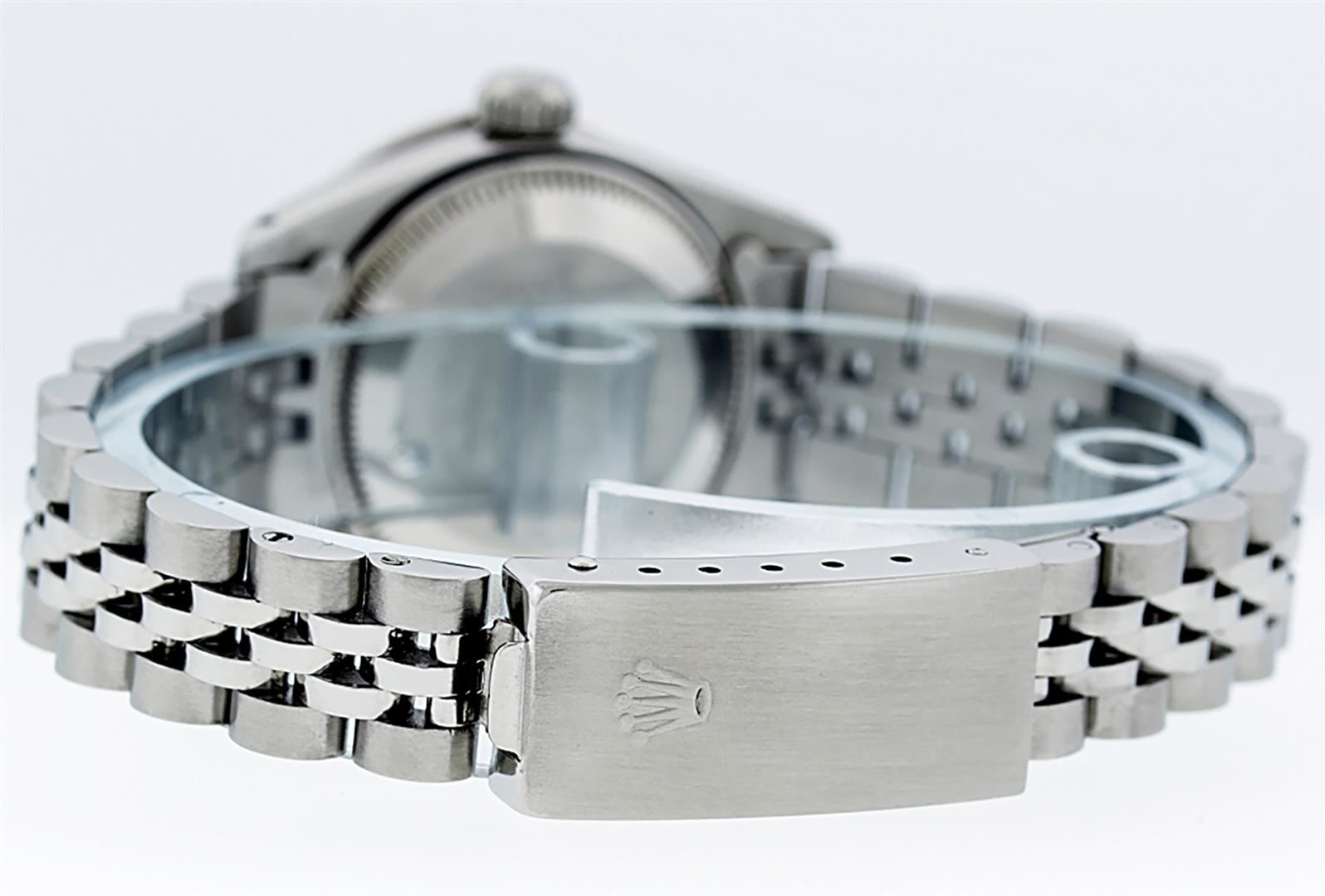 One Ladies Pre Owned Stainless Steel Rolex Datejust Polished Bright with Satin Finish, Serviced & Electronically Tested, Stainless Steel Case: 26mm, Stainless Steel Crown, Custom Bezel: New 18K White Gold Sapphire Beadset Diamond Bezel, Diamond + Gem Count: 28 Diamonds + 4 Sapphires, Clarity: SI-VS, Color: G to H. Custom Crystal: New Sapphire With Date Window. Custom Hands: New Luminescent Hands. Rolex Movement: Automatic Winding Movement. Custom Dial: Refinished To Blue Vignette With Custom Added Diamond Hour Markers. Diamond Count: 10 Diamonds In Dial, Color: G to H, Clarity: SI-VS. Date Window: 3 Oclock Position Date Display, Model: Datejust. Condition: G-6 Extra Fine. Rolex Bracelet: Stainless Steel Jubilee. Bright Polish & Satin Finish. 6.0 Inch Length, Adjustable. Standard Clasp, With Rolex Logo. This Watch Has Been Serviced Time Tested And Is In Excellent Condition It Is Free Of All Scratches And Dents.