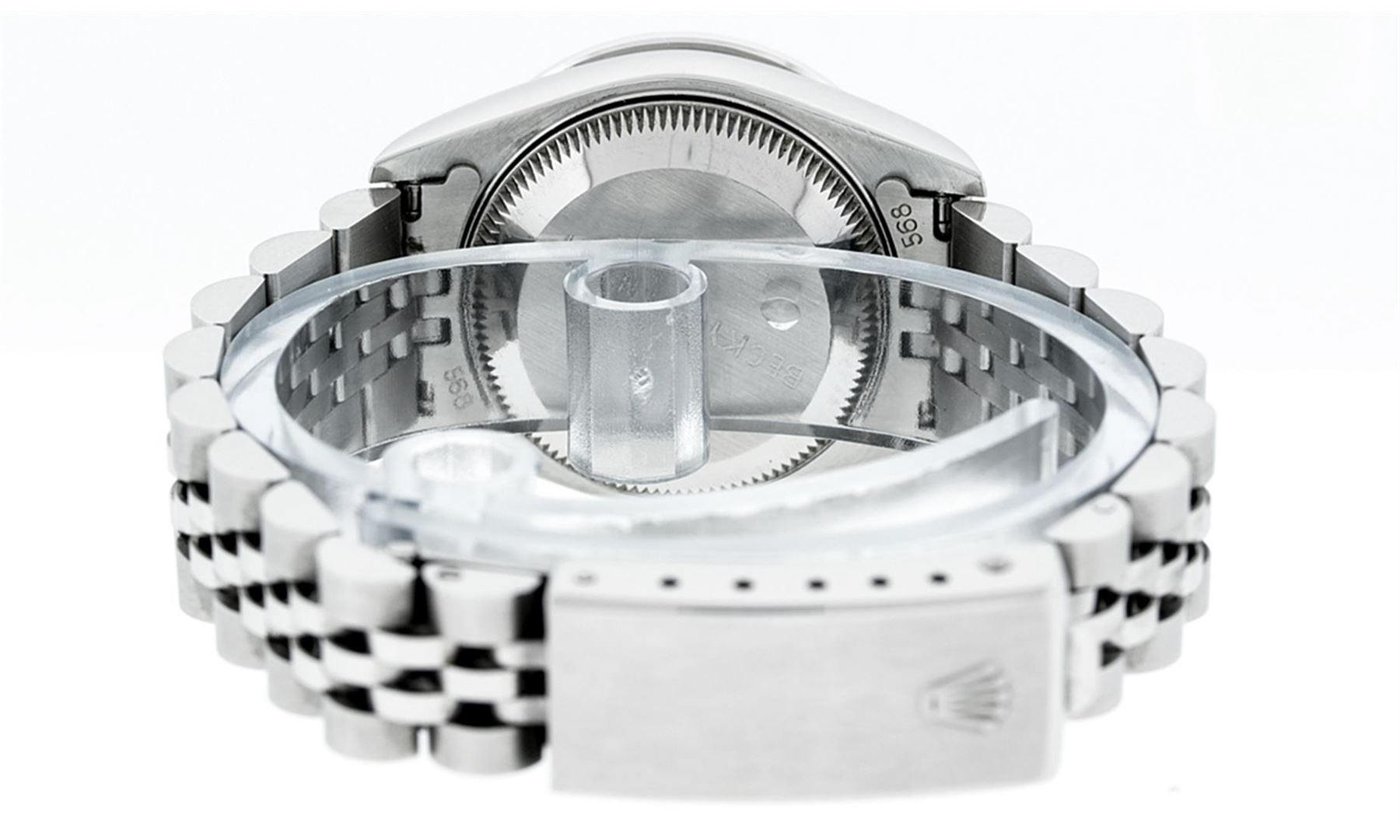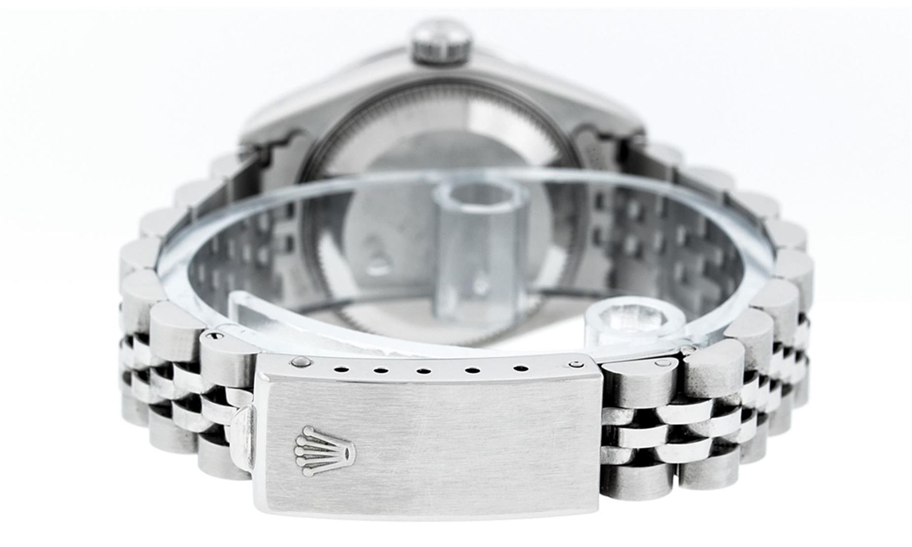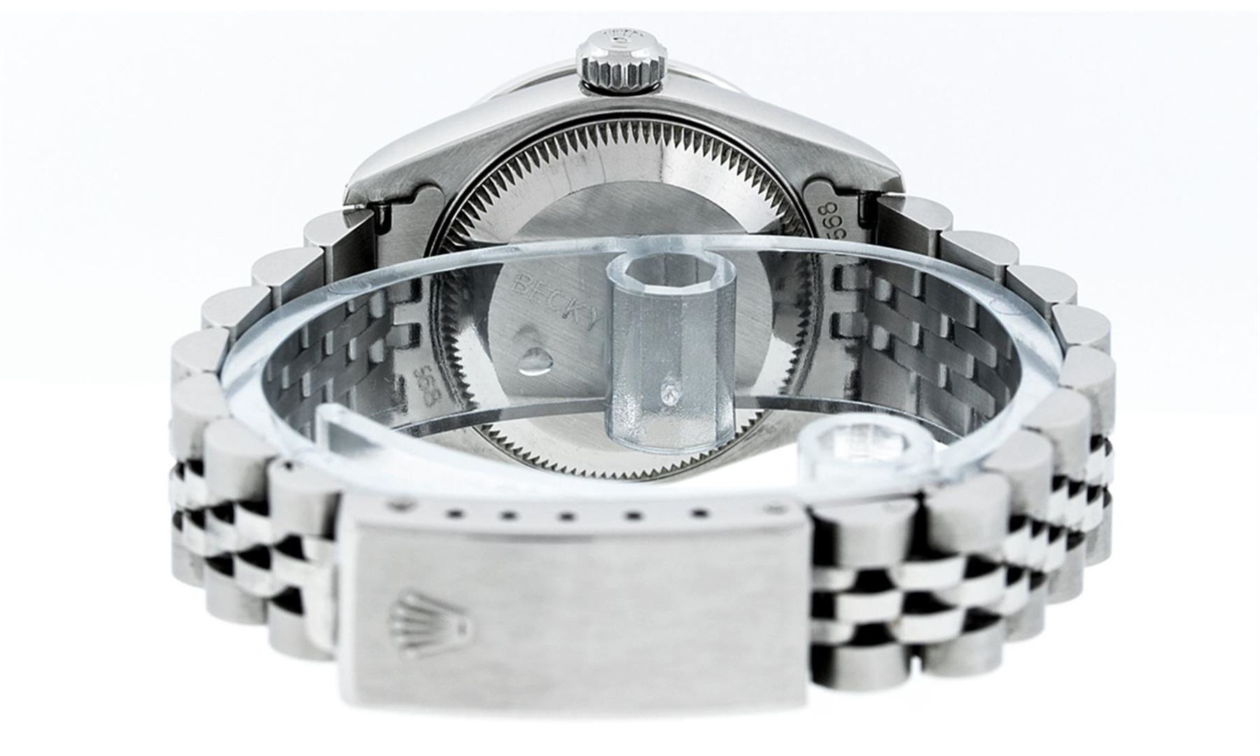 One Ladies Pre Owned Quickset Stainless Steel Rolex Datejust Polished Bright with Satin Finish, Serviced & Electronically Tested, Rolex Stainless Steel Case: 26mm, Rolex Stainless Steel Crown, Rolex Bezel: 18K White Gold Fluted Bezel. Custom Crystal: New