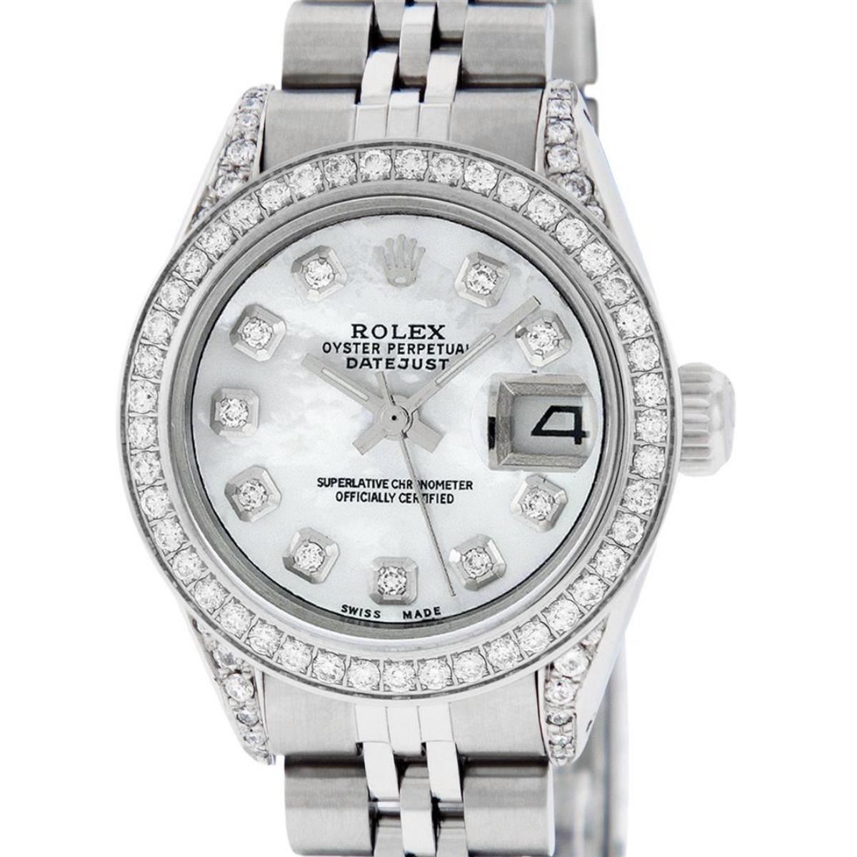 One Ladies Stainless Steel Rolex Datejust Polished Bright with Satin Finish, Serviced & Electronically Tested, Stainless Steel Case: 26mm, Stainless Steel Crown, Diamond Lugs: 24 Diamonds On Lugs, Clarity: SI-VS, Color: G to H. Custom Bezel: New Stainless Steel Beadset Bezel, Diamond Count: 39 Diamonds, Total Weight .70 Carat, Clarity: SI-VS, Color: G to H. Custom Crystal: New Scratch Resistant Synthetic Sapphire Cyclops Lens. Custom Hands: New Luminescent Hands. Movement: Automatic Winding Movement . Custom Dial: Mother Of Pearl Diamond Dial, 10 Diamonds in Dial G To H In Color, Clarity: VS. Date Window: 3 O'Clock Position Date Display, Model: Datejust Condition: G-6 Extra Fine. Bracelet: Stainless Steel Jubilee Band. Bright Polish & Satin Finish. 6.0 Inch Length, Adjustable. Standard Clasp, With Rolex Logo. This Watch Has Been Serviced Time Tested And Is In Excellent Condition It Is Free Of All Scratches And Dents.
