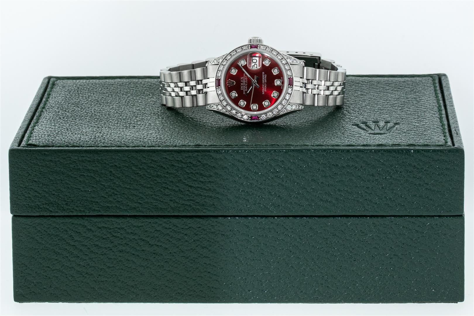 One Ladies Stainless Steel Rolex Datejust Polished Bright with Satin Finish, Serviced & Electronically Tested, Stainless Steel Case: 26mm, Stainless Steel Crown, Diamond Lugs: 24 Diamonds On Lugs, Clarity: SI-VS, Color: G to H. Custom Bezel: New 18K White Gold Diamond & Ruby Beadset Bezel, Diamond Count: 28 Diamonds + 4 Rubies, Total Weight .70 Carat, Clarity: SI-VS, Color: G to H. Custom Crystal: New Scratch Resistant Synthetic Sapphire Cyclops Lens. Custom Hands: New Luminescent Hands. Movement: Automatic Winding Movement. Custom Dial: Refinished Red Diamond Dial, Diamond Count: 10 Diamonds in Dial, G To H In Color, Clarity: SI-VS. Date Window: 3 O'Clock Position Date Display, Model: Datejust Condition: G-6 Extra Fine. Bracelet: Stainless Steel Jubilee. Bright Polish & Satin Finish. 6.0 Inch Length, Adjustable. Standard Clasp, With Rolex Logo. This Watch Has Been Serviced Time Tested And Is In Excellent Condition It Is Free Of All Scratches And Dents. This Watch Comes With A Rolex box.