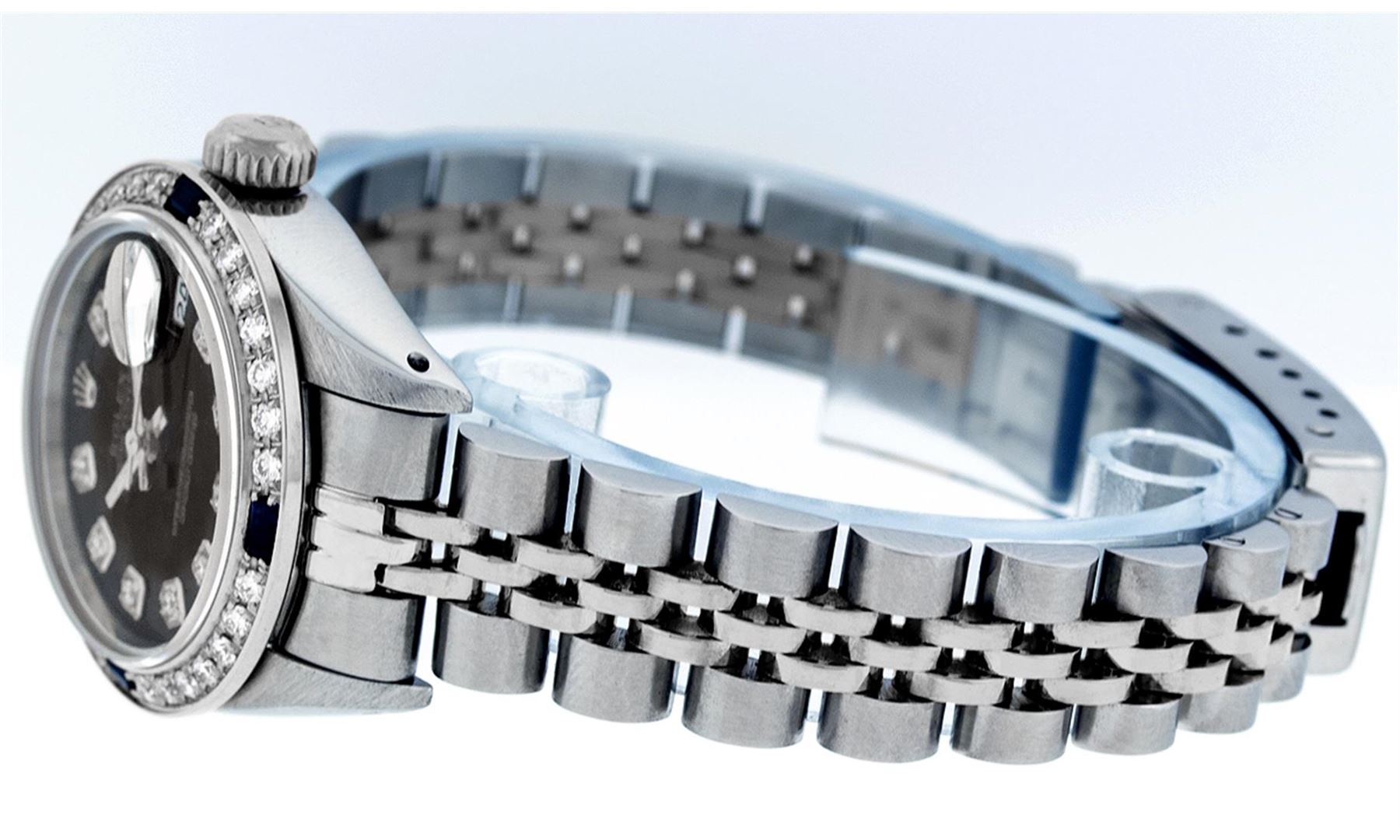 One Ladies Rolex Datejust Polished Bright with Satin Finish, Serviced & Electronically Tested, Stainless Steel Case:26mm, Stainless Steel Crown, Custom Bezel: 18K White Gold Sapphire Beadset Diamond Bezel, Diamond Count: 28 Diamonds + 4 Sapphires Total Weight .70 Carat, Clarity: SI-VS, Color: G to H. Custom Crystal: Synthetic Sapphire Cyclops Lens. Movement: Automatic Winding Movement Caliber 2030. Custom Dial: Black Dial with Diamond Hour Markers. Diamond Count: 10 Diamonds In Dial. Clarity: SI-VS, Color: G to H. Date Window: 3 O'Clock Position Date Display, Model: Datejust. Condition: G-6 Extra Fine. Bracelet: Stainless Steel Jubilee Band. Bright Polish & Satin Finish. 6.0 Inch Length, Adjustable. Standard Clasp, With Rolex Logo.