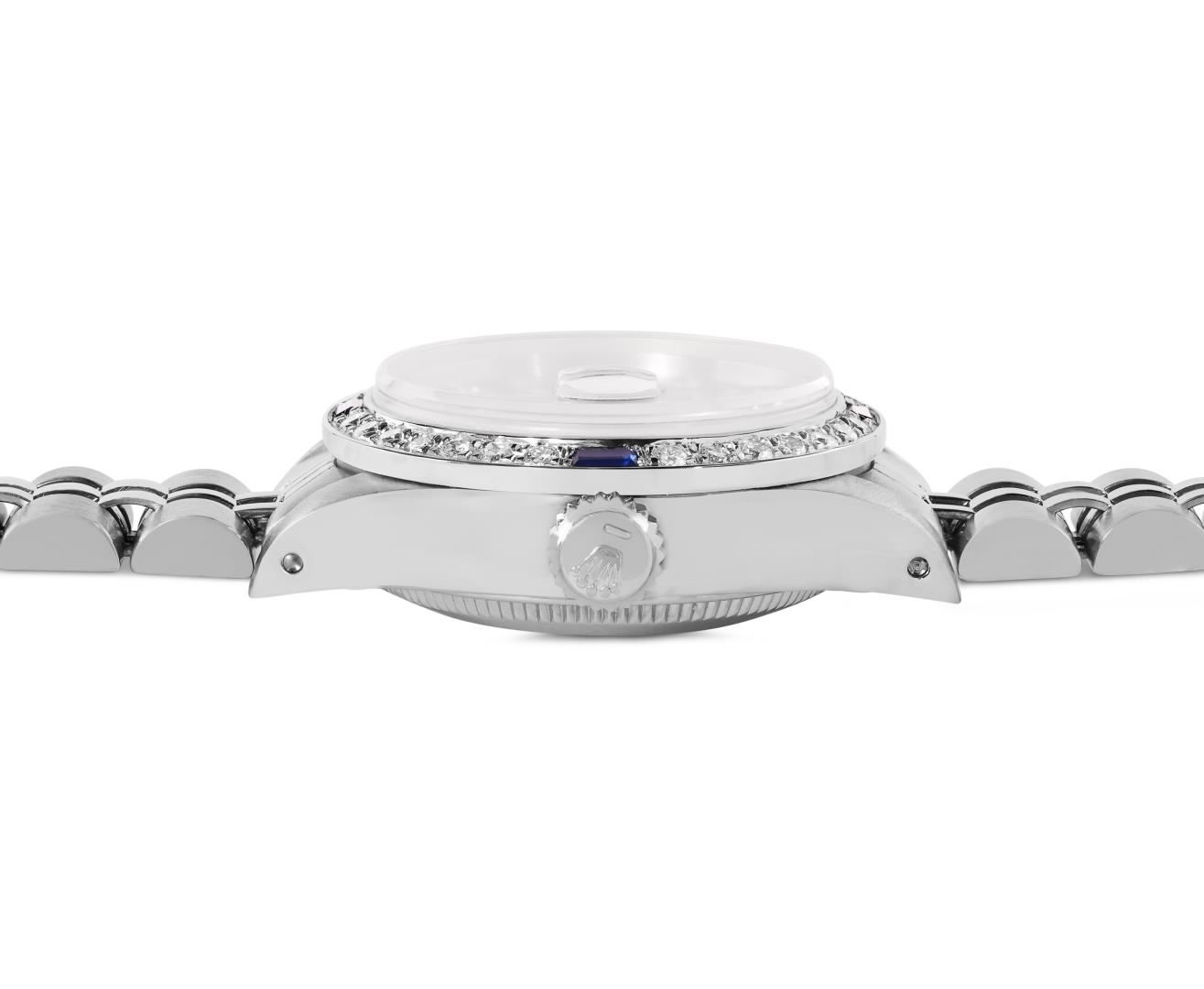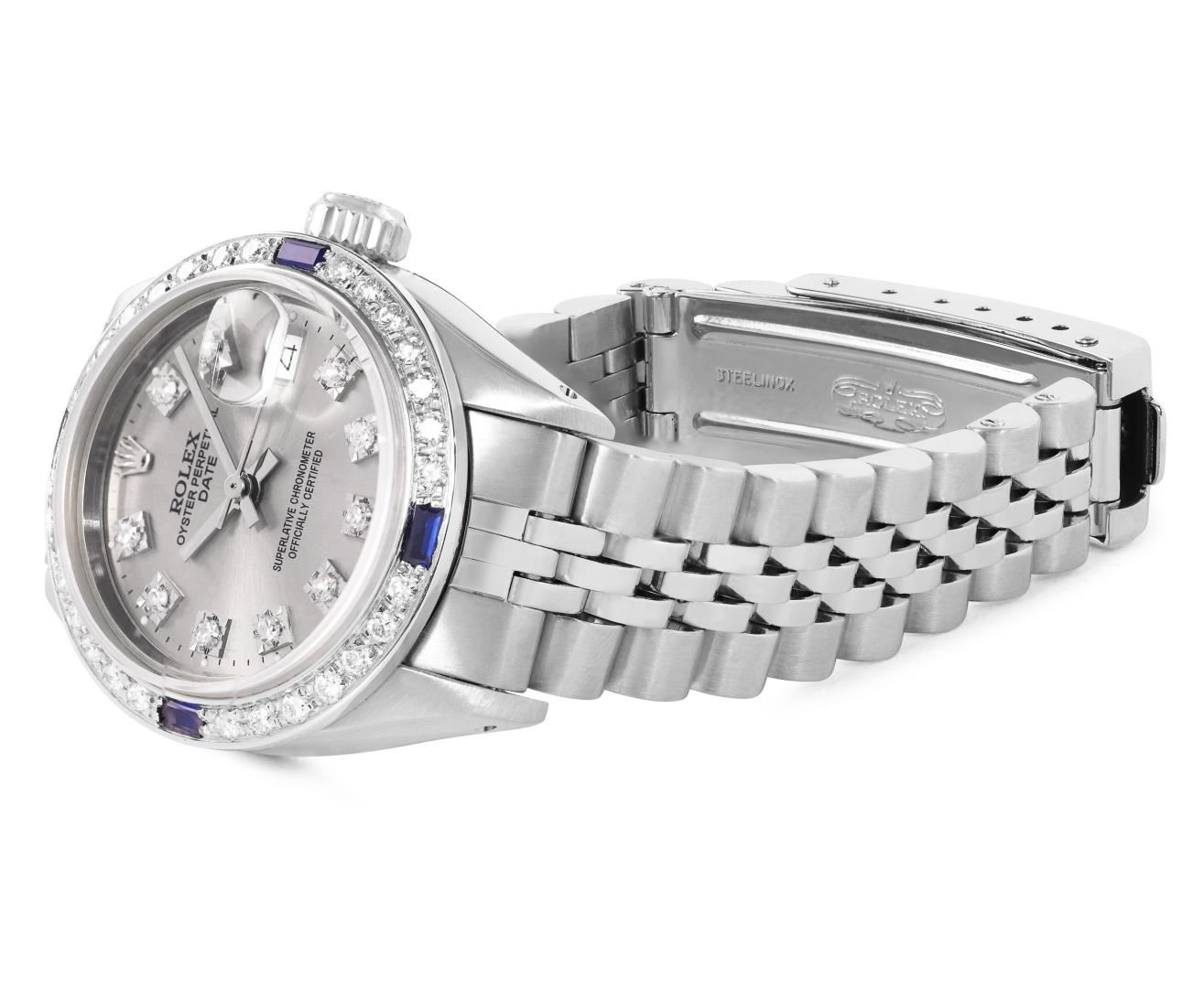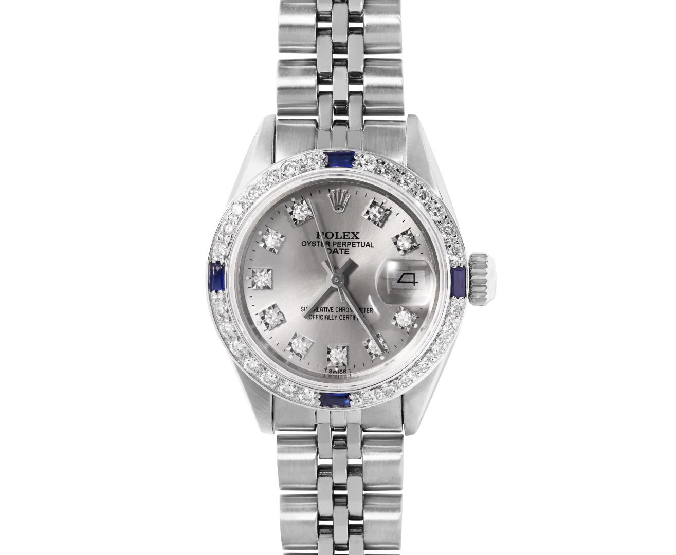 One Rolex Ladies Pre Owned Stainless Steel Date Wristwatch Polished Bright with Satin Finish, Serviced and Electronically Tested, Stainless Steel Case: 26mm, Stainless Steel Crown, Custom Bezel: New 18K White Gold Sapphire Beadset Diamond Bezel, Diamond + Gem Count: 36 Diamonds + 4 Sapphires. Custom Crystal: New Sapphire With Magnified Date Window. Rolex Movement: Automatic Winding Movement 2035. Custom Dial: Custom Gray Dial With Added Diamond Hour Markers, Dash Tracks, And Lumi Dots. Date Window: 3 O'Clock Position Date Display, Model: Date. Condition: G-6 Extra Fine. Rolex Bracelet: Stainless Steel Jubilee Band. Bright Polish and Satin Finish. 6.0 Inch Length, Adjustable. Standard Clasp, With Rolex Logo. This Watch Has Been Serviced Time Tested And Is In Excellent Condition. It Is Free Of All Scratches And Dents.