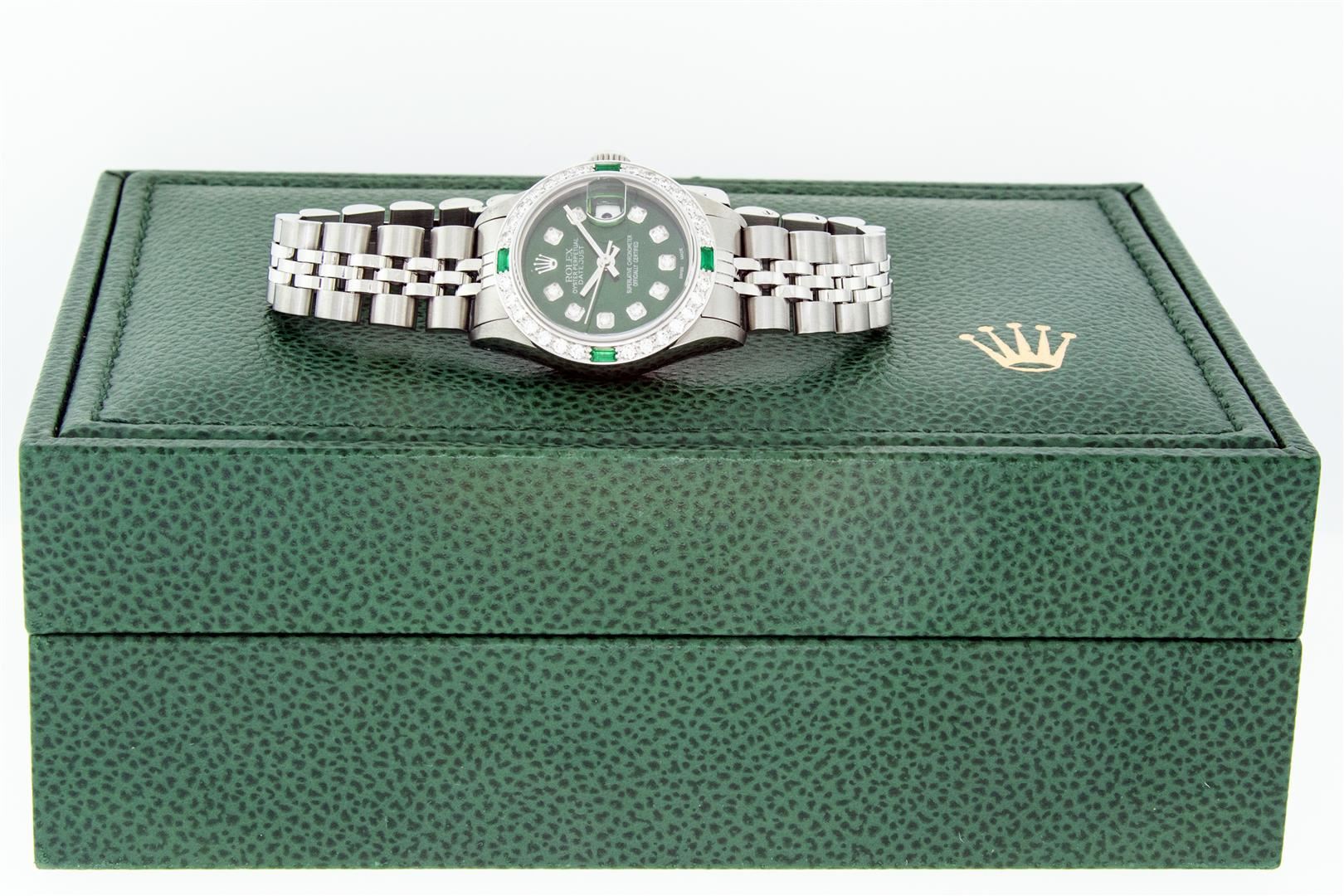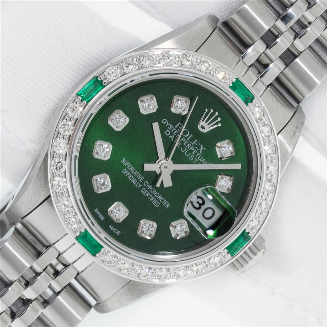 One Ladies Stainless Steel Rolex Datejust Polished Bright with Satin Finish, Serviced & Electronically Tested, Stainless Steel Case: 26mm, Stainless Steel Crown, Custom Bezel: New 18K White Gold Emerald Beadset Diamond Bezel, Diamond + Gem Count: 28 Diamonds + 4 Emeralds. Total Weight .70 Carat, Clarity: SI-VS, Color: G to H. Custom Crystal: New Scratch Resistant Synthetic Sapphire Cyclops Lens. Custom Hands: New Luminescent Hands. Movement: Automatic Winding Movement. Custom Dial: Refinished Green With Diamond Hour Markers, 10 Diamond in Dial G To H In Color, Clarity: SI-VS. Date Window: 3 O'Clock Position Date Display, Model: Datejust. Condition: G-6 Extra Fine. Bracelet: Stainless Steel Jubilee Band. Bright Polish & Satin Finish. 6.0 Inch Length, Adjustable. Standard Clasp, With Rolex Logo. This Watch Has Been Serviced Time Tested And Is In Excellent Condition It Is Free Of All Scratches And Dents. This Watch Comes With A Rolex Box.