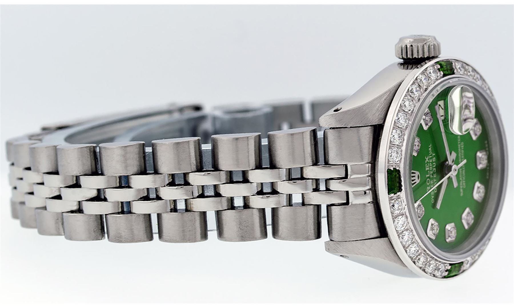 One Ladies Stainless Steel Rolex Datejust Polished Bright with Satin Finish, Serviced & Electronically Tested, Stainless Steel Case: 26mm, Stainless Steel Crown, Custom Bezel: New 18K White Gold Emerald Beadset Diamond Bezel, Diamond + Gem Count: 28 Diamonds + 4 Emeralds. Total Weight .70 Carat, Clarity: SI-VS, Color: G to H. Custom Crystal: New Scratch Resistant Synthetic Sapphire Cyclops Lens. Custom Hands: New Luminescent Hands. Movement: Automatic Winding Movement. Custom Dial: Refinished Green With Diamond Hour Markers, 10 Diamond in Dial G To H In Color, Clarity: SI-VS. Date Window: 3 O'Clock Position Date Display, Model: Datejust. Condition: G-6 Extra Fine. Bracelet: Stainless Steel Jubilee Band. Bright Polish & Satin Finish. 6.0 Inch Length, Adjustable. Standard Clasp, With Rolex Logo. This Watch Has Been Serviced Time Tested And Is In Excellent Condition It Is Free Of All Scratches And Dents.