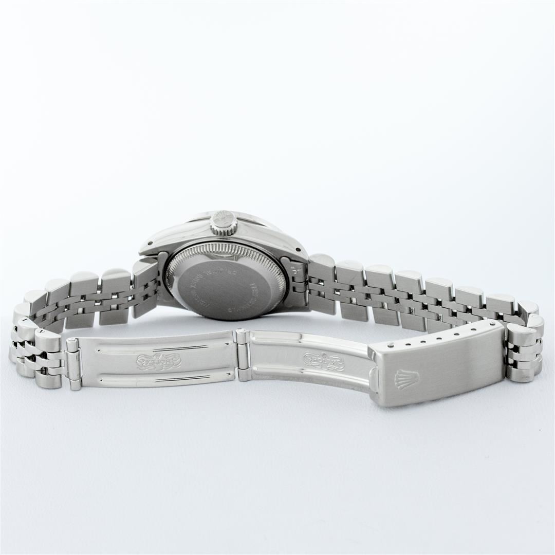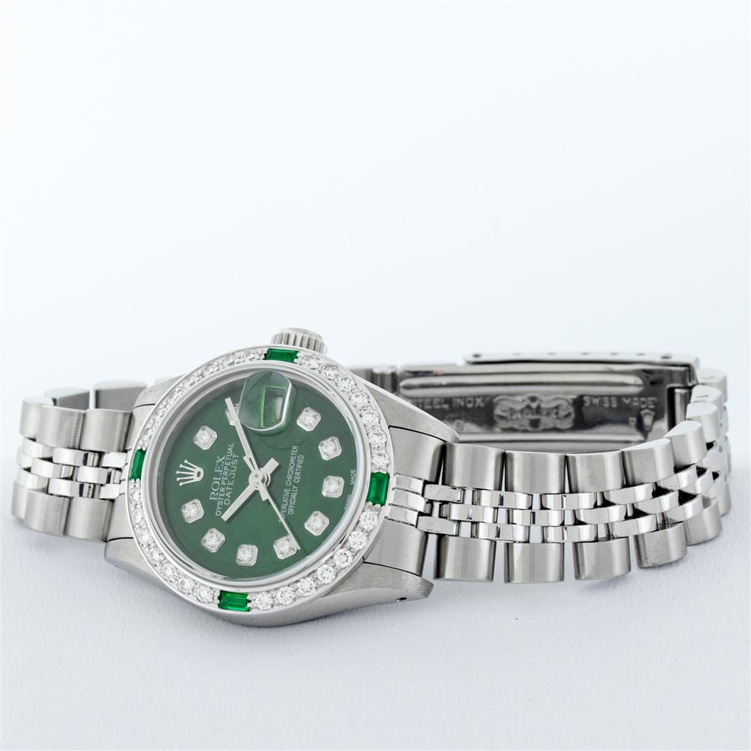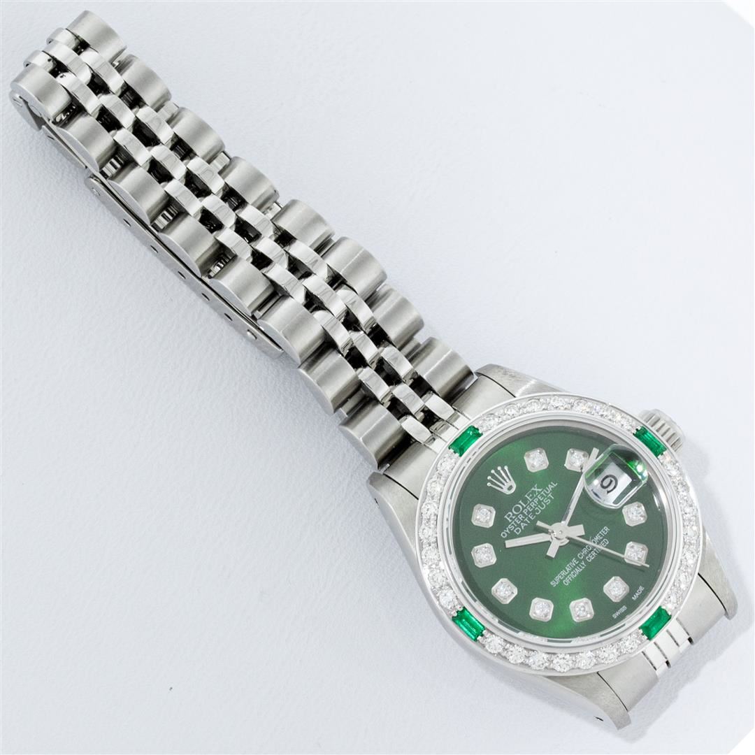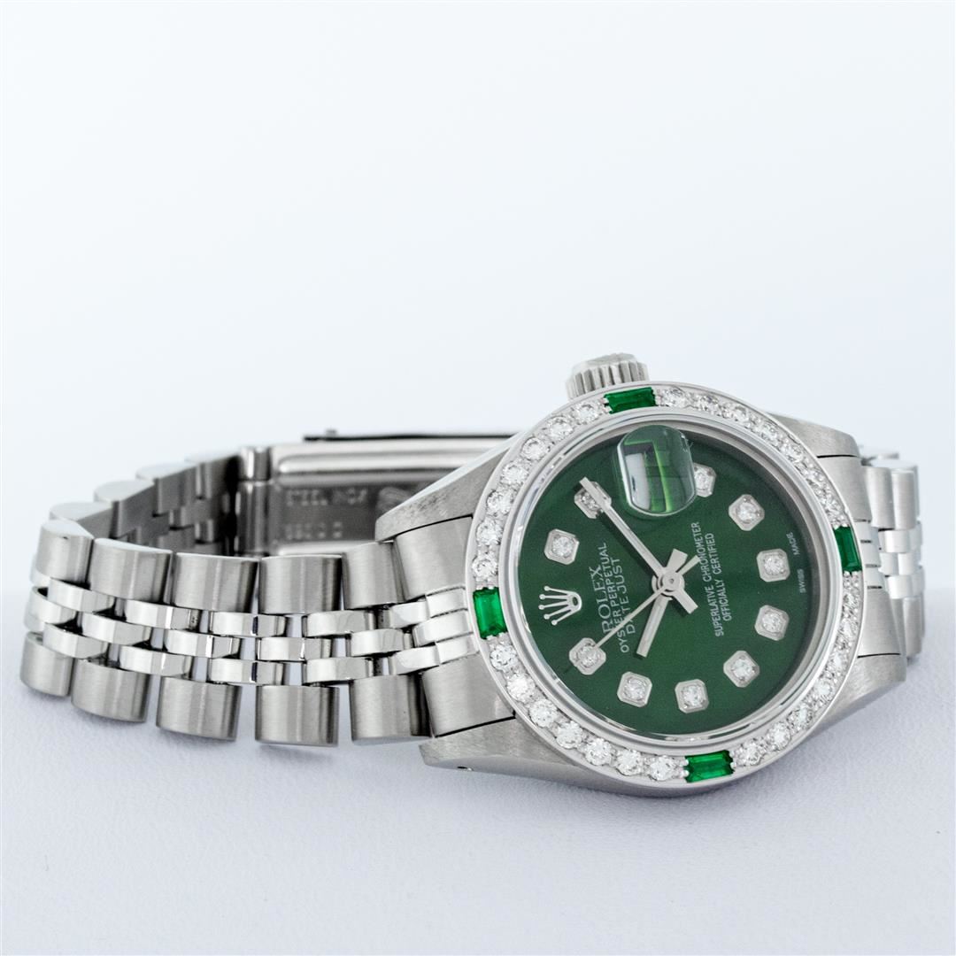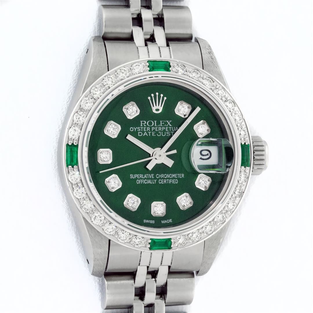 One Ladies Stainless Steel Rolex Datejust Polished Bright with Satin Finish, Serviced & Electronically Tested, Stainless Steel Case: 26mm, Stainless Steel Crown, Custom Bezel: New 18K White Gold Emerald Beadset Diamond Bezel, Diamond + Gem Count: 28 Diamonds + 4 Emeralds. Total Weight .70 Carat, Clarity: SI-VS, Color: G to H. Custom Crystal: New Scratch Resistant Synthetic Sapphire Cyclops Lens. Custom Hands: New Luminescent Hands. Movement: Automatic Winding Movement. Custom Dial: Refinished Green With Diamond Hour Markers, 10 Diamond in Dial G To H In Color, Clarity: SI-VS. Date Window: 3 O'Clock Position Date Display, Model: Datejust. Condition: G-6 Extra Fine. Bracelet: Stainless Steel Jubilee Band. Bright Polish & Satin Finish. 6.0 Inch Length, Adjustable. Standard Clasp, With Rolex Logo. This Watch Has Been Serviced Time Tested And Is In Excellent Condition It Is Free Of All Scratches And Dents.