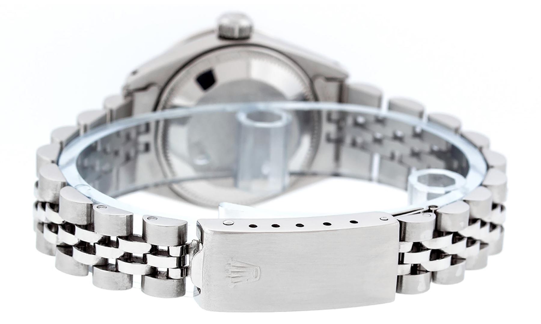 One Ladies Pre Owned Stainless Steel Rolex Datejust Polished Bright with Satin Finish, Serviced & Electronically Tested, Stainless Steel Case: 26mm, Stainless Steel Crown, Custom Bezel: New 18K White Gold Ruby Beadset Diamond Bezel, Diamond + Gem Count: 28 Diamonds + 4 Rubies. Clarity: SI-VS, Color: G to H. Custom Crystal: New Sapphire With Date Window. Custom Hands: New Luminescent Hands. Rolex Movement: Automatic Winding Movement. Custom Dial: Refinished To Green With Custom Added Diamond Hour Markers & Dash Track, 10 Diamonds in Dial, G To H In Color, Clarity: SI-VS. Date Window: 3 Oclock Position Date Display, Model: Datejust. Condition: G-6 Extra Fine. Rolex Bracelet: Stainless Steel Jubilee. Bright Polish & Satin Finish. 6.0 Inch Length, Adjustable. Standard Clasp, With Rolex Logo. This Watch Has Been Serviced Time Tested And Is In Excellent Condition It Is Free Of All Scratches And Dents.